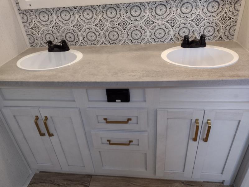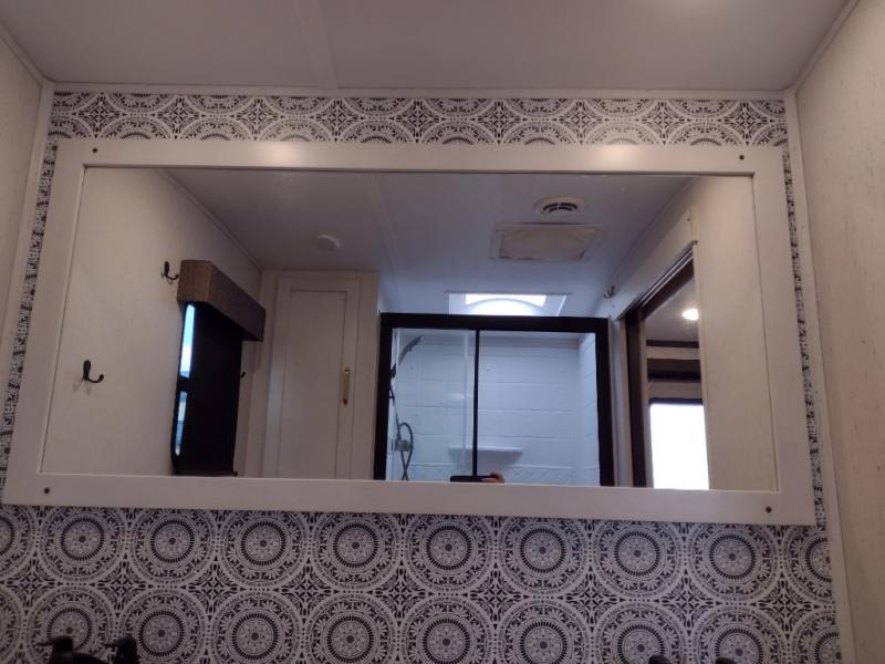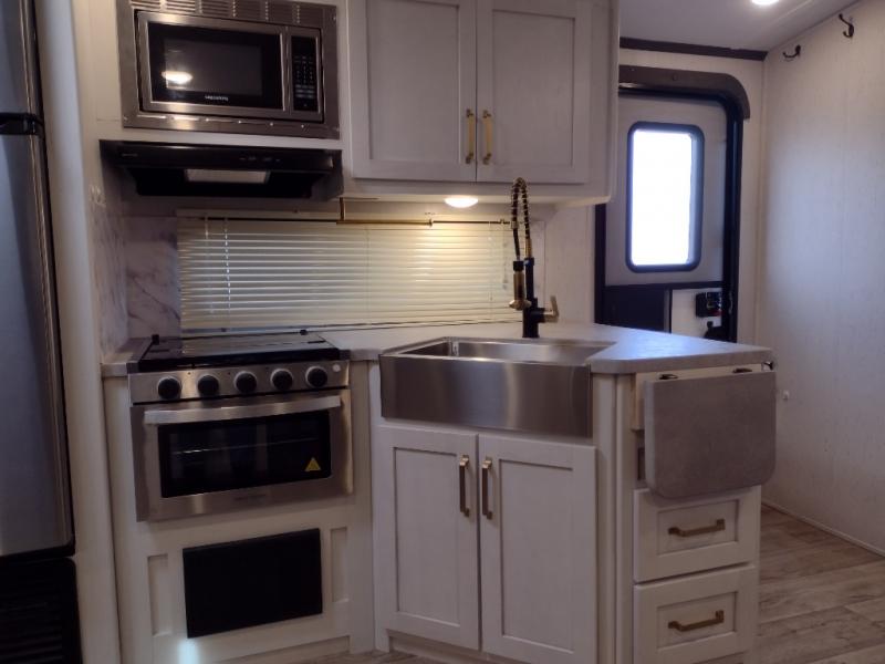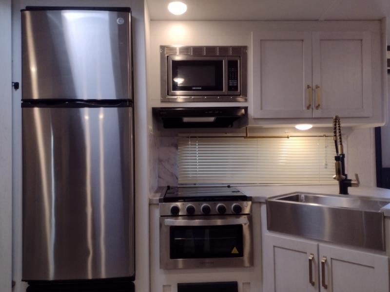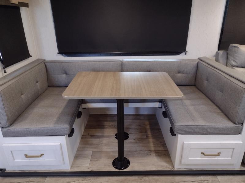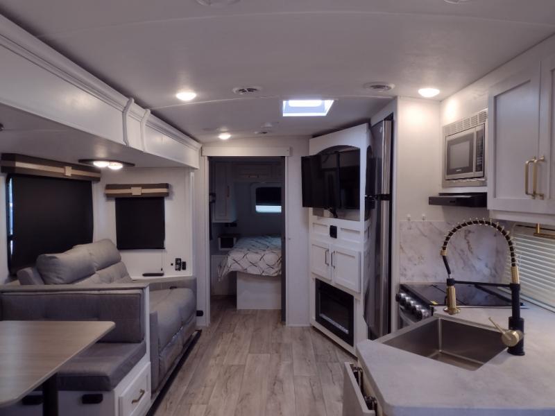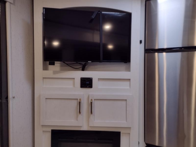 Enjoy relaxing weekends at the campground in this cozy travel trailer for five to six. The large slide will provide a spacious living area, and there is a U-shaped dinette and tri-fold sofa within the slide for seating and sleeping space. The hinged entertainment center hides the pantry, and the fireplace will make it feel more like home. Prepare home cooked meals on the three burner range, or use the microwave oven. You'll find the countertop extension will provide more space to prep meals, and the 10 cu. ft. double door refrigerator can store your perishables for the whole weekend. This model also includes a spacious full rear bath with dual bath sinks so two can get ready at the same time, and you'll love the front private bedroom with a king bed for all-around comfort!