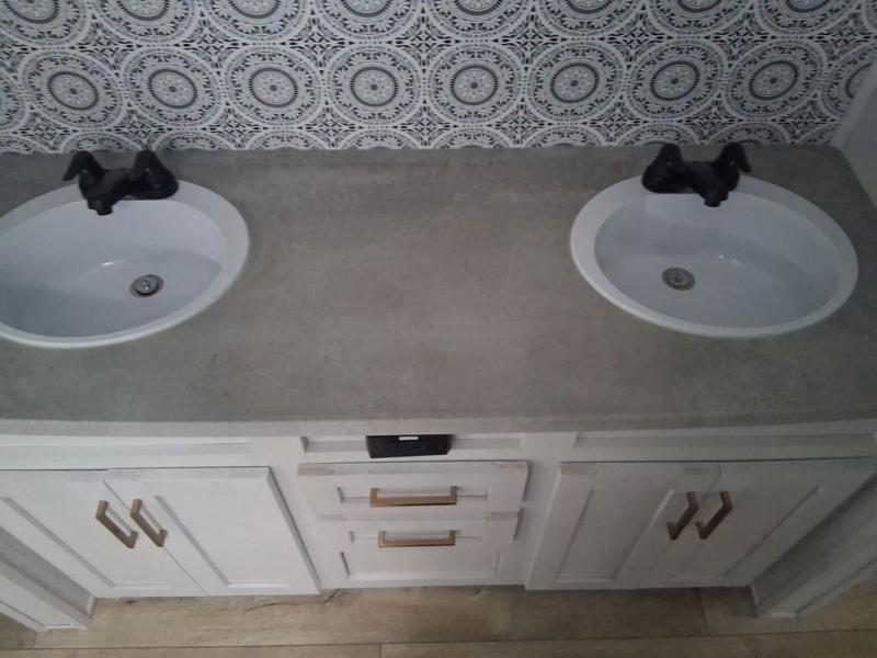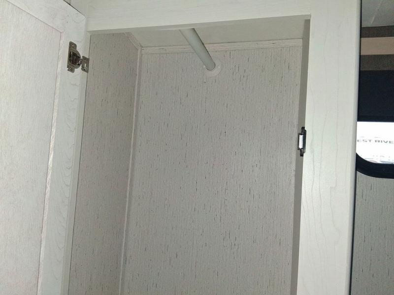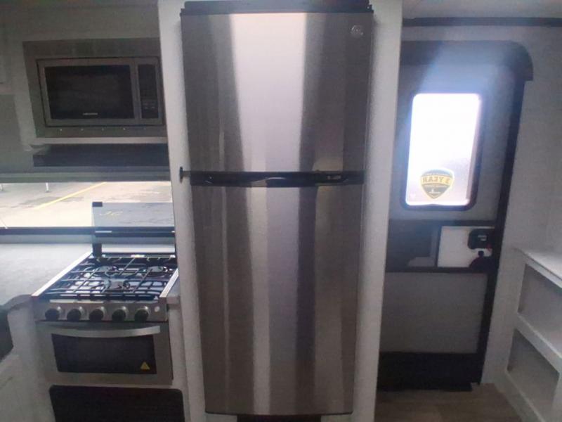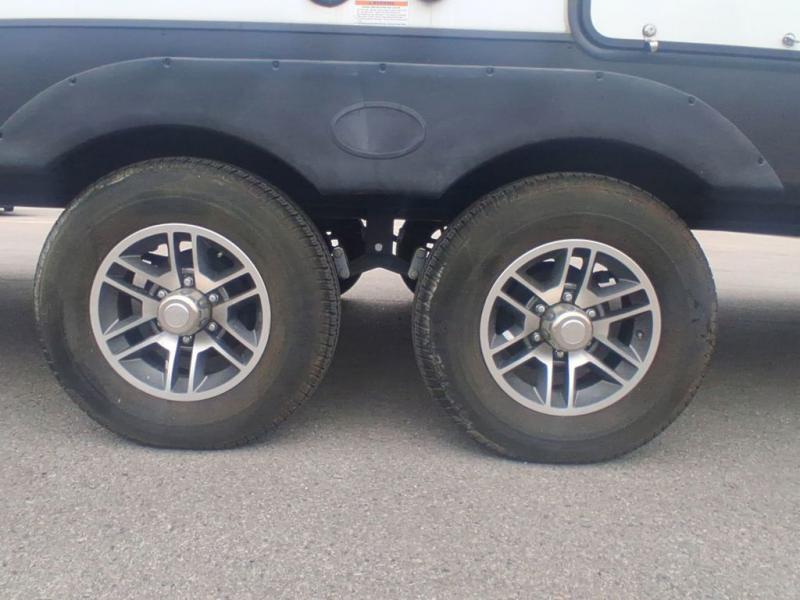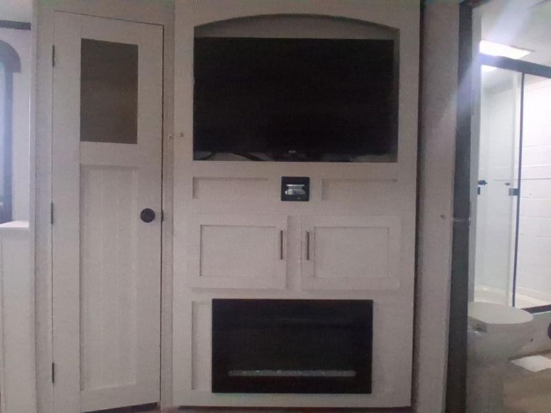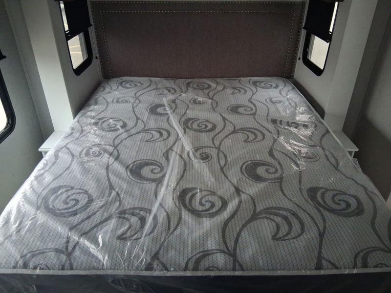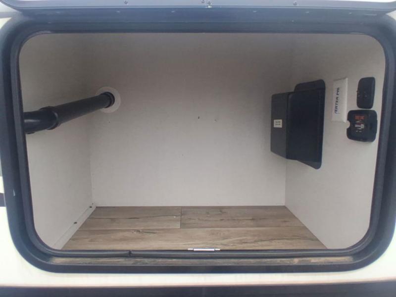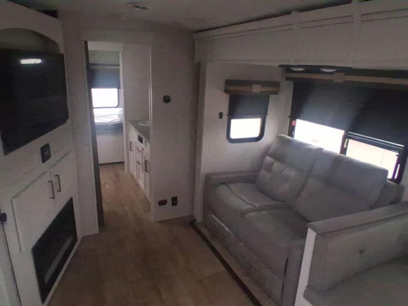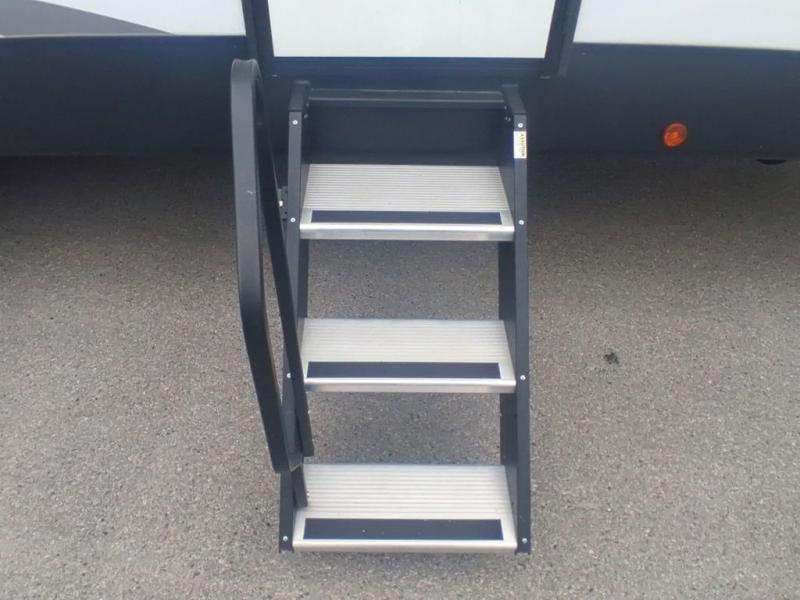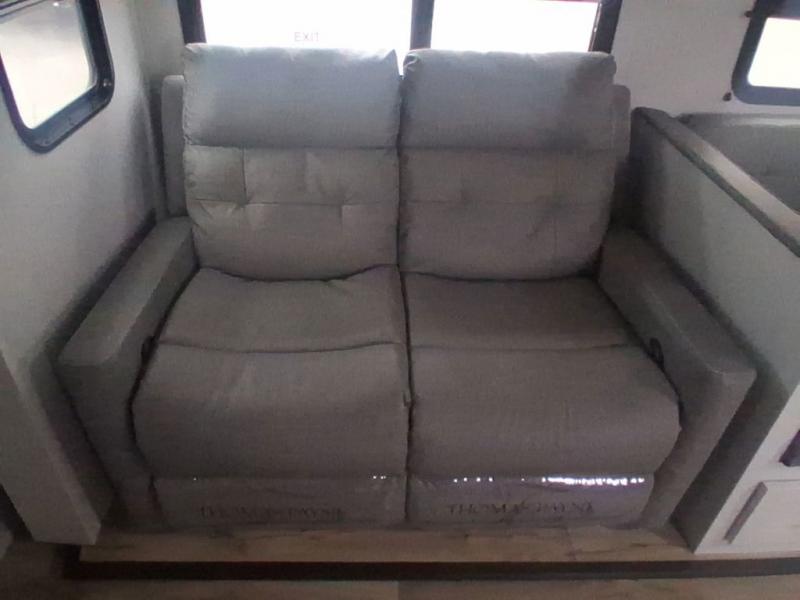You will have everything you need for a comfortable camping trip with this travel trailer! It features a rear private bedroom with a king bed slide for more walking around space and an entrance into the walk-through bathroom which will come in handy at night. The bathroom also has a dual sink vanity for two to get ready at once in the mornings. The front kitchen has plenty of countertop space to prepare your best meals and even a pull out trash can, and you can comfortably enjoy them at the U-shaped dinette, plus it can transform into an extra sleeping space for a guest or two to tag along. What better way to relax at night than on the tri-fold sofa across from the hinged entertainment center!