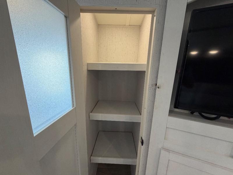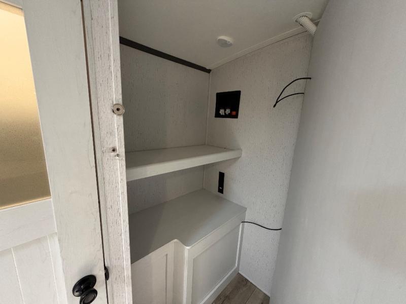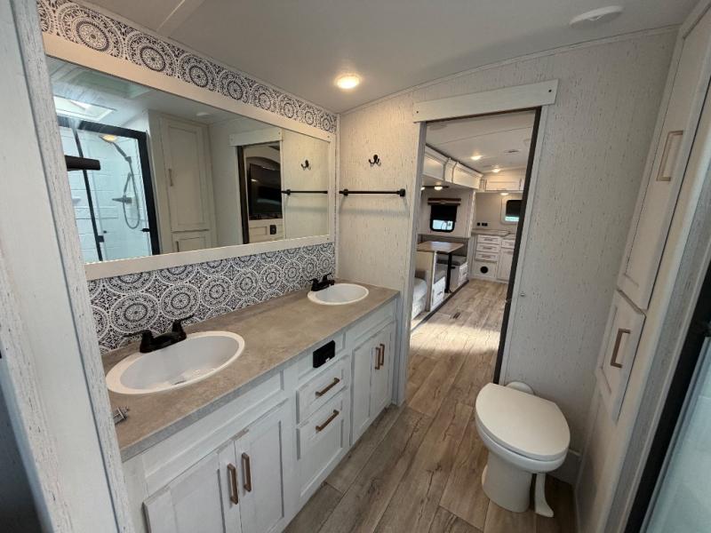 You will have everything you need for a comfortable camping trip with this travel trailer! It features a rear private bedroom with a king bed slide for more walking around space and an entrance into the walk-through bathroom which will come in handy at night. The bathroom also has a dual sink vanity for two to get ready at once in the mornings. The front kitchen has plenty of countertop space to prepare your best meals and even a pull out trash can, and you can comfortably enjoy them at the U-shaped dinette, plus it can transform into an extra sleeping space for a guest or two to tag along. What better way to relax at night than on the tri-fold sofa across from the hinged entertainment center!
