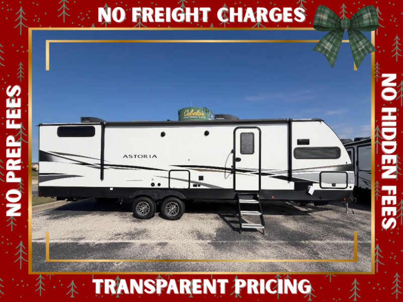 With any Astoria travel trailer, you'll get the Dutchmen construction advantage with features such as HyperDeck floor construction which includes linoleum flooring, vacuum bonded lamination, and a fully enclosed underbelly, plus a fiberglass cap with windshield. Some standard features that will impress you include an exterior spray port to keep the sand outside, arched interior ceiling for more standing space, dual 20 lb. propane tanks, dark-tinted safety glass windows, and stainless steel appliances so you can keep your bellies full with home cooked meals. Plus, an Astoria Premium package for even more convenience and comforts. Choose your favorite today!
