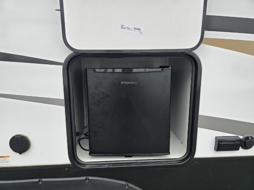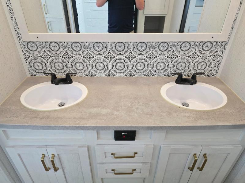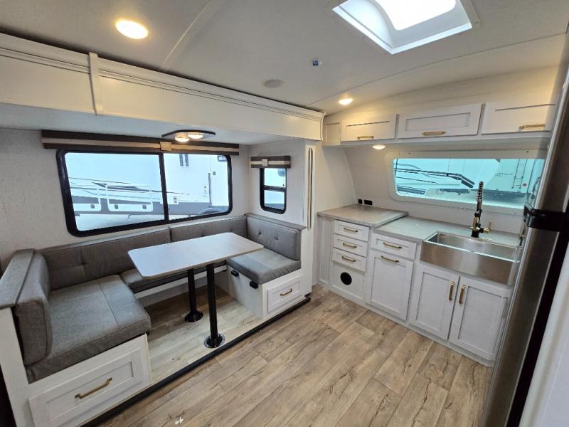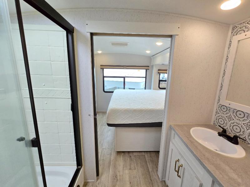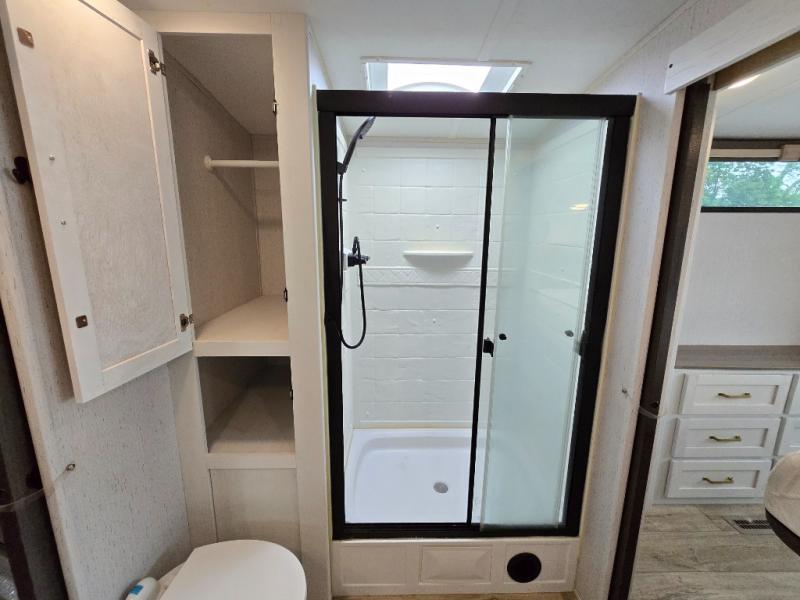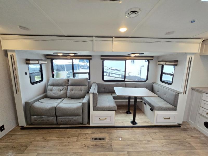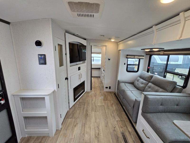 You will have everything you need for a comfortable camping trip with this travel trailer! It features a rear private bedroom with a king bed slide for more walking around space and an entrance into the walk-through bathroom which will come in handy at night. The bathroom also has a dual sink vanity for two to get ready at once in the mornings. The front kitchen has plenty of countertop space to prepare your best meals and even a pull out trash can, and you can comfortably enjoy them at the U-shaped dinette, plus it can transform into an extra sleeping space for a guest or two to tag along. What better way to relax at night than on the tri-fold sofa across from the hinged entertainment center!