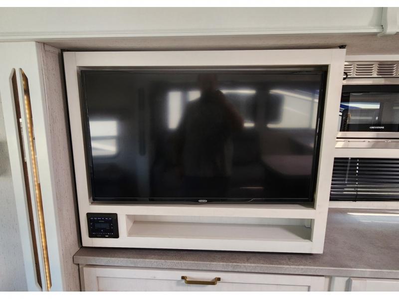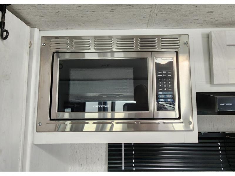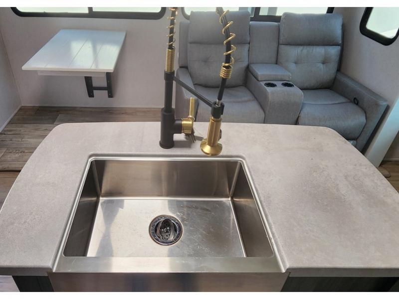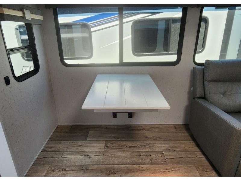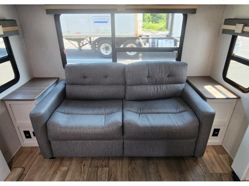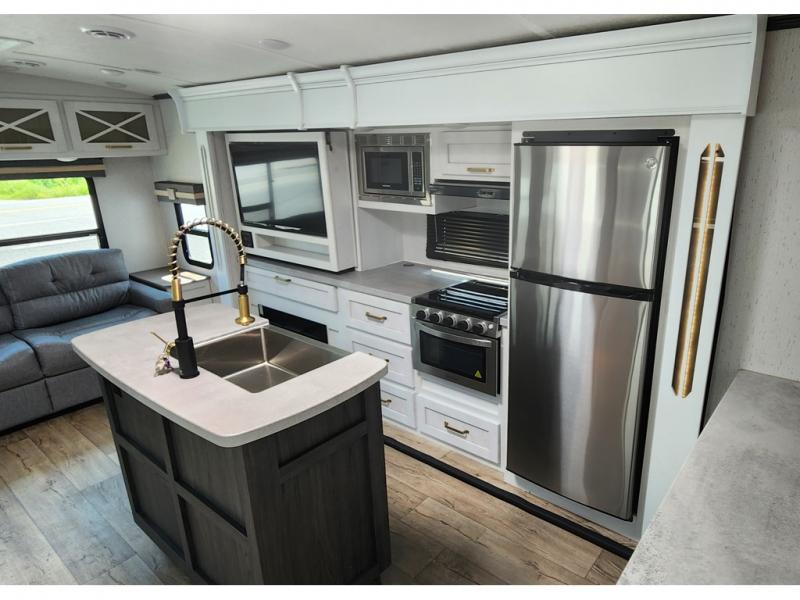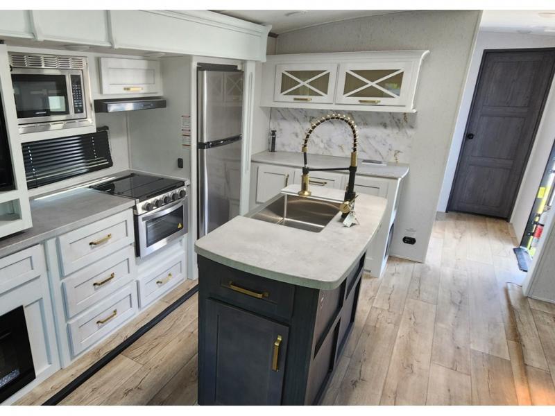 Feel at home the very first time you step into this triple slide Astoria travel trailer. You will love the spacious feel with opposing slides in the main living/kitchen area to the left of the door. A booth dinette and theater seating can be found in the slide along the curbside, and a tri-fold sofa along the rear wall all providing ample seating for your family and friends to enjoy. A kitchen island features a farm-style sink, and the upgraded kitchen also features stainless steel appliances which will provide all that you need for preparing and cooking while you travel. The arched interior ceiling will give this unit a home-like feel, and the large frameless dual pane windows will bring all of your scenic views right inside. Rest easy at night on a comfortable king bed and find ample storage throughout. This all weather unit features an enclosed underbelly which makes full time RVing easy, and part-time travel something that you can do in any season, not just the summer!