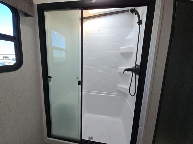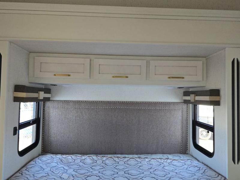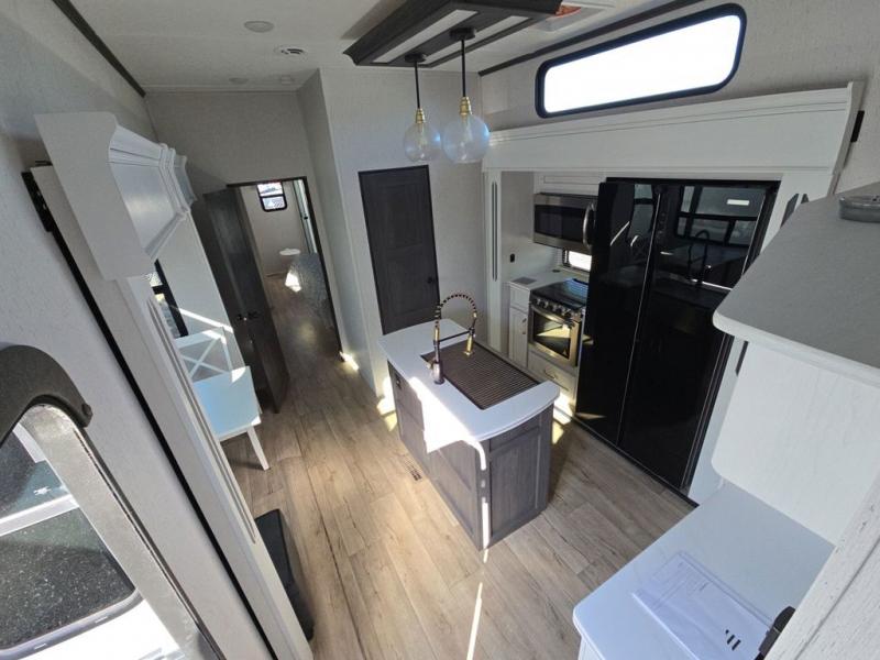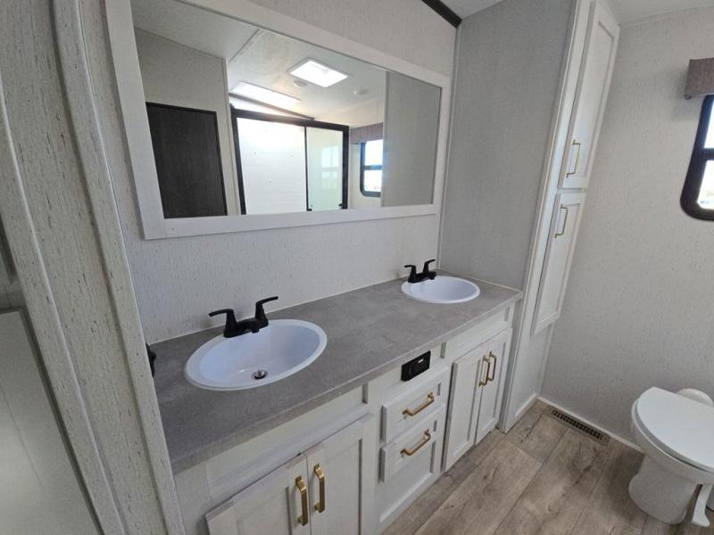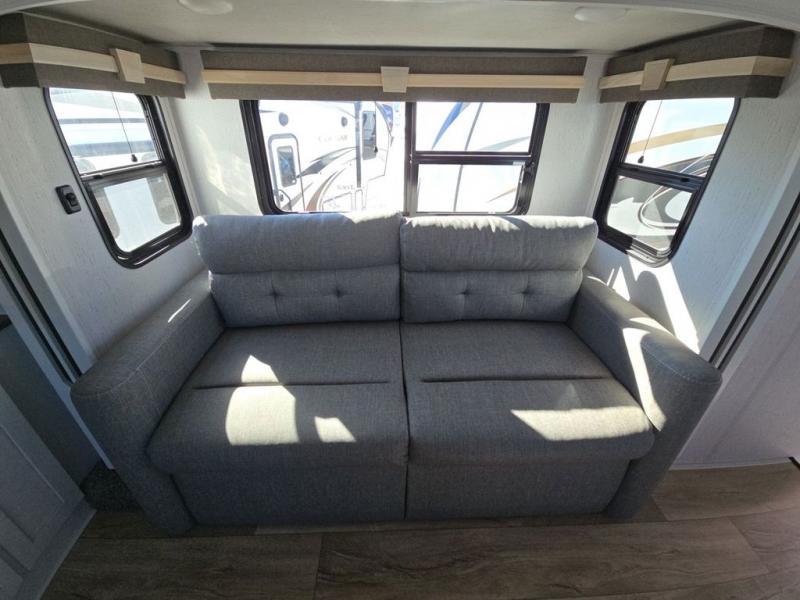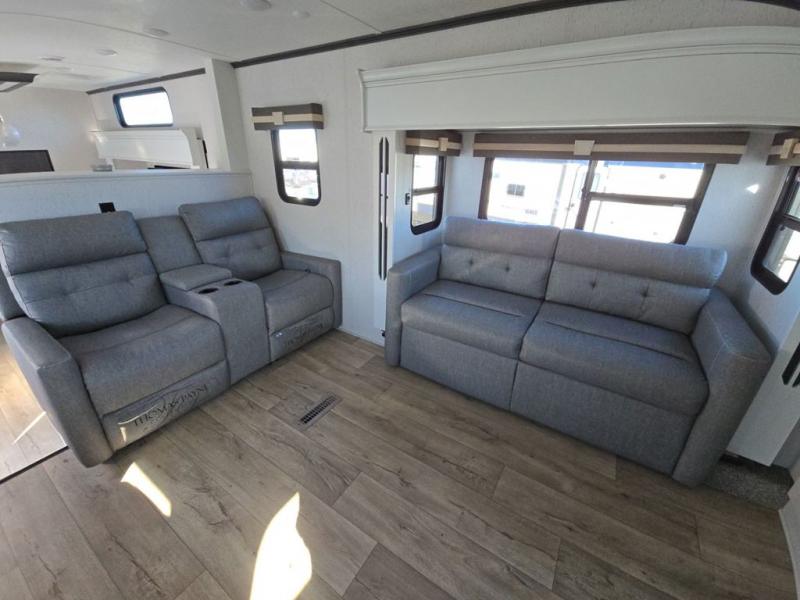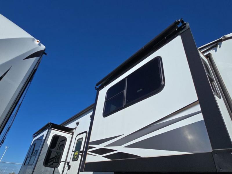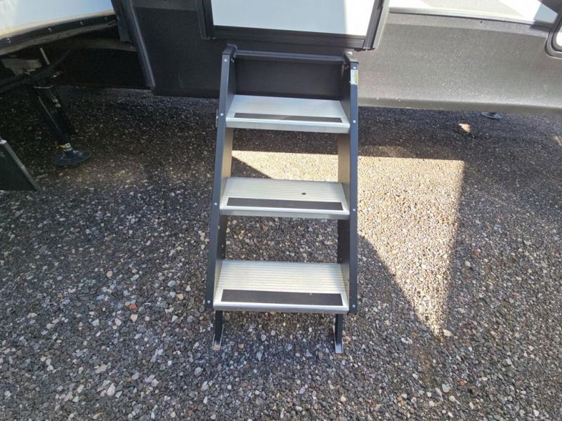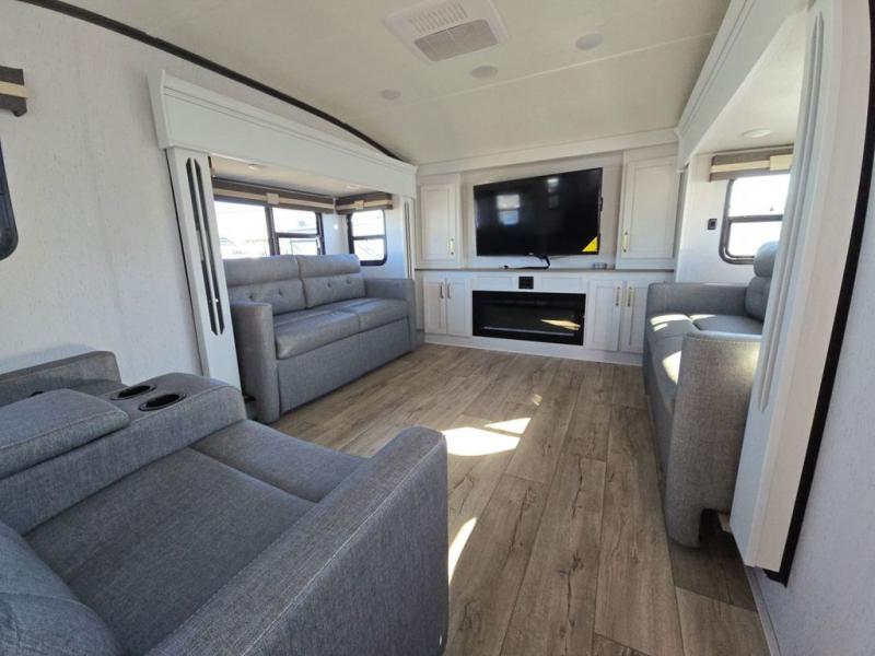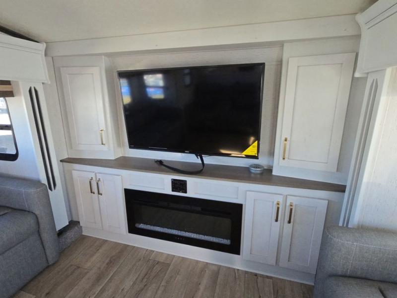 Experience a comfortable camping trip with this fifth wheel! The front living area not only has opposing sofa slides, but also theater seating across from an entertainment center with a 40" glass fireplace and a 50" LED TV. The separate kitchen has everything you will need to prepare delicious home cooked meals including a glass top three burner cooktop with a 21" oven and a kitchen island with a large sink that has a high rise faucet with sprayer for an easy clean up. There is even a half bathroom by the kitchen so you can use it and quickly get back to cooking. The master suite has a king bed slide for more walking around space, an entertainment center for a comfortable movie night, and access to the spacious full rear bathroom with a dual sink vanity, storage and a space prepped for a washer/dryer option.