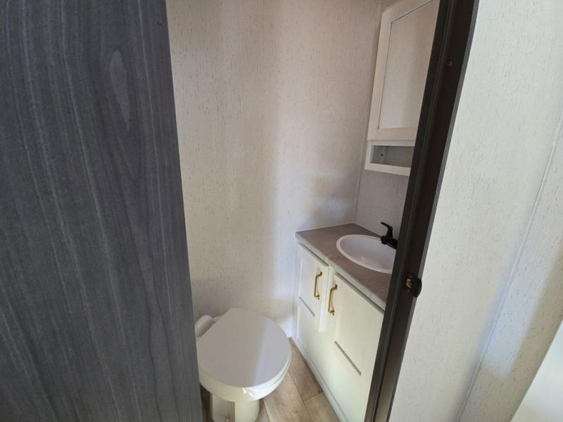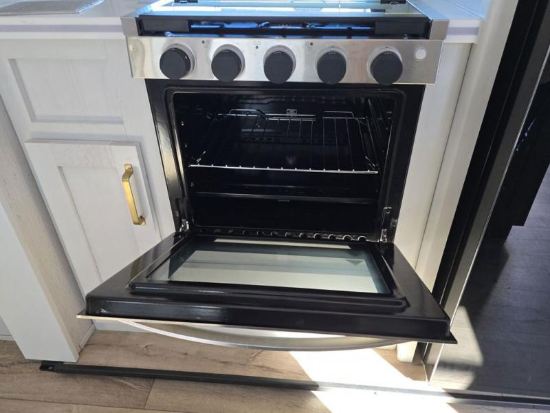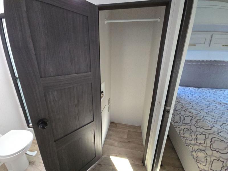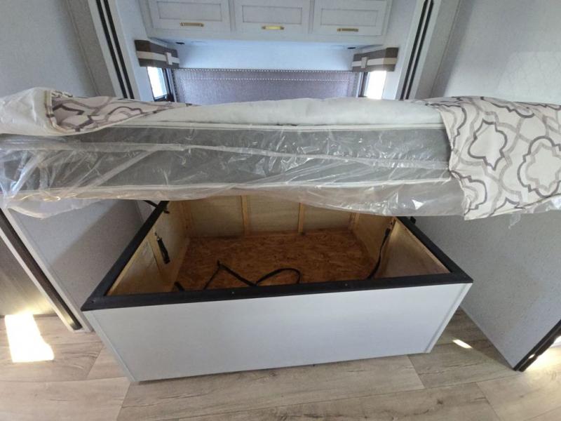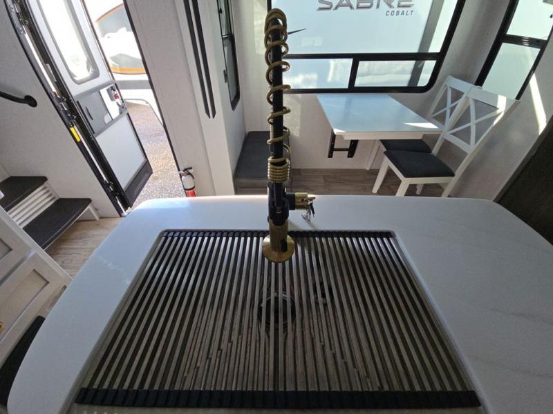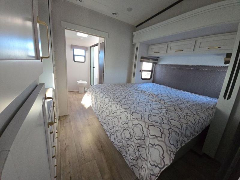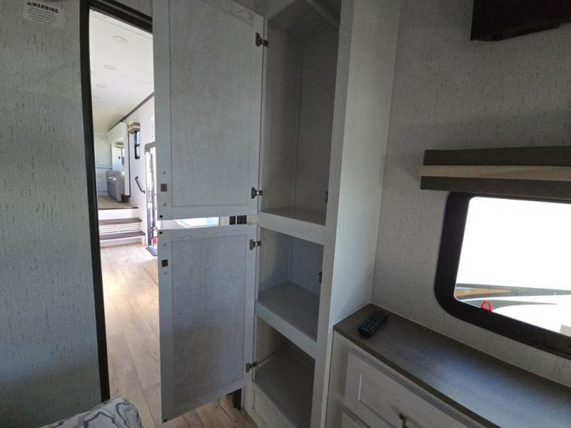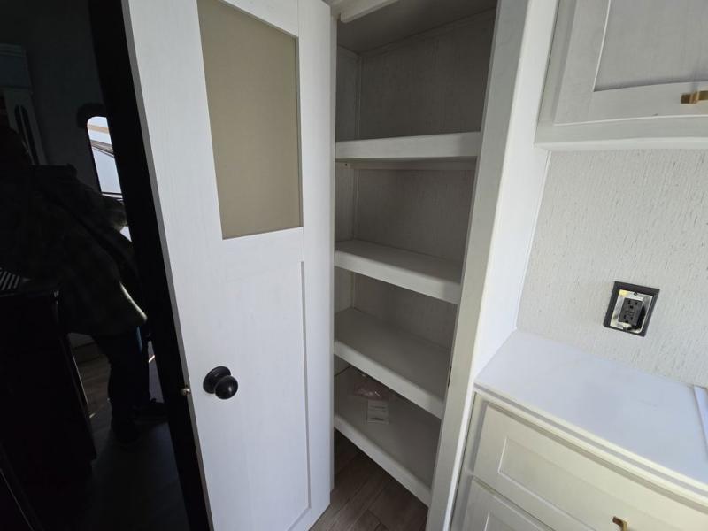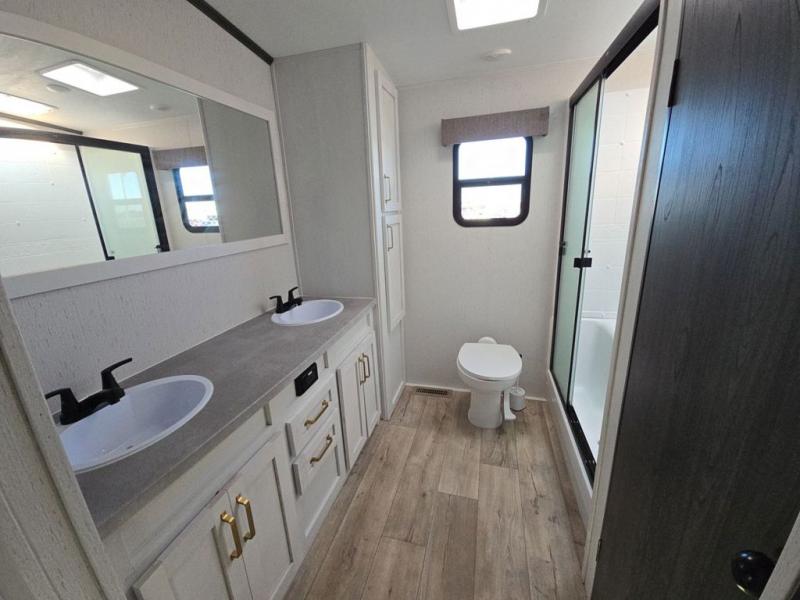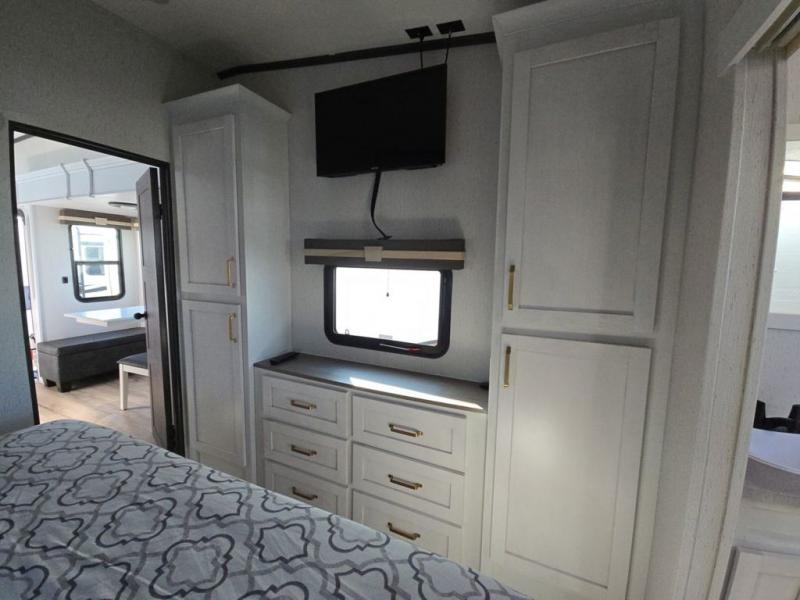 Experience a comfortable camping trip with this fifth wheel! The front living area not only has opposing sofa slides, but also theater seating across from an entertainment center with a 40" glass fireplace and a 50" LED TV. The separate kitchen has everything you will need to prepare delicious home cooked meals including a glass top three burner cooktop with a 21" oven and a kitchen island with a large sink that has a high rise faucet with sprayer for an easy clean up. There is even a half bathroom by the kitchen so you can use it and quickly get back to cooking. The master suite has a king bed slide for more walking around space, an entertainment center for a comfortable movie night, and access to the spacious full rear bathroom with a dual sink vanity, storage and a space prepped for a washer/dryer option.