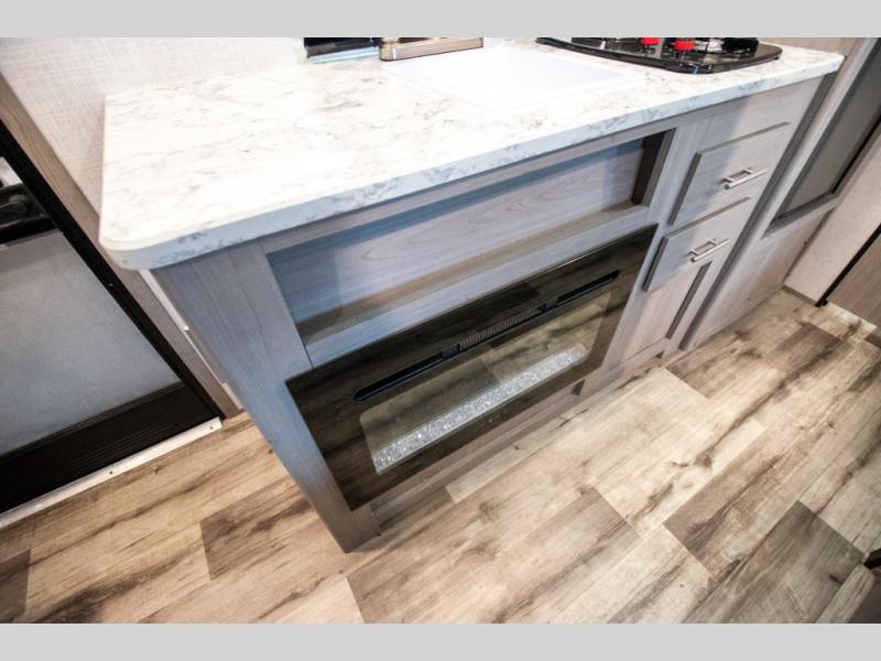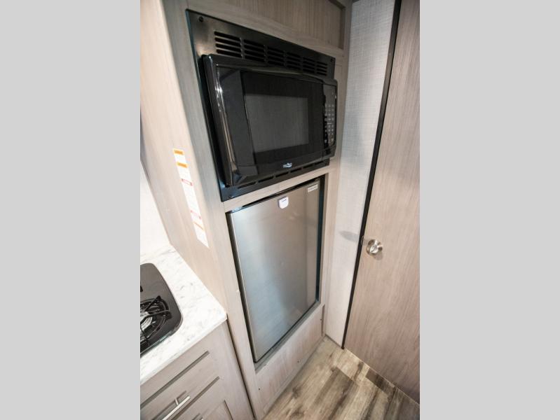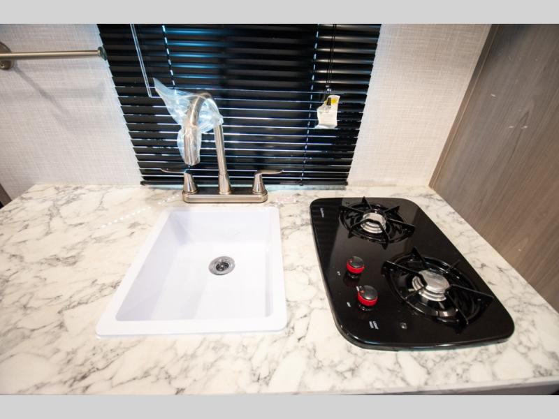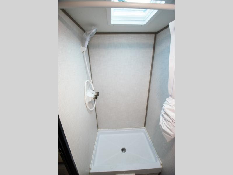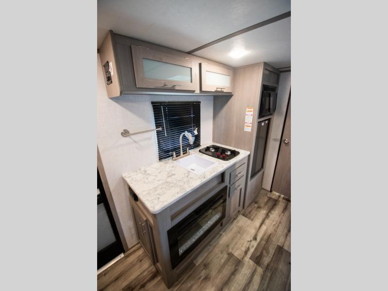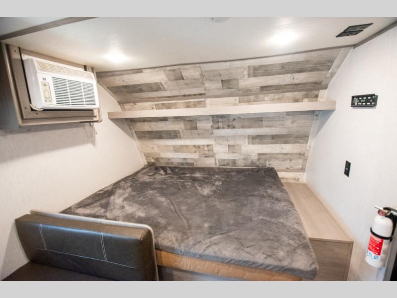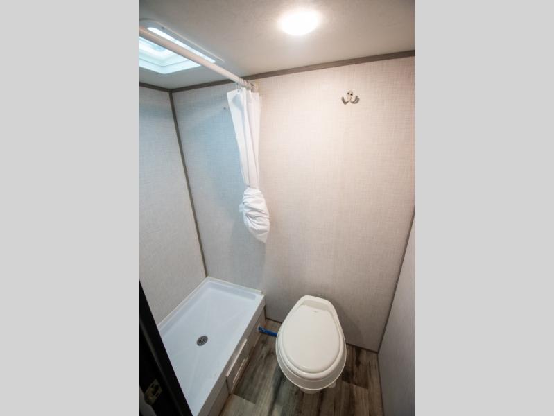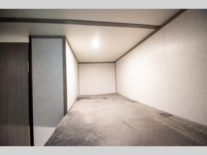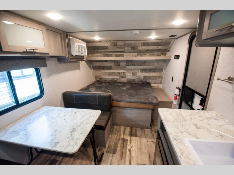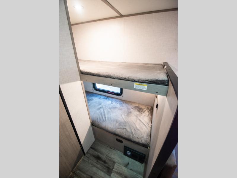 After making dinner on the two burner cooktop or inside the microwave, you can dine at the booth dinette or outside under the 8' power awning if you brought along your camping chairs. Either way you will be comfortable and the dinette may even sleep one person if needed. After playing outdoors all day, everyone can return to get cleaned up in the private toilet and shower room then fall asleep on the queen bed up front or the bunk beds in the rear. And everyone can wake up the next morning to do it over again.