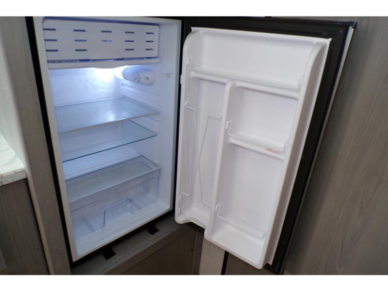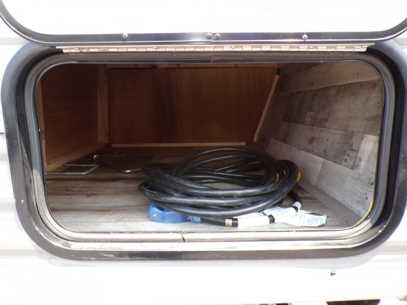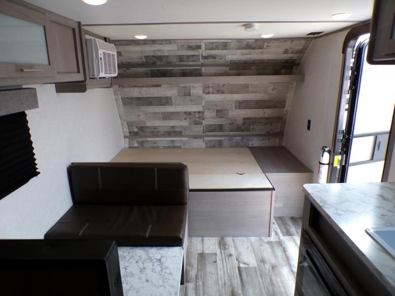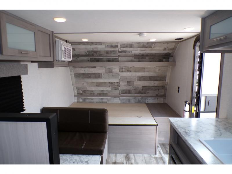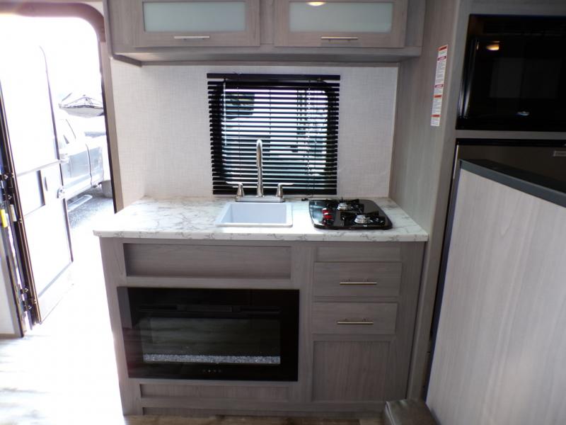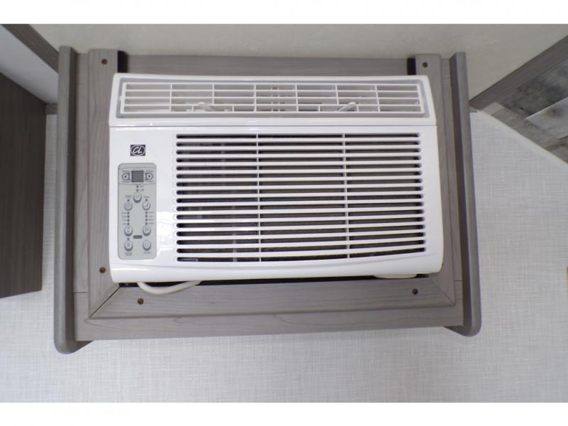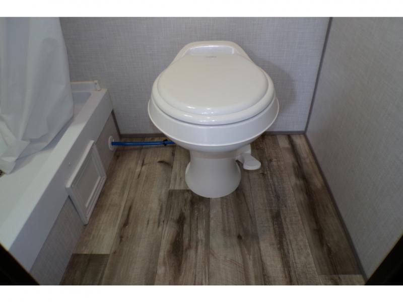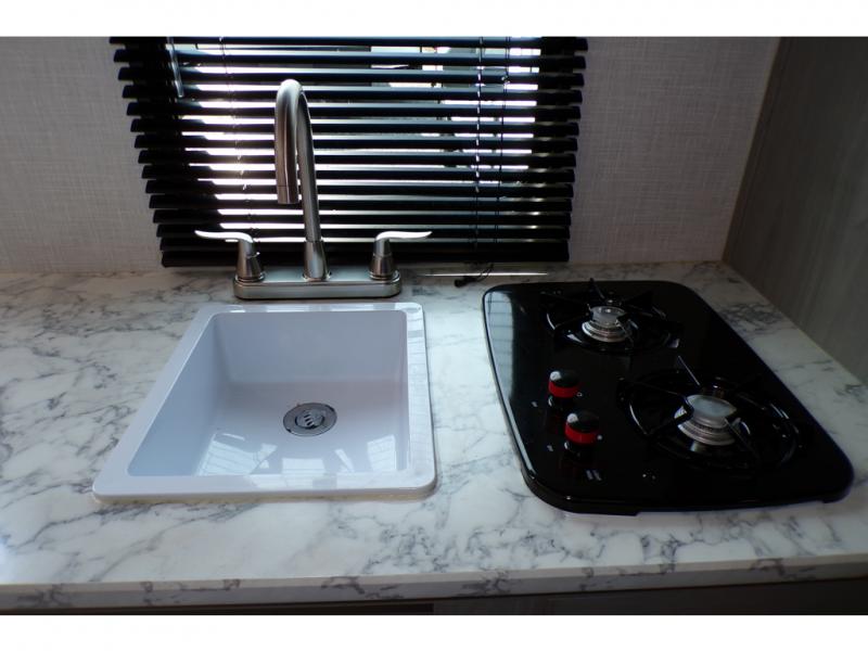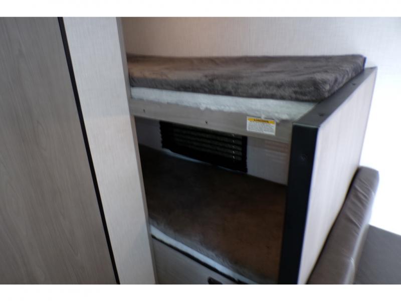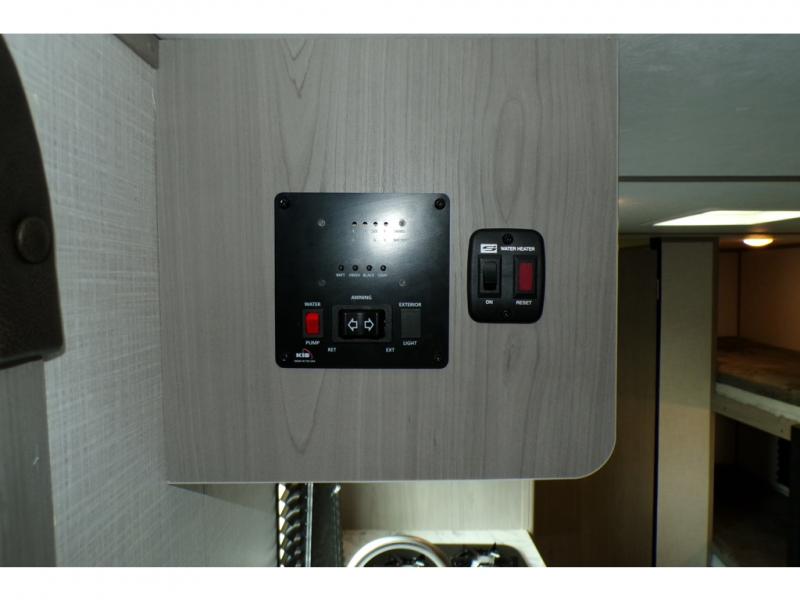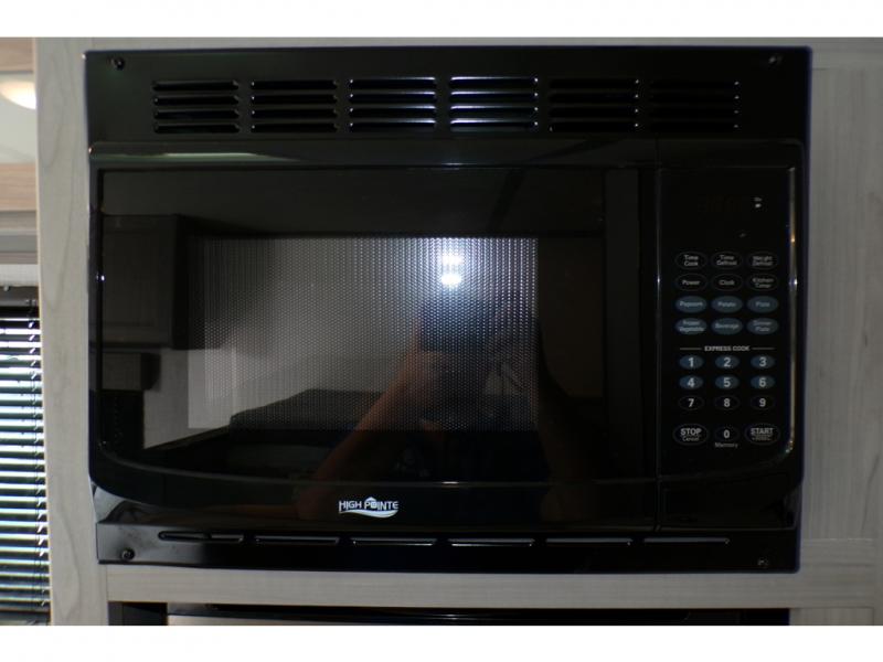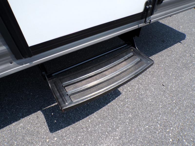 After making dinner on the two burner cooktop or inside the microwave, you can dine at the booth dinette or outside under the 8' power awning if you brought along your camping chairs. Either way you will be comfortable and the dinette may even sleep one person if needed. After playing outdoors all day, everyone can return to get cleaned up in the private toilet and shower room then fall asleep on the queen bed up front or the bunk beds in the rear. And everyone can wake up the next morning to do it over again.
