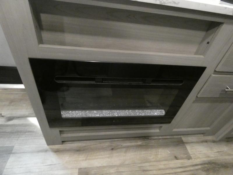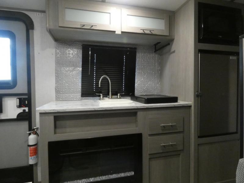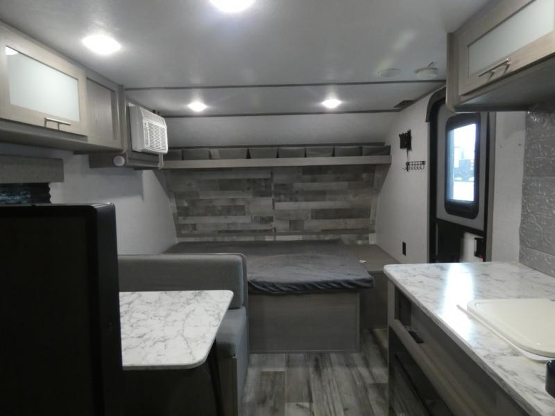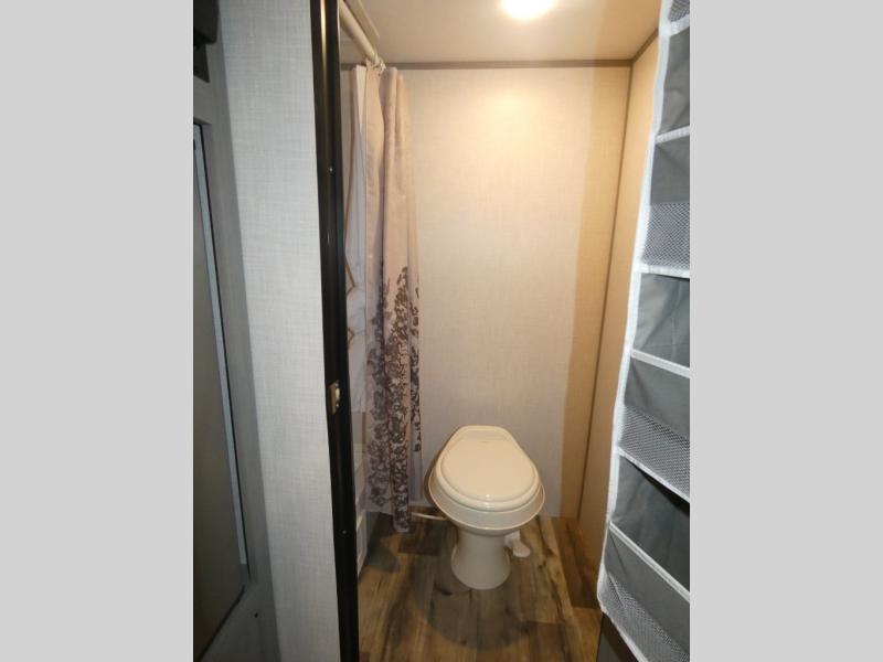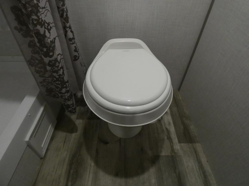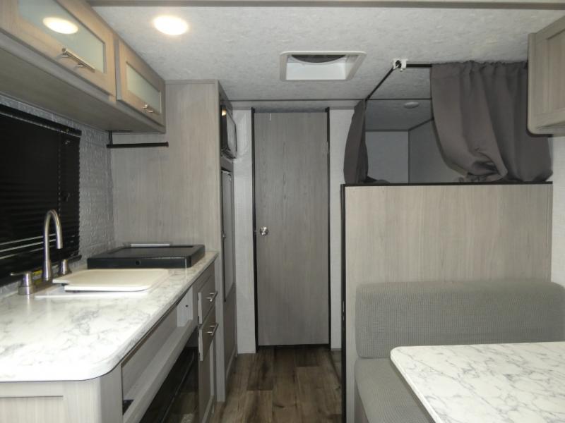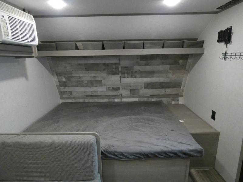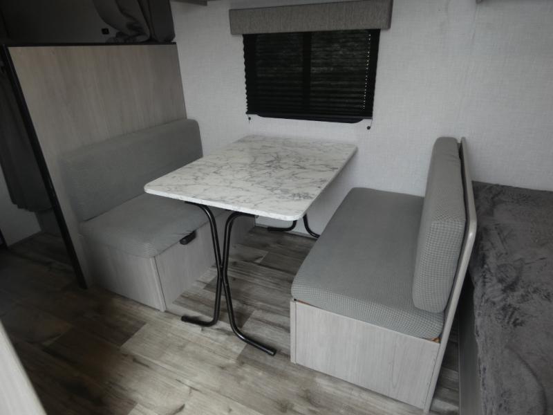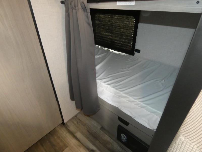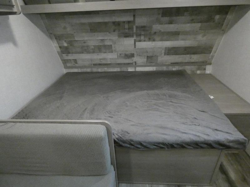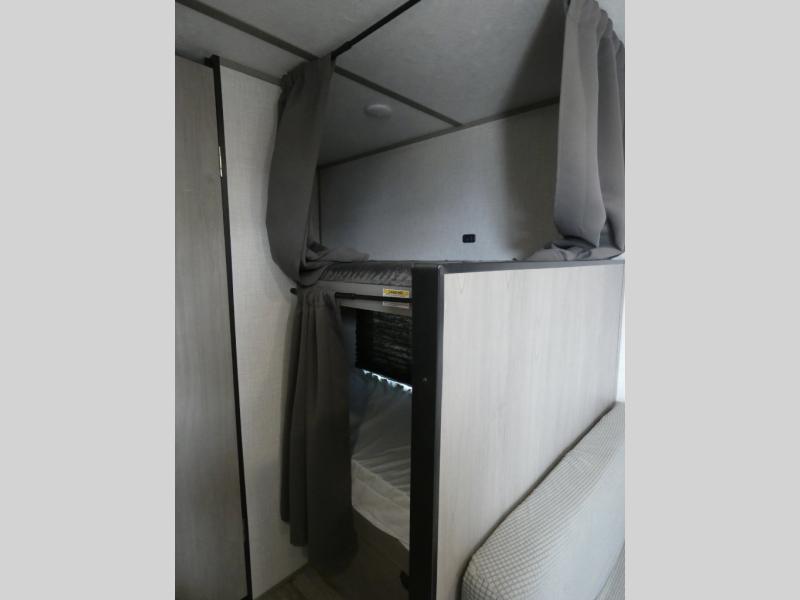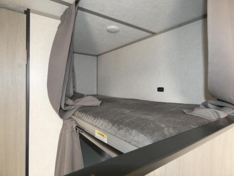After making dinner on the two burner cooktop or inside the microwave, you can dine at the booth dinette or outside under the 8' power awning if you brought along your camping chairs. Either way you will be comfortable and the dinette may even sleep one person if needed. After playing outdoors all day, everyone can return to get cleaned up in the private toilet and shower room then fall asleep on the queen bed up front or the bunk beds in the rear. And everyone can wake up the next morning to do it over again.