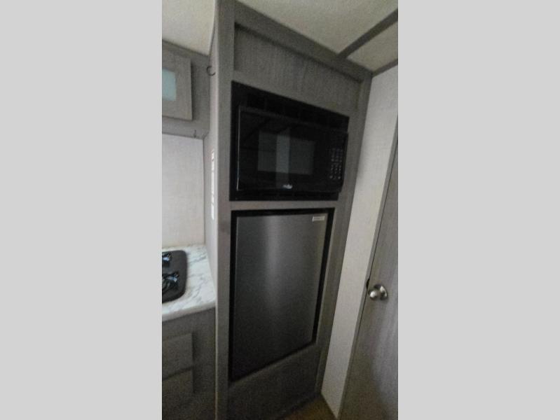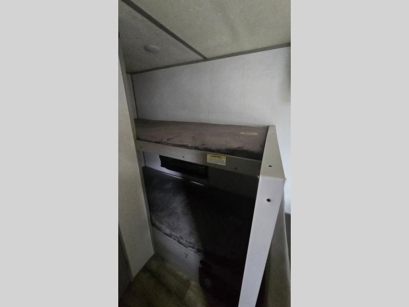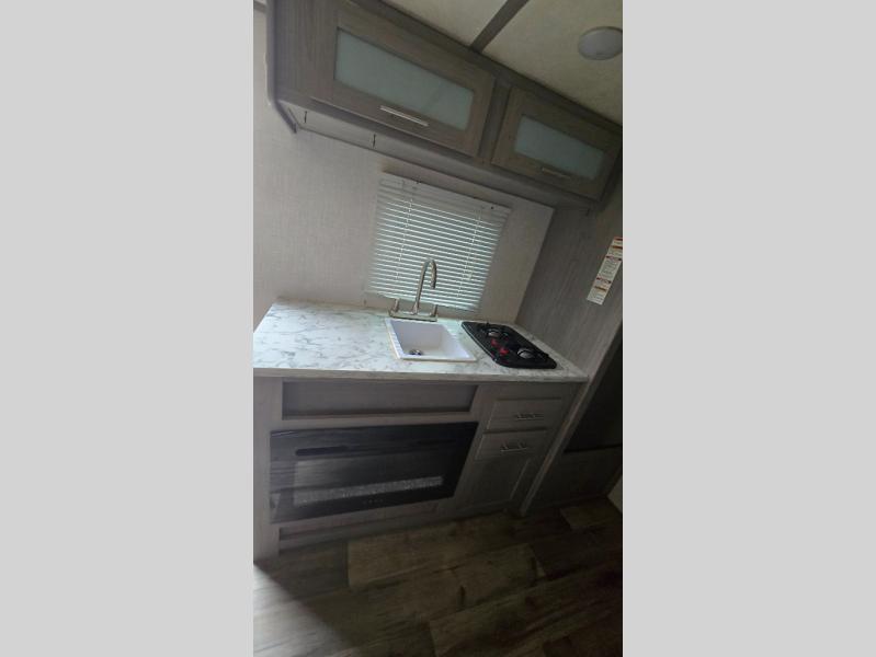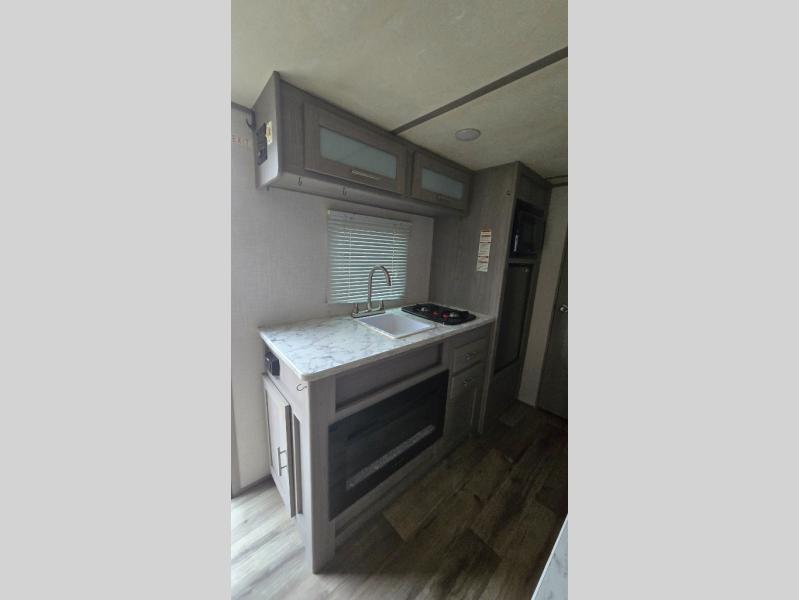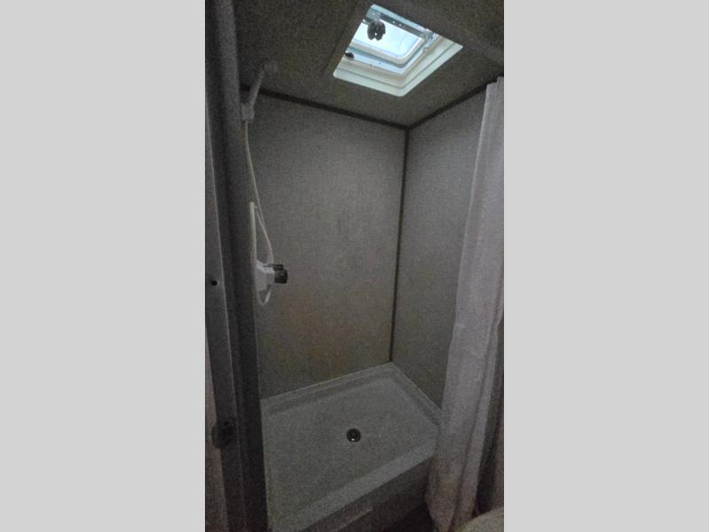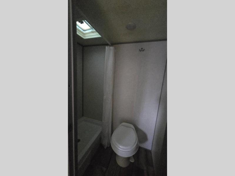 After making dinner on the two burner cooktop or inside the microwave, you can dine at the booth dinette or outside under the 8' power awning if you brought along your camping chairs. Either way you will be comfortable and the dinette may even sleep one person if needed. After playing outdoors all day, everyone can return to get cleaned up in the private toilet and shower room then fall asleep on the queen bed up front or the bunk beds in the rear. And everyone can wake up the next morning to do it over again.
