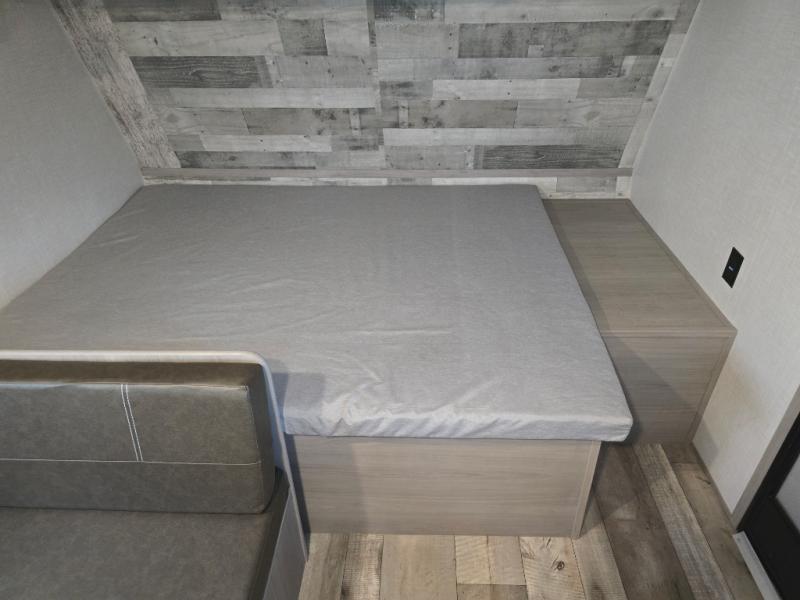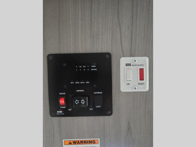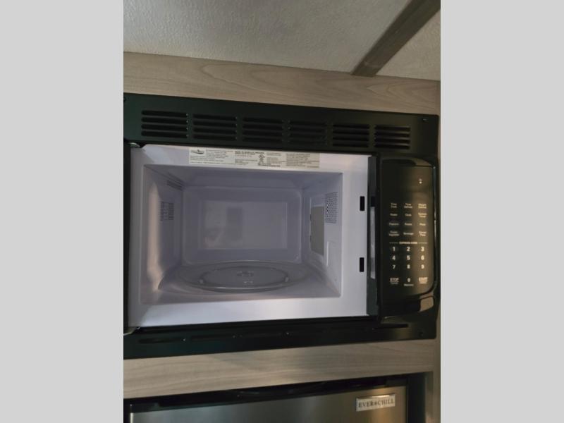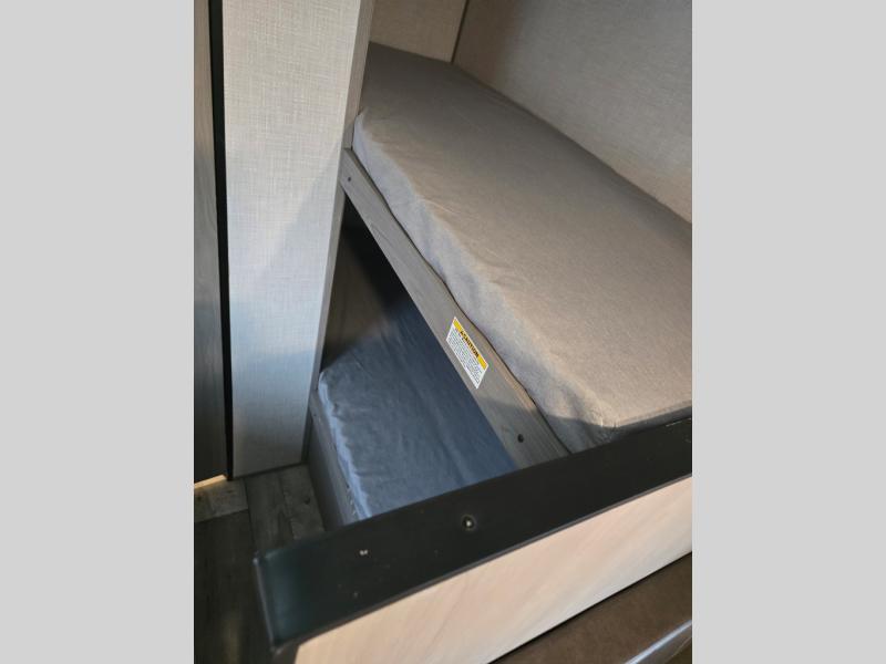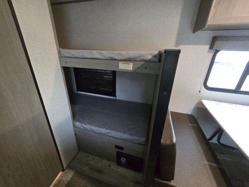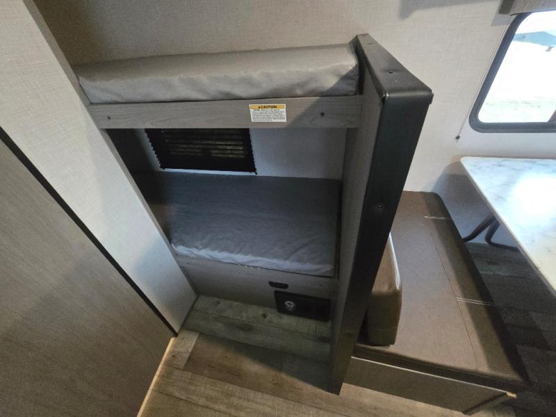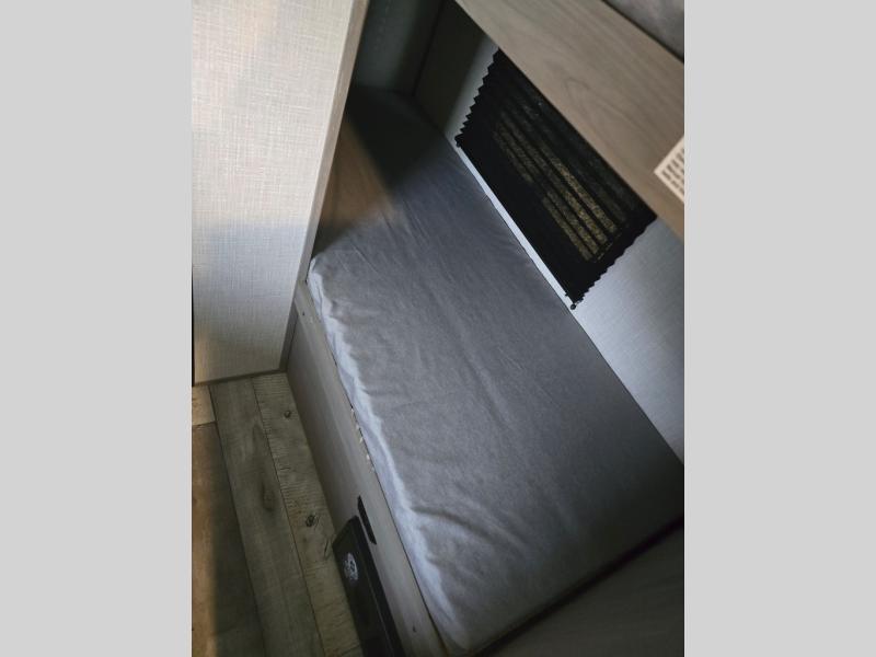 After making dinner on the two burner cooktop or inside the microwave, you can dine at the booth dinette or outside under the 8' power awning if you brought along your camping chairs. Either way you will be comfortable and the dinette may even sleep one person if needed. After playing outdoors all day, everyone can return to get cleaned up in the private toilet and shower room then fall asleep on the queen bed up front or the bunk beds in the rear. And everyone can wake up the next morning to do it over again.