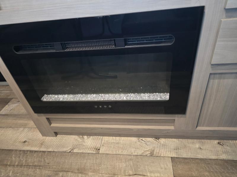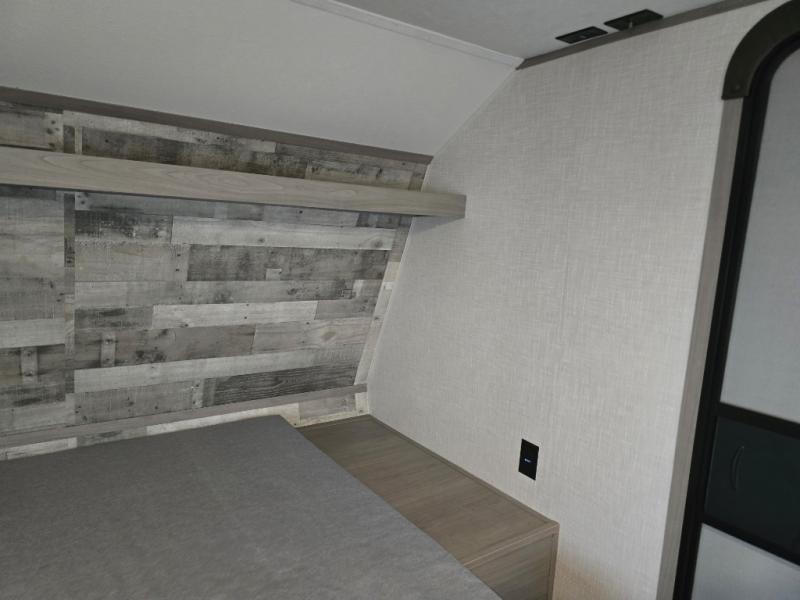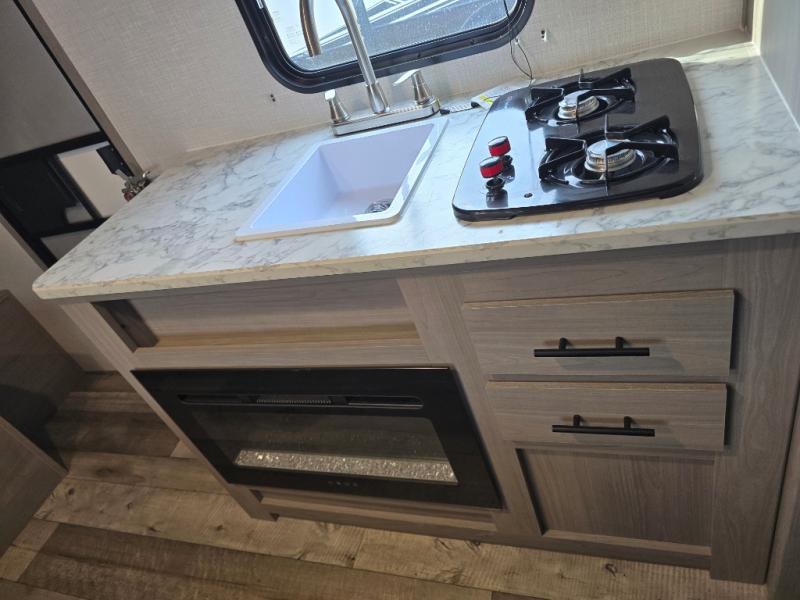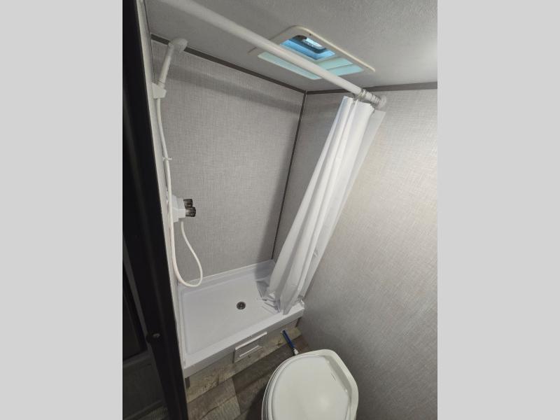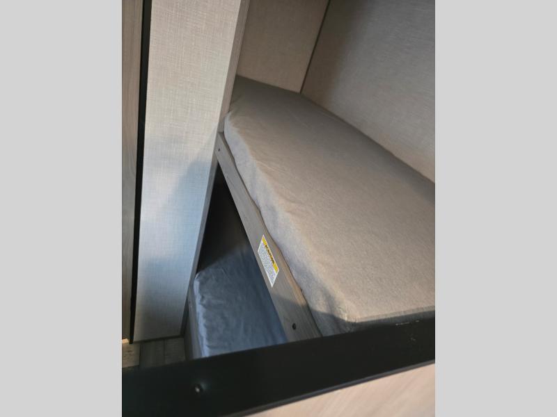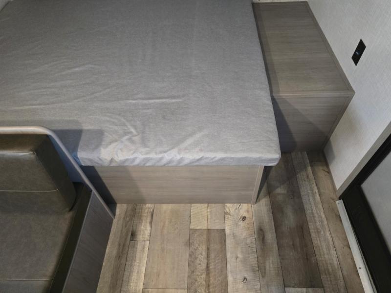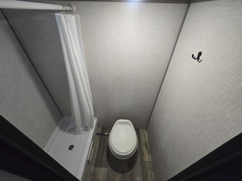 After making dinner on the two burner cooktop or inside the microwave, you can dine at the booth dinette or outside under the 8' power awning if you brought along your camping chairs. Either way you will be comfortable and the dinette may even sleep one person if needed. After playing outdoors all day, everyone can return to get cleaned up in the private toilet and shower room then fall asleep on the queen bed up front or the bunk beds in the rear. And everyone can wake up the next morning to do it over again.