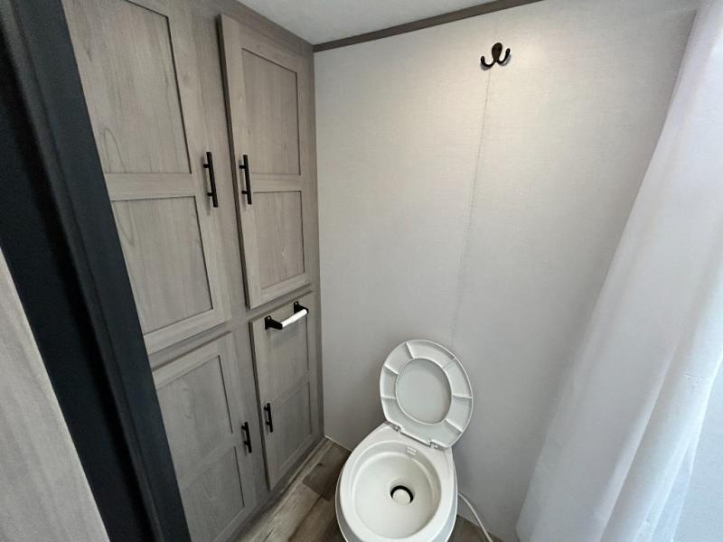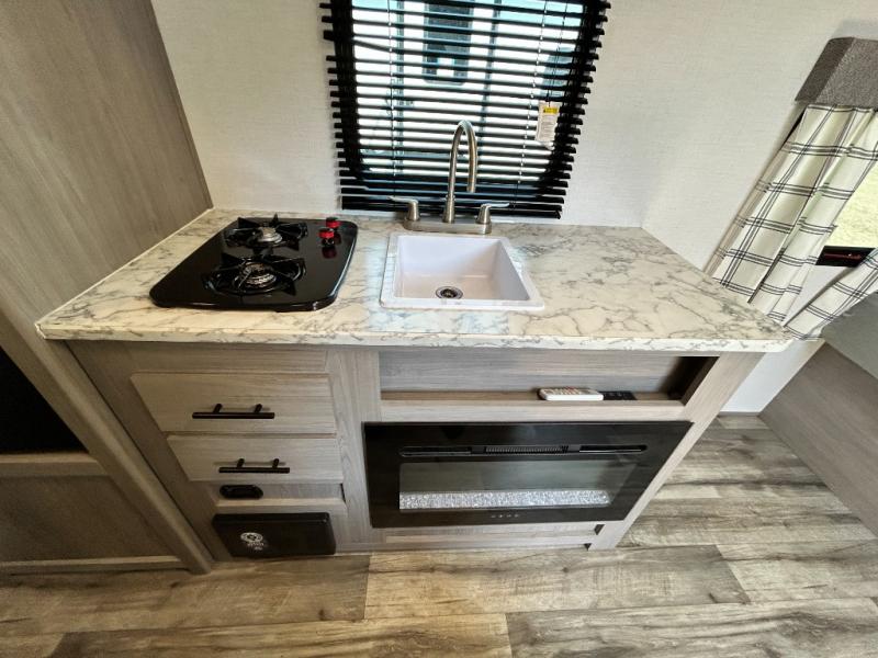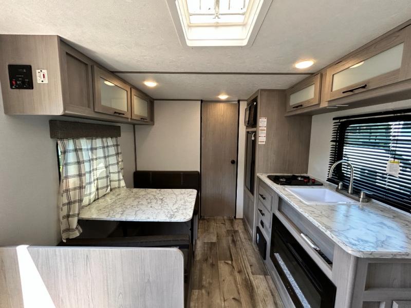After making dinner on the two burner cooktop or inside the microwave, you can dine at the booth dinette or outside under the 8' power awning if you brought along your camping chairs. Either way you will be comfortable and the dinette may even sleep one person if needed. After playing outdoors all day, everyone can return to get cleaned up in the private toilet and shower room then fall asleep on the queen bed up front or the bunk beds in the rear. And everyone can wake up the next morning to do it over again.