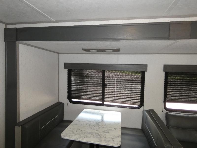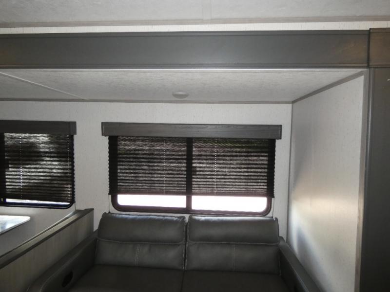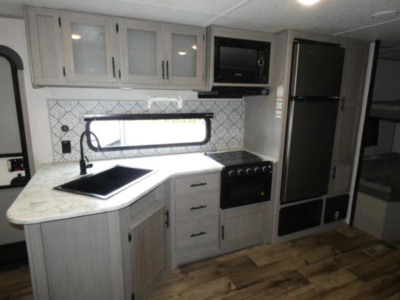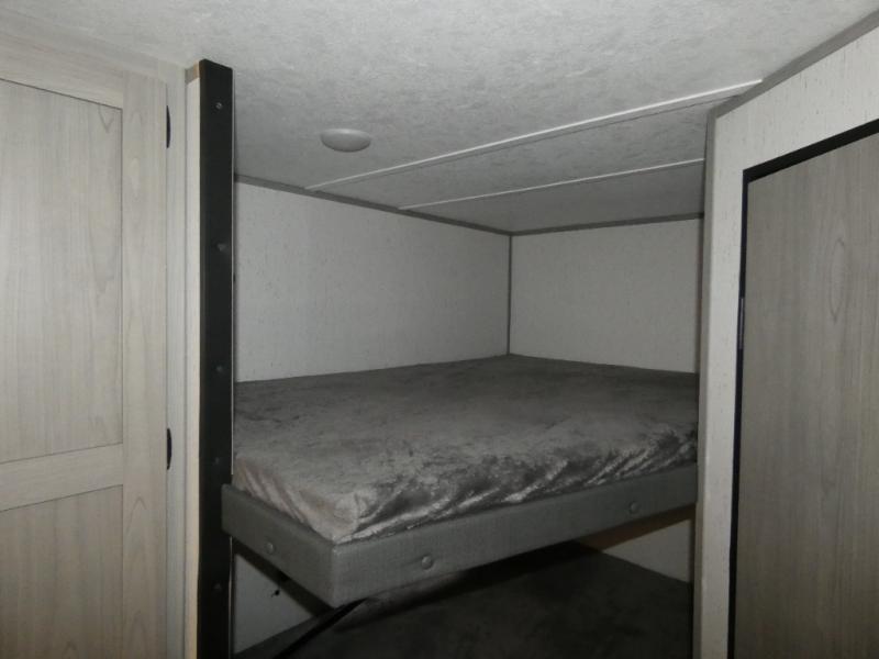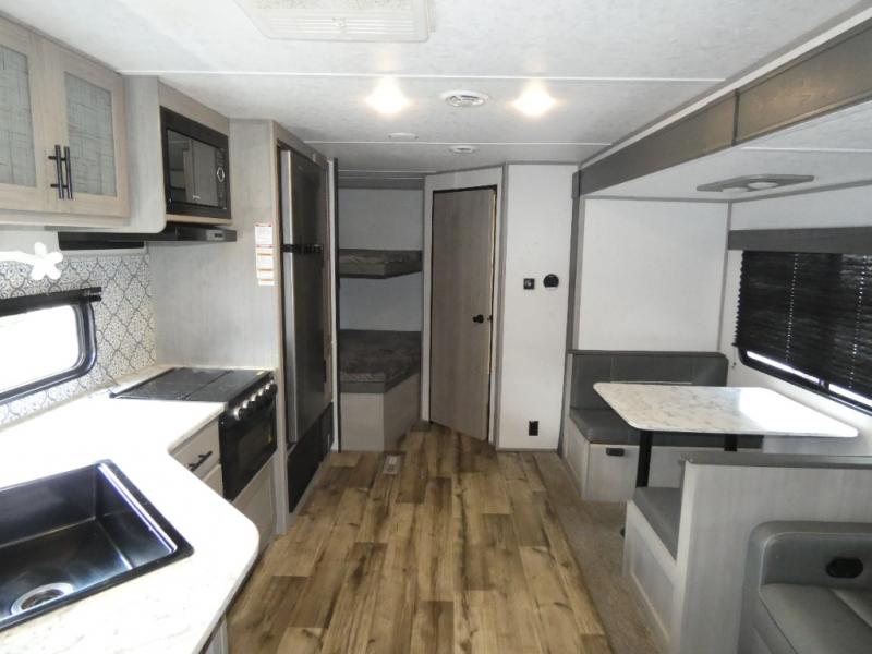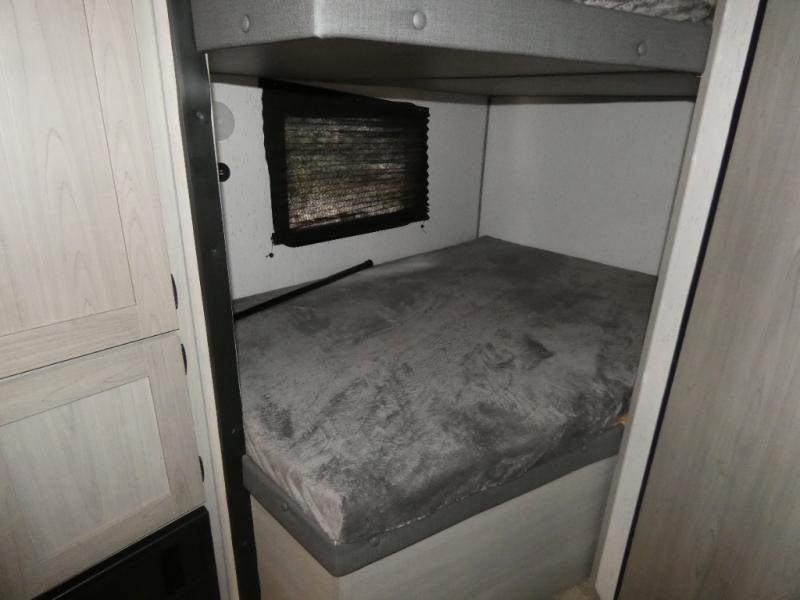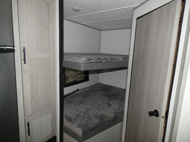 Family fun is found in this spacious travel trailer with double-size bunks, a large slide out, and a private bedroom up front! You can relax on the sofa or play a card game at the booth dinette, or you can visit outdoors under the 14' power awning with LED lights. The cooktop and oven will be perfect to prepare at-home meals on, and there is plenty of counter space to cut fresh fruits and vegetables. This model includes a full bath for convenience, and you'll love how the shower skylight allows natural light in. The queen bed in the bedroom will make this model feel more like home, and the little ones will love to climb into double-size bunks each night. And don't overlook the pass-through storage for fishing poles and hiking gear!