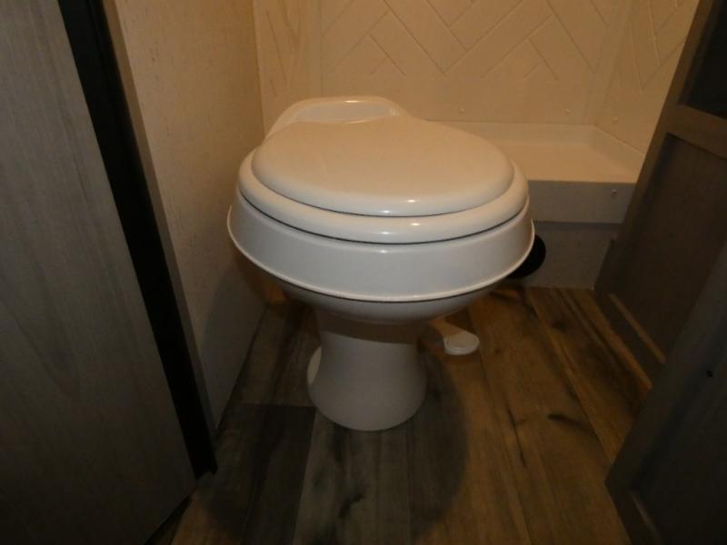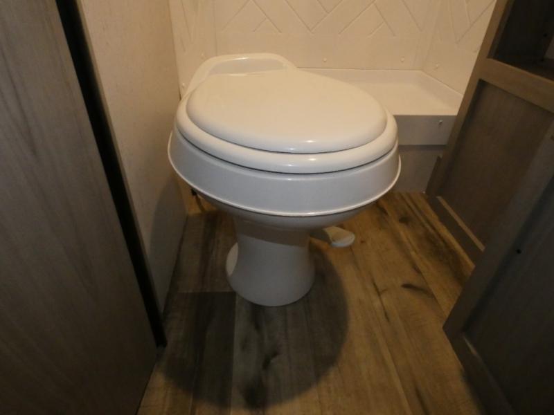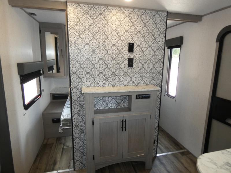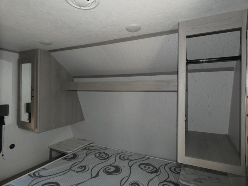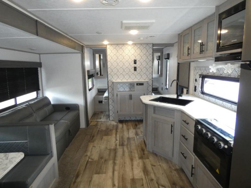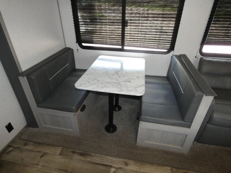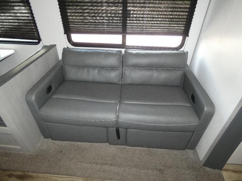 Family fun is found in this spacious travel trailer with double-size bunks, a large slide out, and a private bedroom up front! You can relax on the sofa or play a card game at the booth dinette, or you can visit outdoors under the 14' power awning with LED lights. The cooktop and oven will be perfect to prepare at-home meals on, and there is plenty of counter space to cut fresh fruits and vegetables. This model includes a full bath for convenience, and you'll love how the shower skylight allows natural light in. The queen bed in the bedroom will make this model feel more like home, and the little ones will love to climb into double-size bunks each night. And don't overlook the pass-through storage for fishing poles and hiking gear!