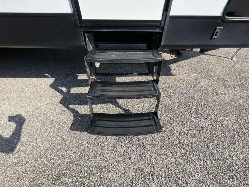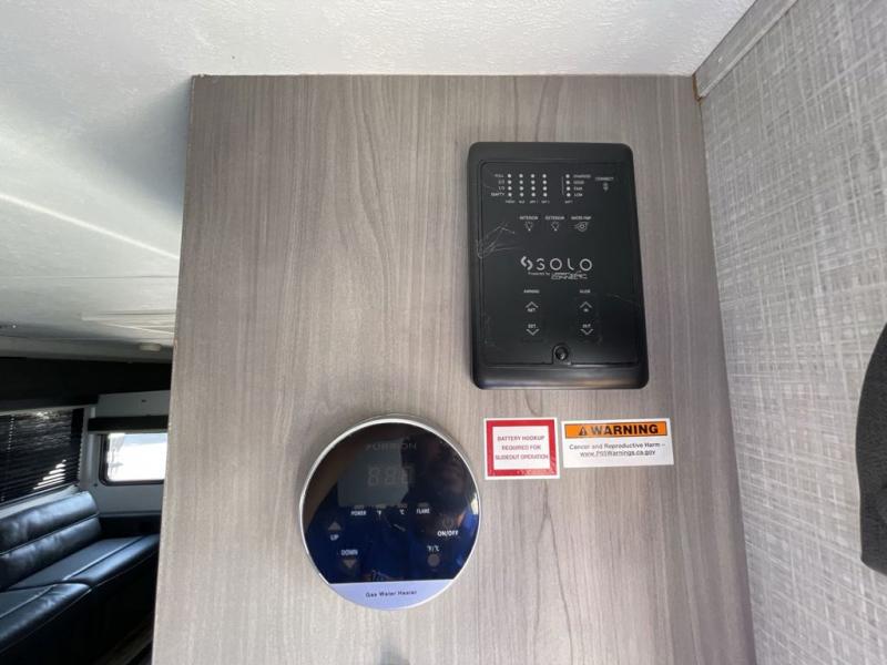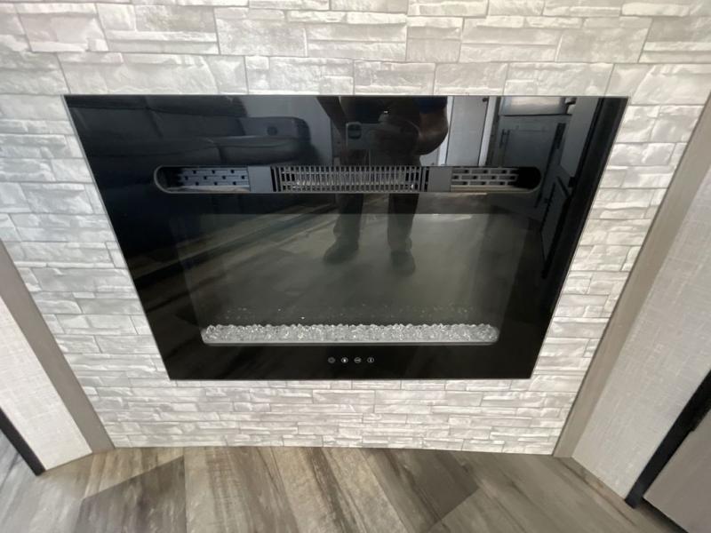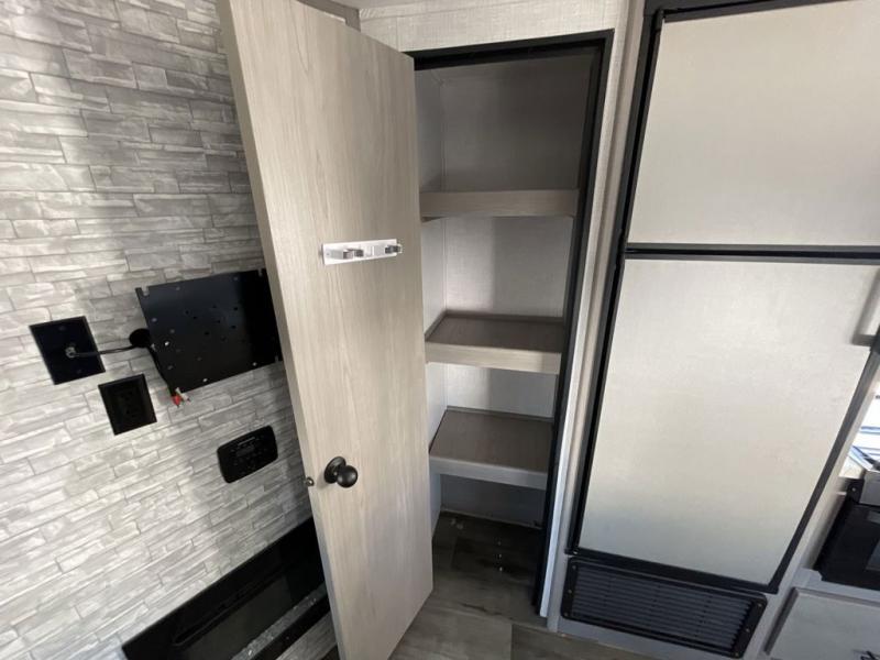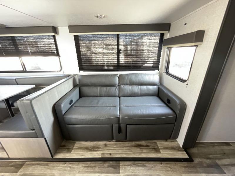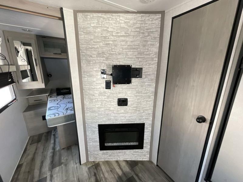 This Coleman Light travel trailer is quite accommodating with its bunk beds, U-shaped dinette, reclining sofa, and residential queen bed! There is a large slide that will create an open living area, and you can relax in front of the fireplace when you need a little extra heat on a chilly day. The hinged entertainment center hides a pantry in the kitchen, and there is also a 7-cubic foot refrigerator that you can use for cold food storage. Come and go as you please with the two entry doors, and spend some time outside cooking meals at the outdoor kitchen while the 20' power awning protects you from stray rain drops.