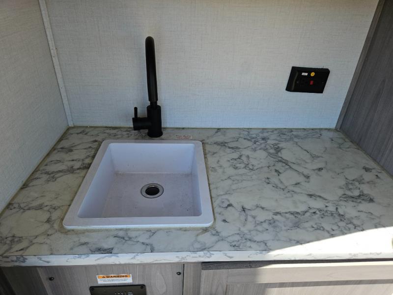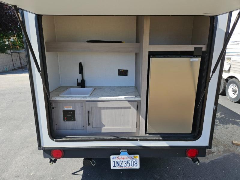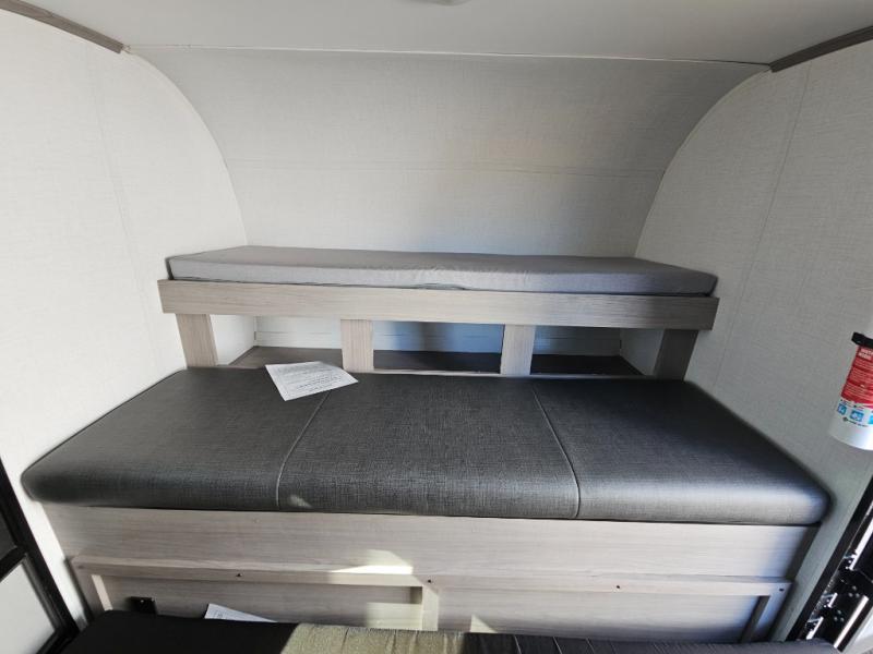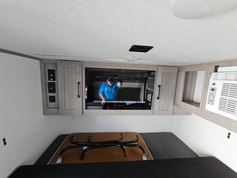 This unit is perfect for a family of 2-4 as it features dual entry, a hatch back kitchen for all of your meals and cooking needs thanks to the sink and refrigerator, storage cabinets and shelves, plus an exterior side mount griddle for perfect pancakes in the morning and burgers in the afternoon. Inside, a fireplace to take the chill out, a gaucho sofa which converts to a bed, plus the dinette also makes into more sleeping space when nighttime comes. There is also a single bunk in front which is perfect for a child, and the dual entry doors makes it easy for everyone to come and go.