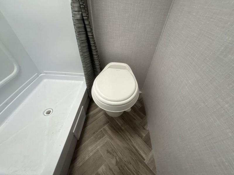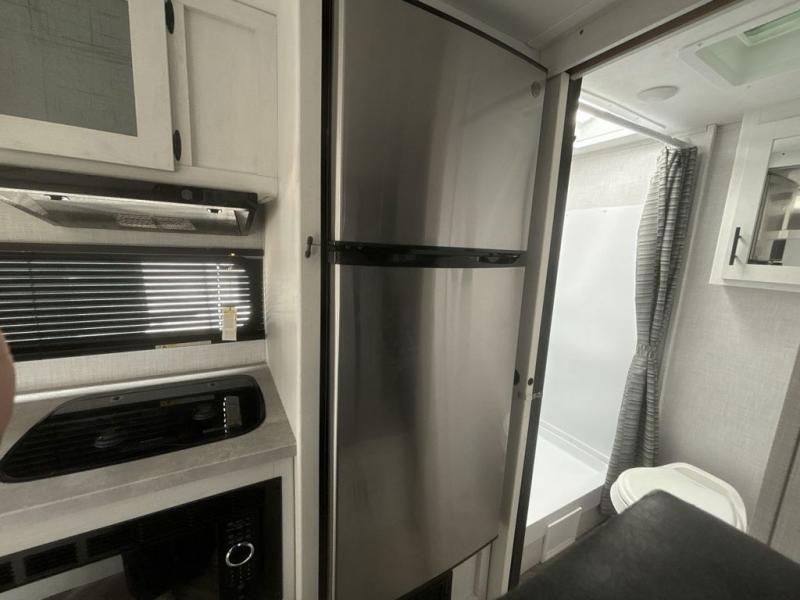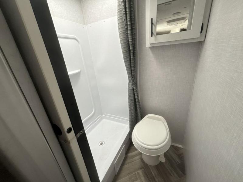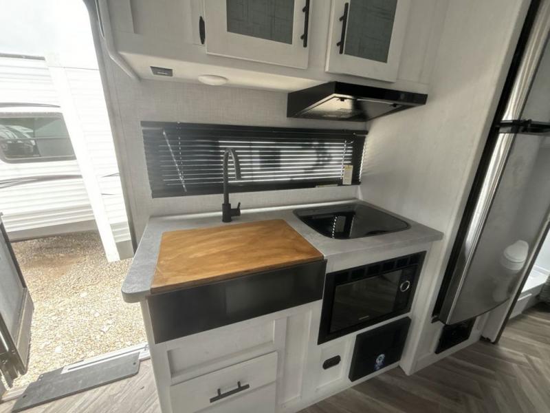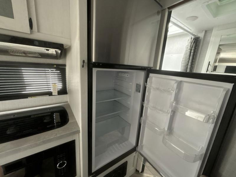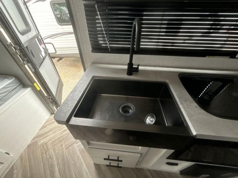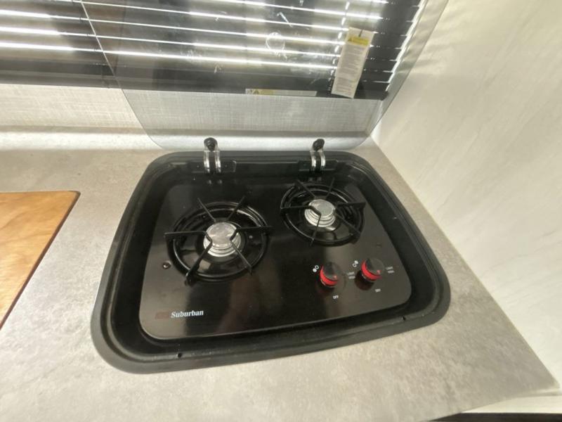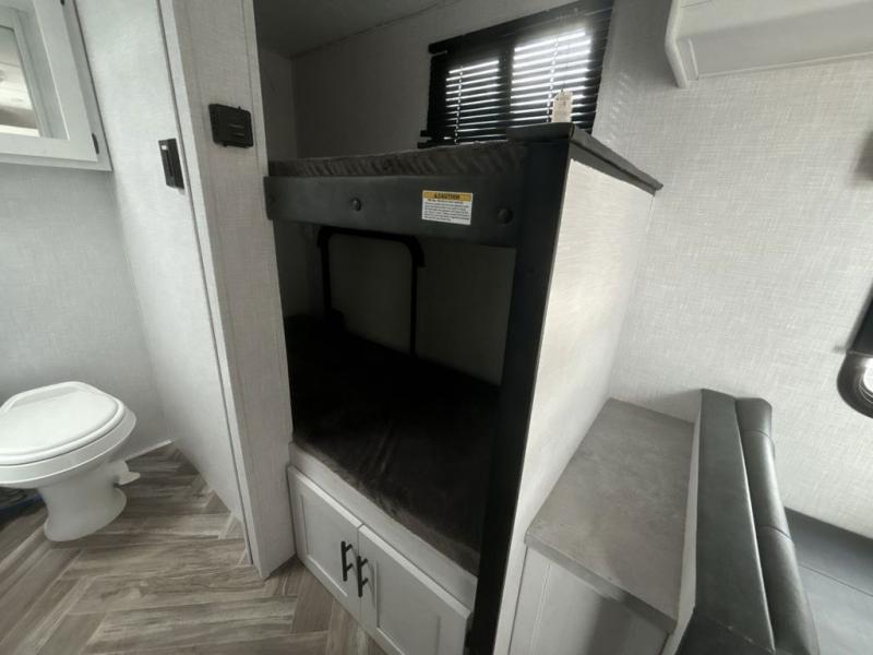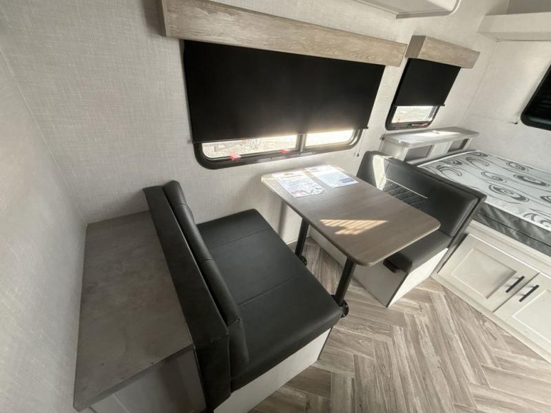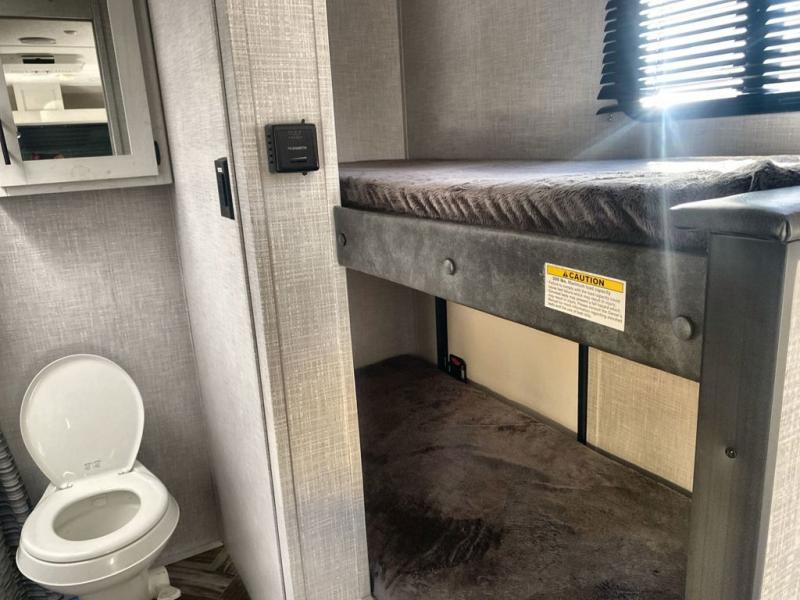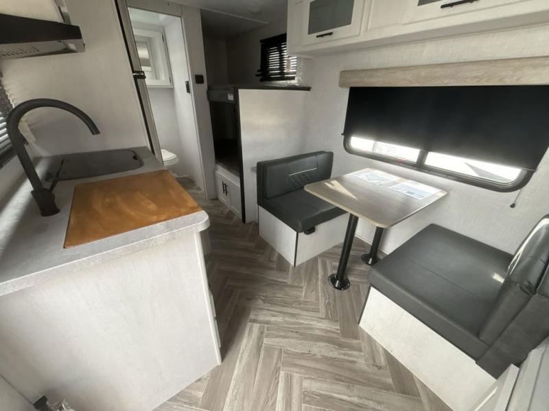 The kiddos or guests will enjoy a good night's rest on the bunk beds in this travel trailer! There is also a front queen bed and a booth dinette that can transform into an extra sleeping space when you're not using it to enjoy a meal or play a card game. Speaking of meals, you can prepare delicious home cooked meals with the two burner range and keep your perishables fresh in the 10 cu. ft. refrigerator. The rear corner bathroom lets you start each morning feeling clean and fresh with a skylight above the shower to let in some natural lighting while you get ready!