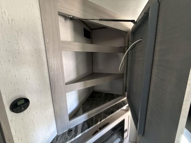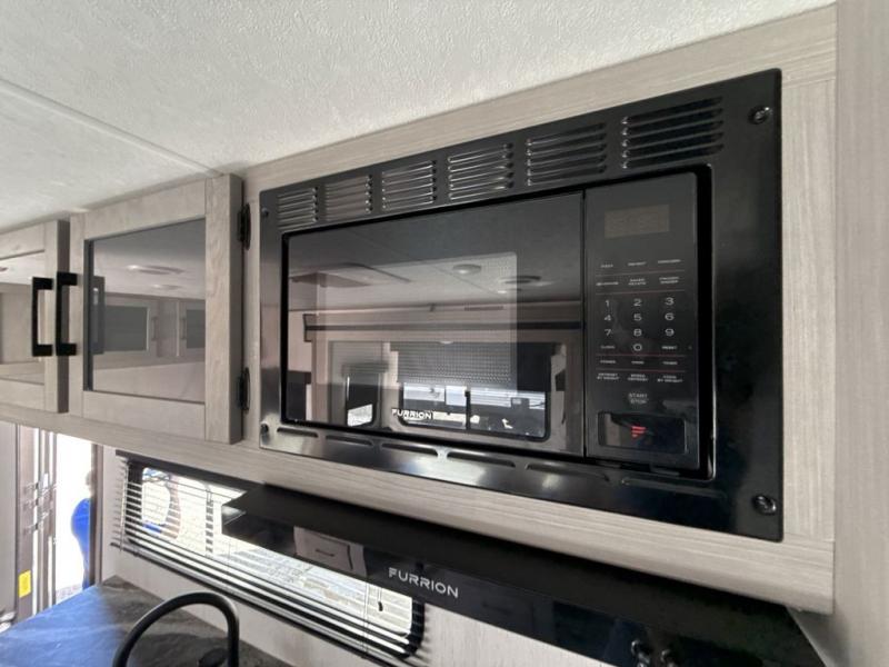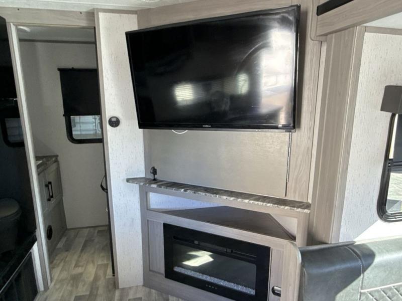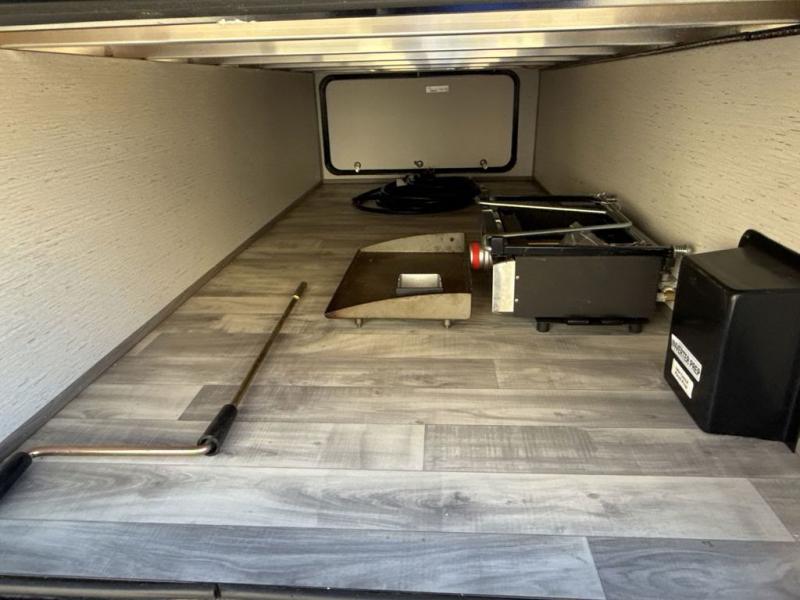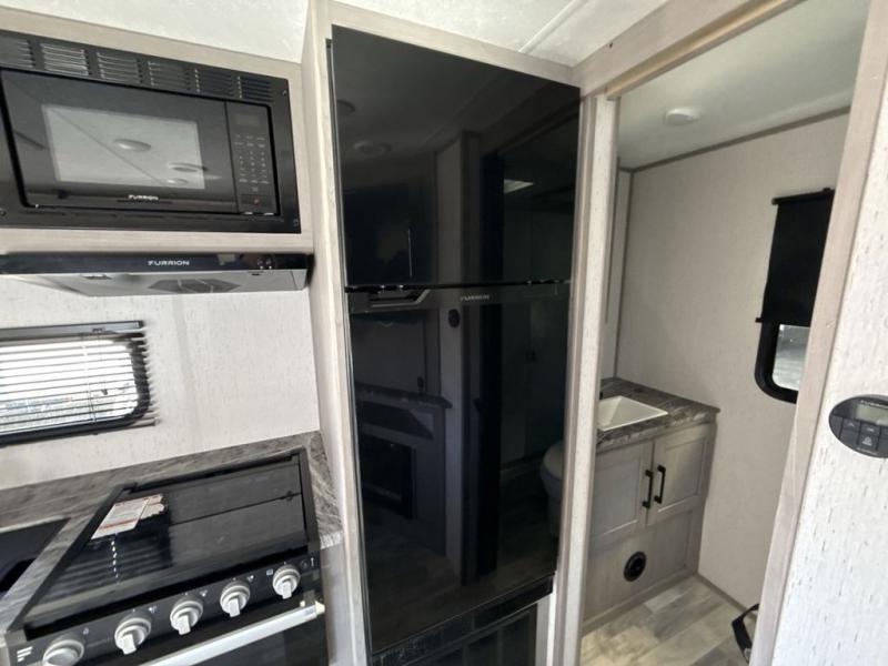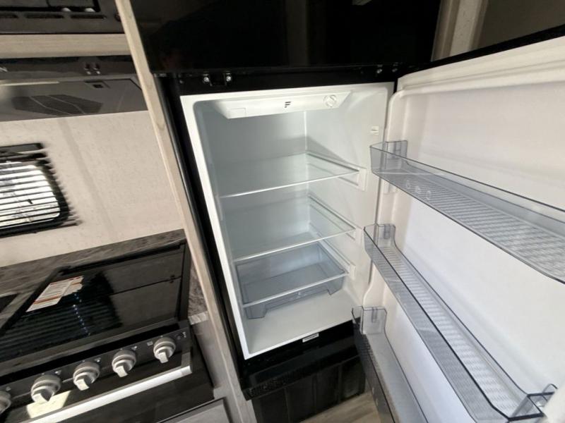 A full rear bath on board this cozy travel trailer will add privacy and convenience you won't want to camp without. The slide out in the main living area will provide plenty of space to let the chef whip up breakfast on the three burner range, and your crew can get comfy on the theater seats. The 10 cu. ft. refrigerator will allow you to pack your favorite cold ingredients, plus there is a hidden pantry behind the hinged entertainment center for smart storage spaces. This model also includes a front private bedroom with a queen bed, just like at home!