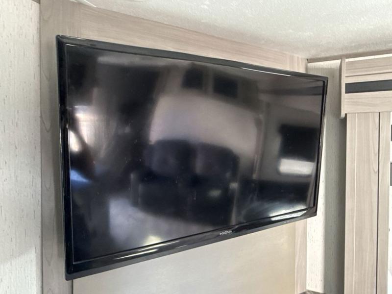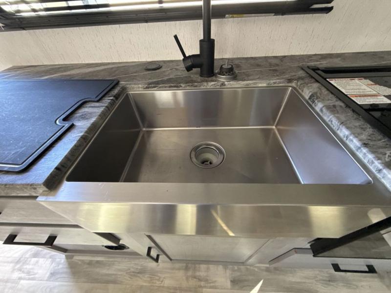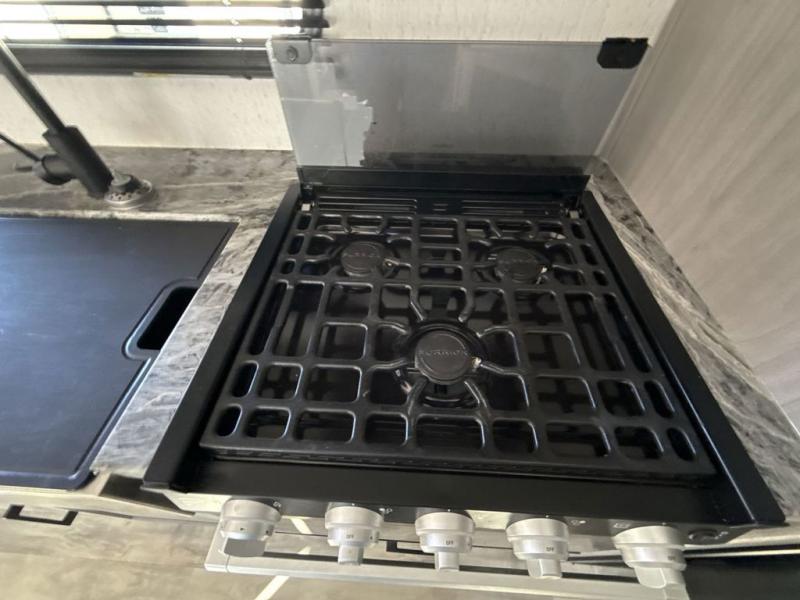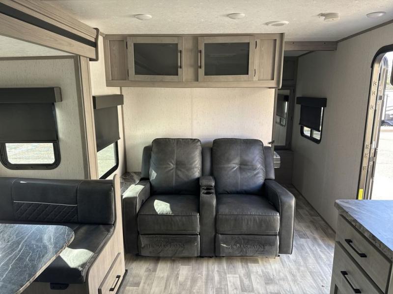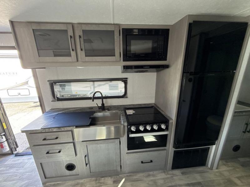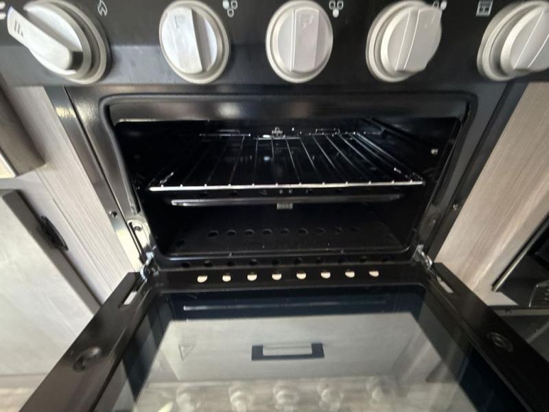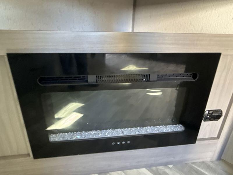 A full rear bath on board this cozy travel trailer will add privacy and convenience you won't want to camp without. The slide out in the main living area will provide plenty of space to let the chef whip up breakfast on the three burner range, and your crew can get comfy on the theater seats. The 10 cu. ft. refrigerator will allow you to pack your favorite cold ingredients, plus there is a hidden pantry behind the hinged entertainment center for smart storage spaces. This model also includes a front private bedroom with a queen bed, just like at home!