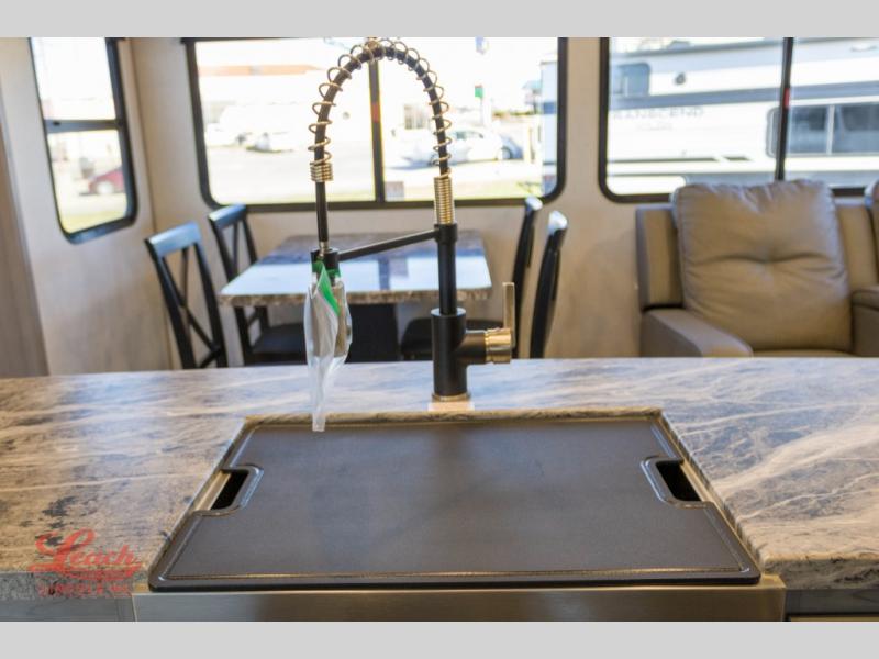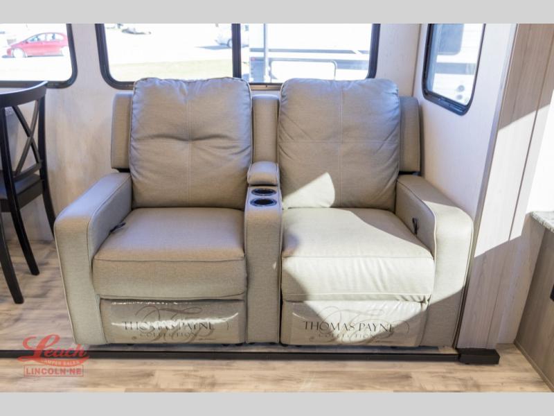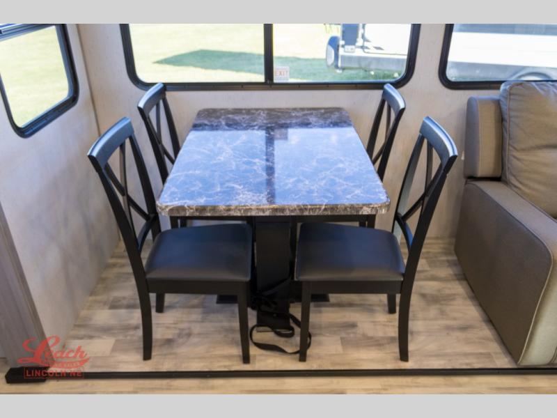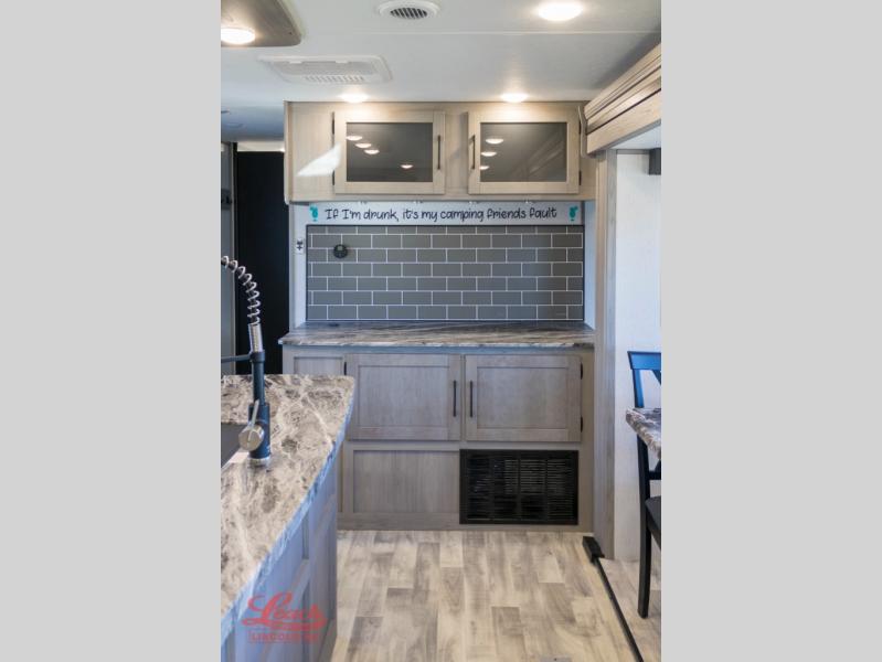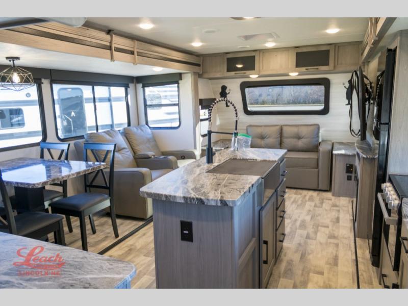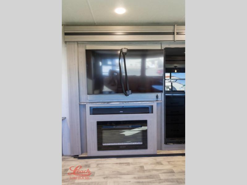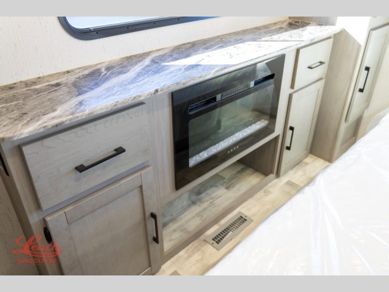 Enjoy ultimate family vacations or trips with friends in this spacious travel trailer. The dual opposing slides in the front living area open up the whole unit for a more at-home feel, and you'll find plenty of seating spaces on the theater seats, booth dinette, and sofa. The chef of the family will appreciate the extra counter space provided by the kitchen island, plus there is an extra counter with cabinets above and below for dishes and food. There is an outside kitchen that will come in handy if you like to cook breakfast outdoors, and the power awning with LED lights will provide your crew with shade as they wait for the food to be done. You and your spouse will love retreating to the rear private bedroom for bed each night. Here, the slide out king bed will provide a great night's rest, plus you will have your own fireplace and storage to hang your clothes!