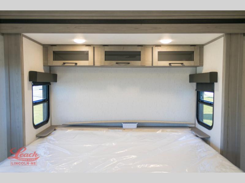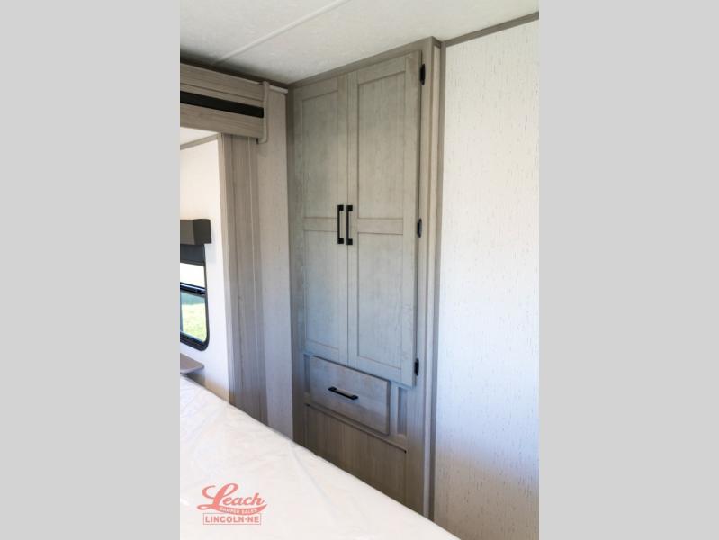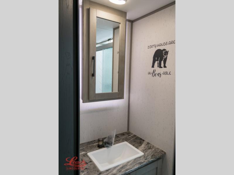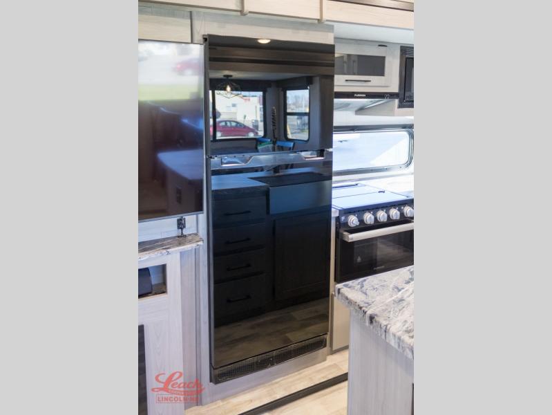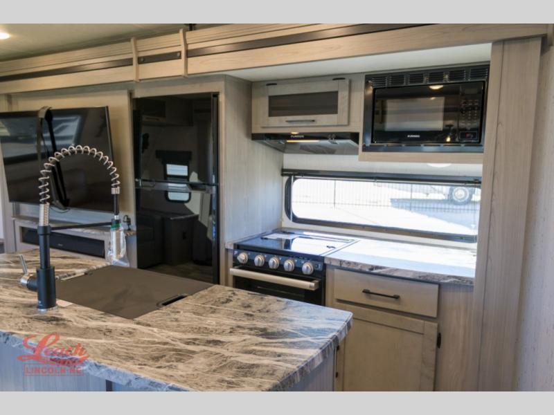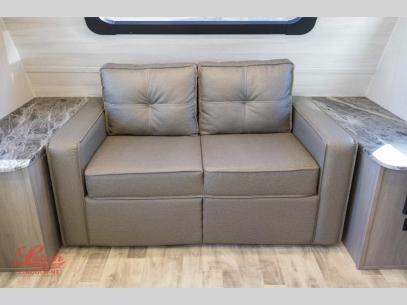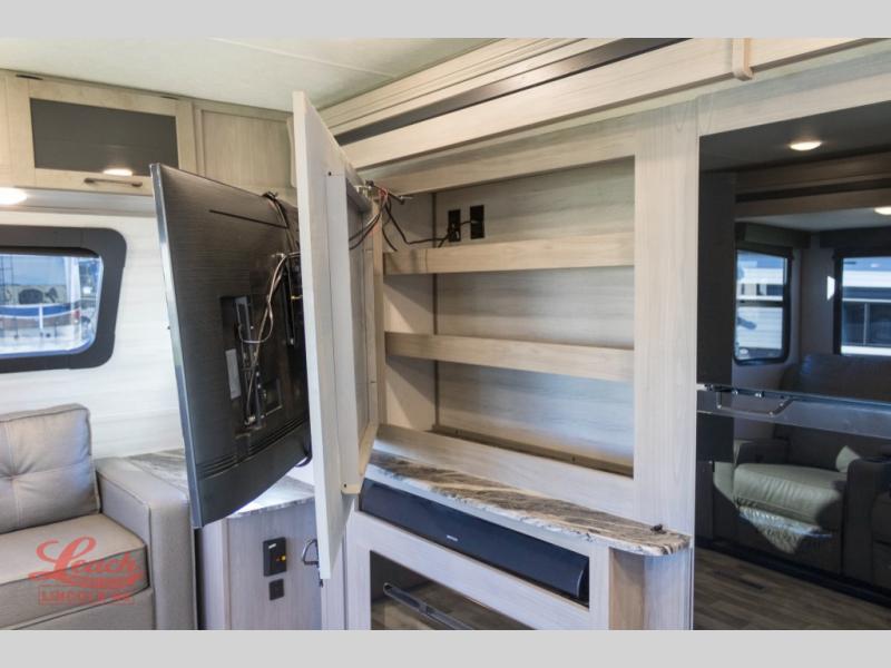 Enjoy ultimate family vacations or trips with friends in this spacious travel trailer. The dual opposing slides in the front living area open up the whole unit for a more at-home feel, and you'll find plenty of seating spaces on the theater seats, booth dinette, and sofa. The chef of the family will appreciate the extra counter space provided by the kitchen island, plus there is an extra counter with cabinets above and below for dishes and food. There is an outside kitchen that will come in handy if you like to cook breakfast outdoors, and the power awning with LED lights will provide your crew with shade as they wait for the food to be done. You and your spouse will love retreating to the rear private bedroom for bed each night. Here, the slide out king bed will provide a great night's rest, plus you will have your own fireplace and storage to hang your clothes!