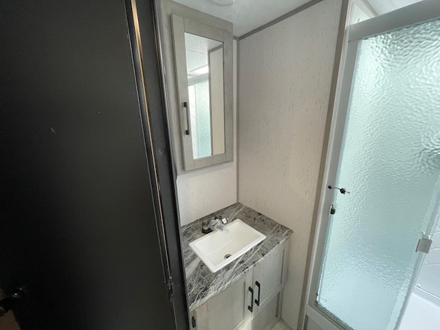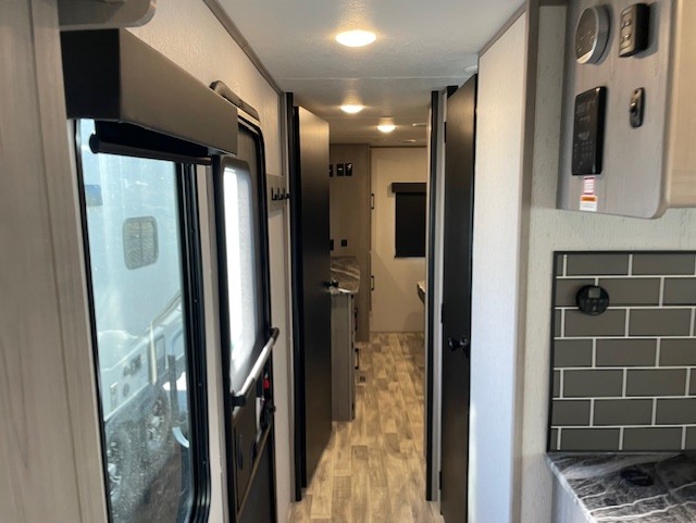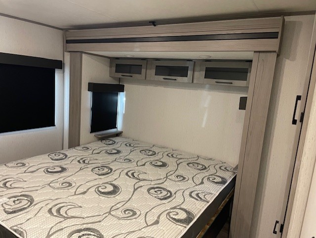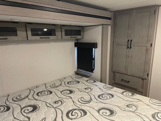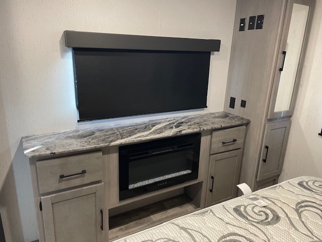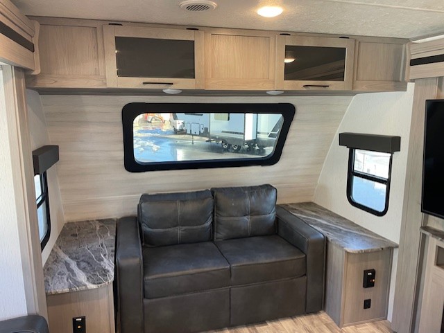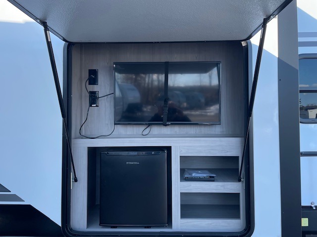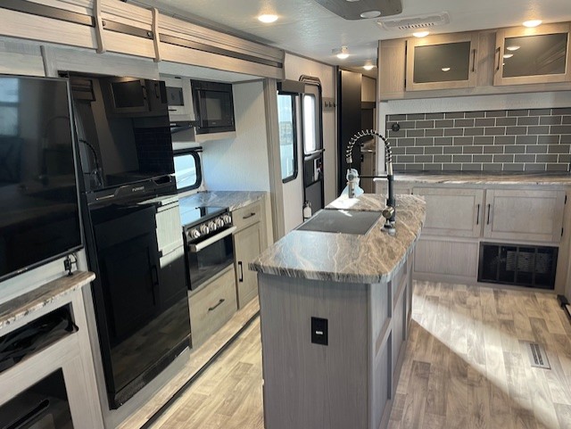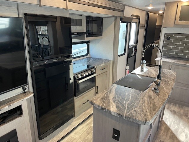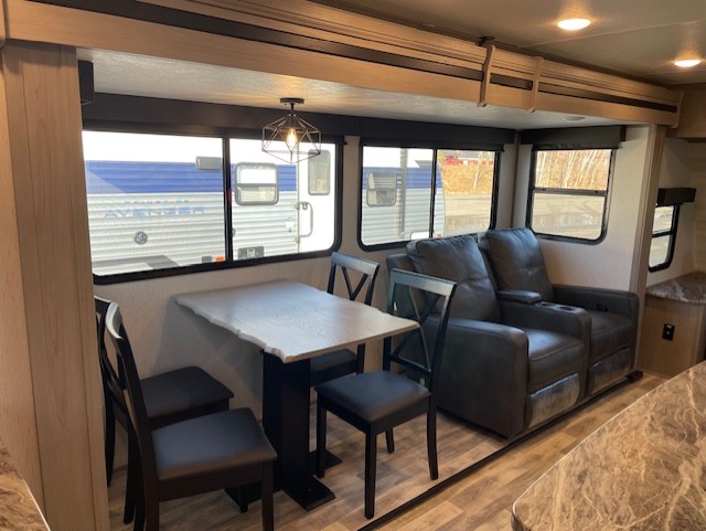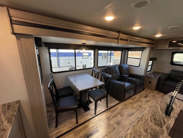 Enjoy ultimate family vacations or trips with friends in this spacious travel trailer. The dual opposing slides in the front living area open up the whole unit for a more at-home feel, and you'll find plenty of seating spaces on the theater seats, booth dinette, and sofa. The chef of the family will appreciate the extra counter space provided by the kitchen island, plus there is an extra counter with cabinets above and below for dishes and food. There is an outside kitchen that will come in handy if you like to cook breakfast outdoors, and the power awning with LED lights will provide your crew with shade as they wait for the food to be done. You and your spouse will love retreating to the rear private bedroom for bed each night. Here, the slide out king bed will provide a great night's rest, plus you will have your own fireplace and storage to hang your clothes!