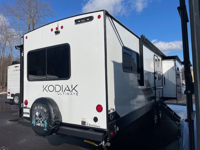 Each Kodiak Ultimate travel trailer by Dutchmen is constructed with a laminated crowned roof, a gel coat high gloss fiberglass exterior, and diamond plate front rock guard to protect your RV from rock and debris on the way to the campground. The hybrid aluminum entry steps are not only dependably, but they collapse and expand quickly so you can get on the road in no-time! These models feature HyperDeck flooring that includes fiberglass reinforced polypropolene and a fully enclosed underbelly, and the Bear Cave storage allows you to bring along all of your hiking and fishing gear. Some of the other interior features you are sure to love are the bath skylight, the living room fireplace, night shades throughout, and more. Your next adventure starts with a Kodiak Ultimate travel trailer!