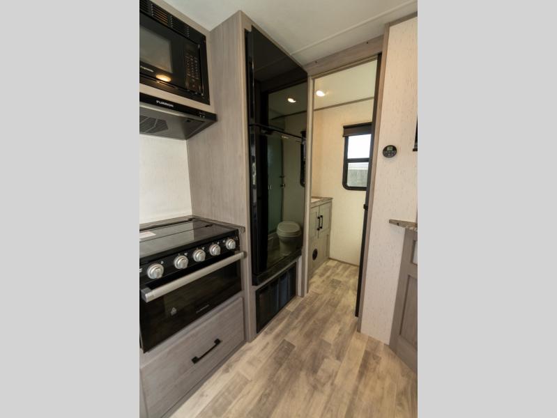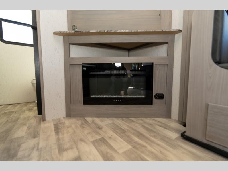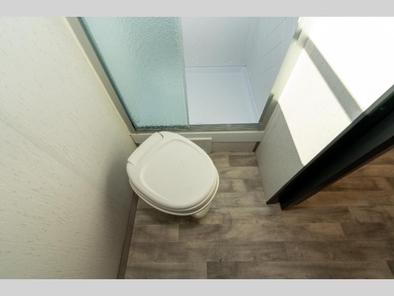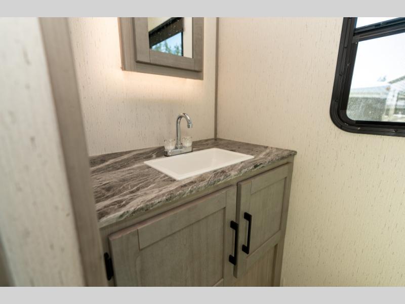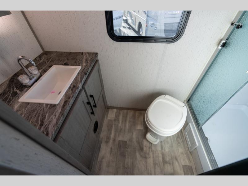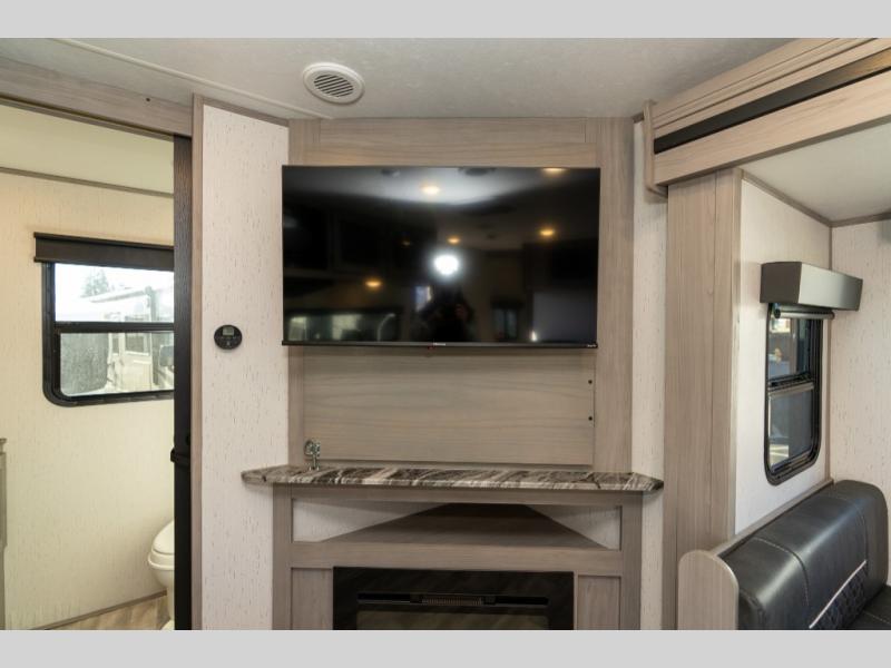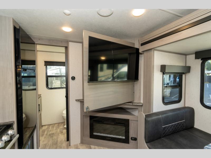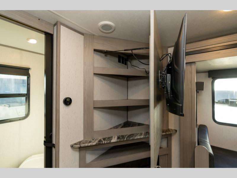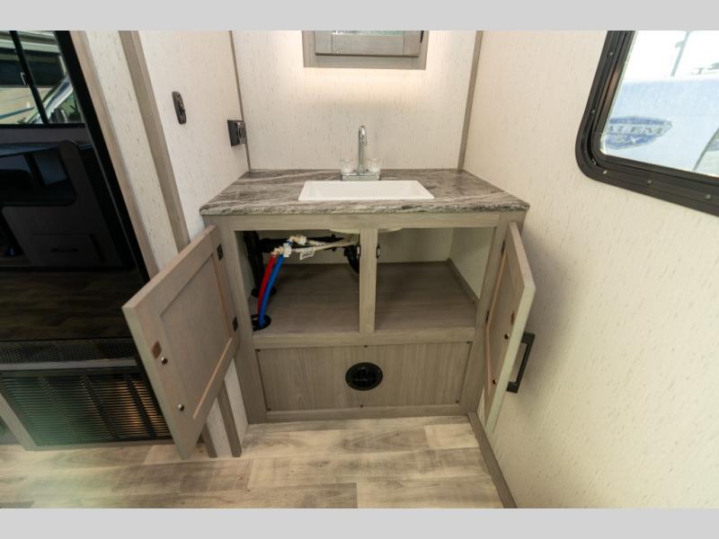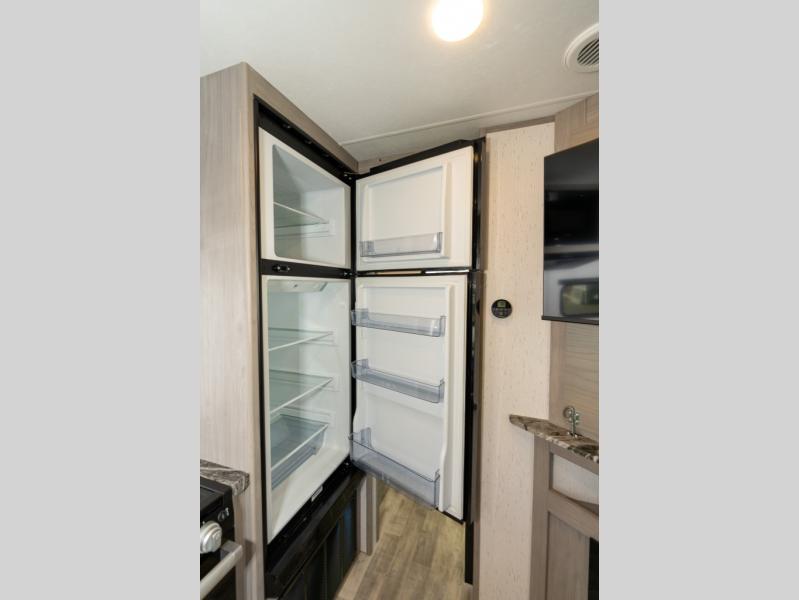 A full rear bath on board this cozy travel trailer will add privacy and convenience you won't want to camp without. The slide out in the main living area will provide plenty of space to let the chef whip up breakfast on the three burner range, and your crew can get comfy on the theater seats. The 10 cu. ft. refrigerator will allow you to pack your favorite cold ingredients, plus there is a hidden pantry behind the hinged entertainment center for smart storage spaces. This model also includes a front private bedroom with a queen bed, just like at home!