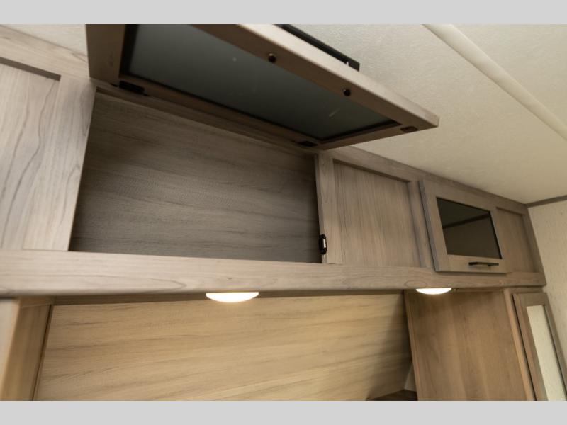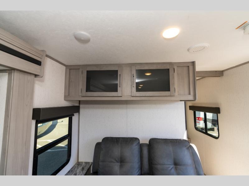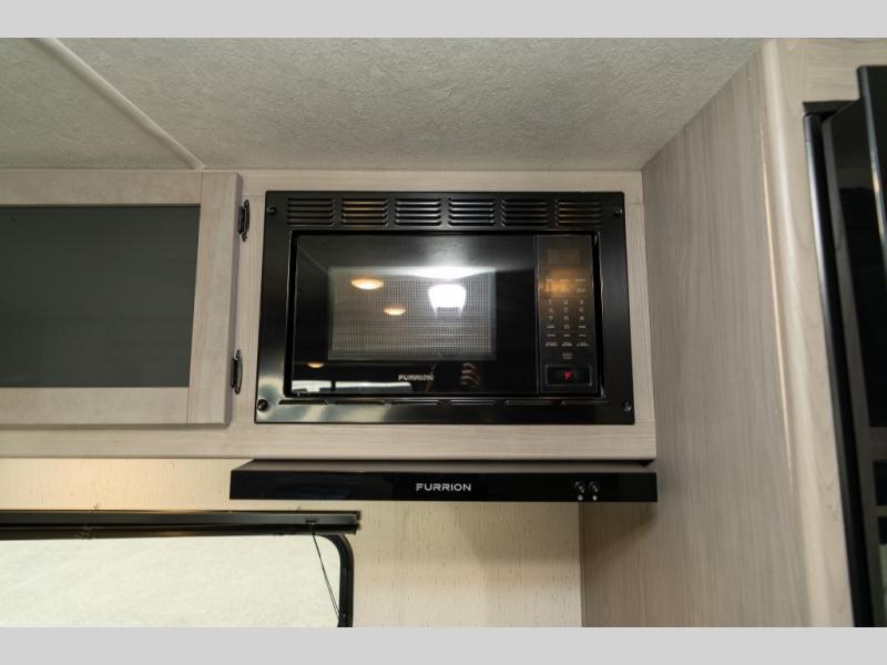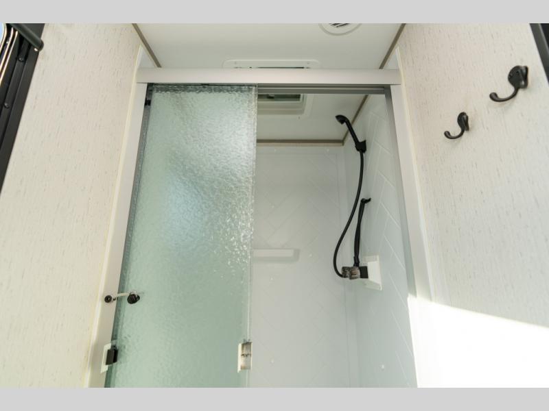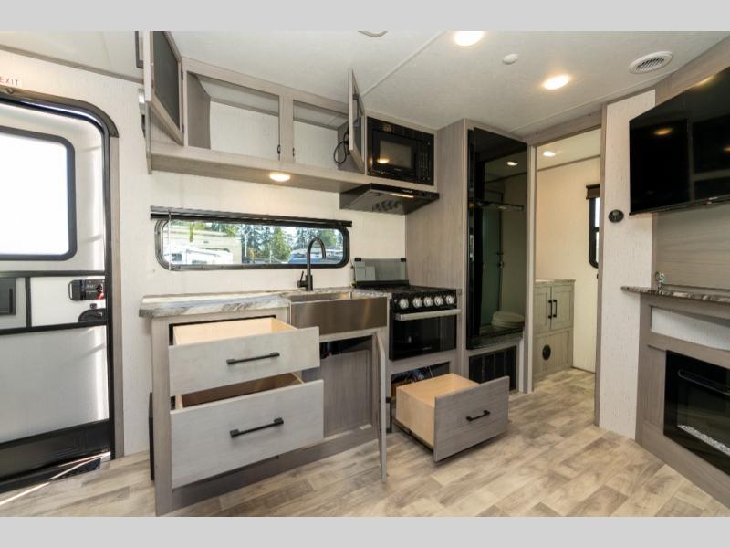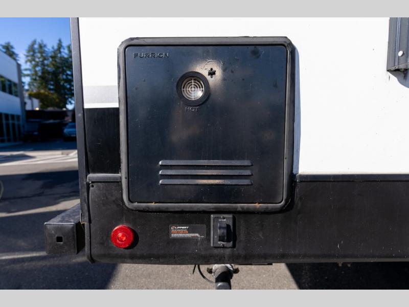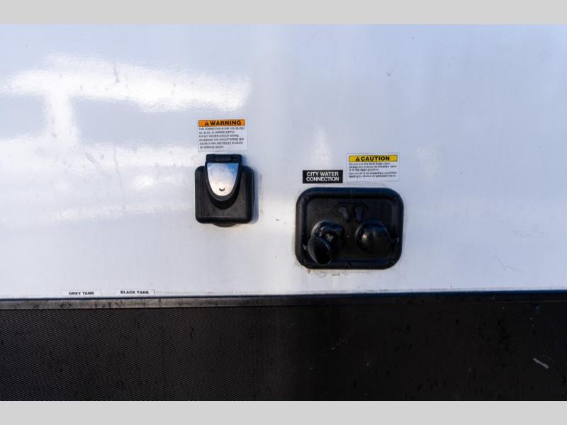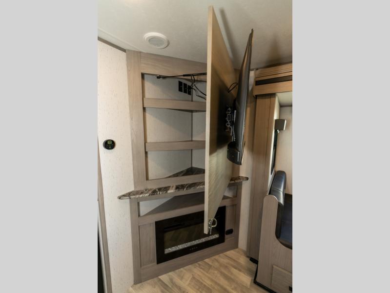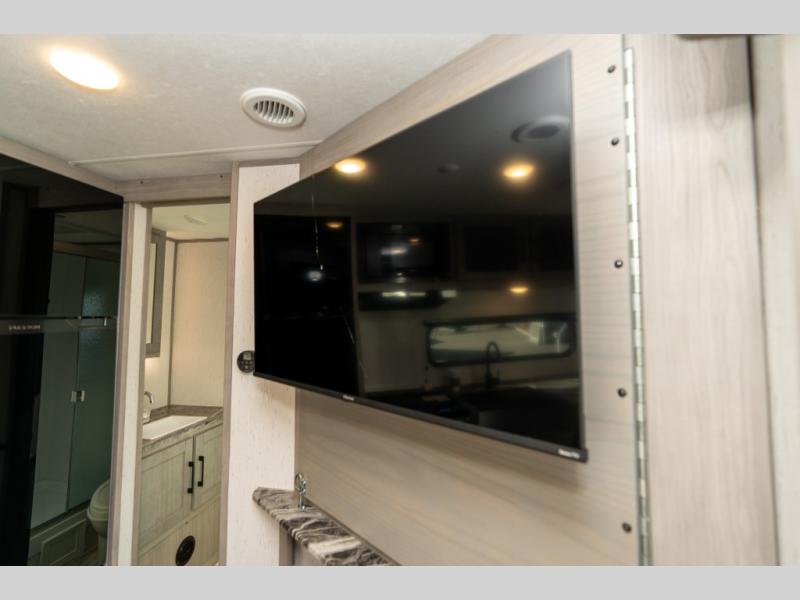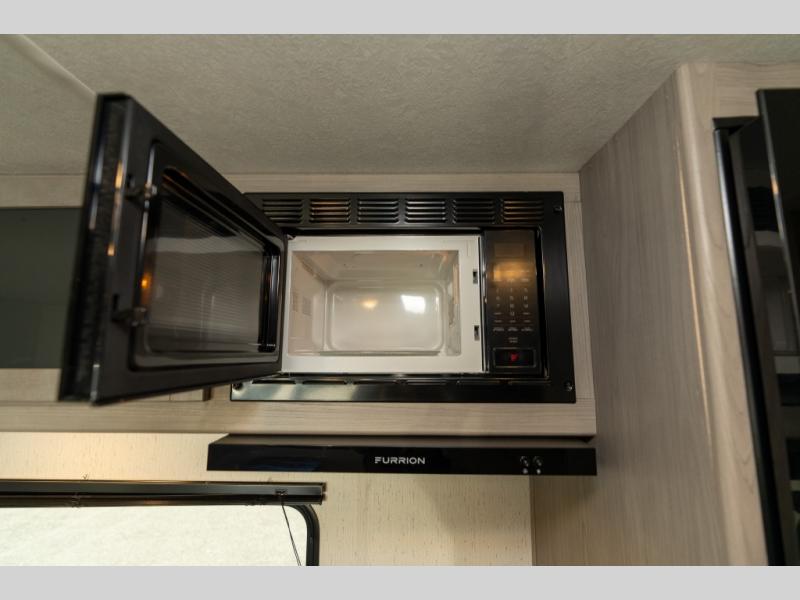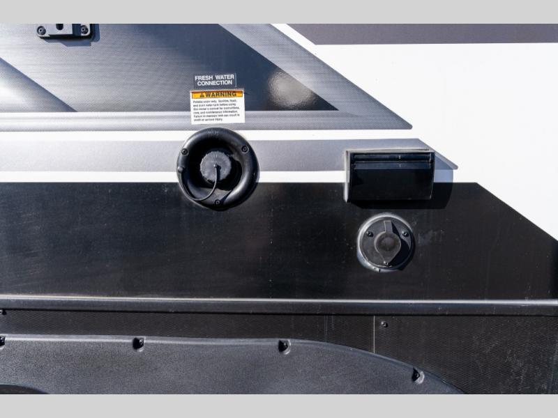 A full rear bath on board this cozy travel trailer will add privacy and convenience you won't want to camp without. The slide out in the main living area will provide plenty of space to let the chef whip up breakfast on the three burner range, and your crew can get comfy on the theater seats. The 10 cu. ft. refrigerator will allow you to pack your favorite cold ingredients, plus there is a hidden pantry behind the hinged entertainment center for smart storage spaces. This model also includes a front private bedroom with a queen bed, just like at home!