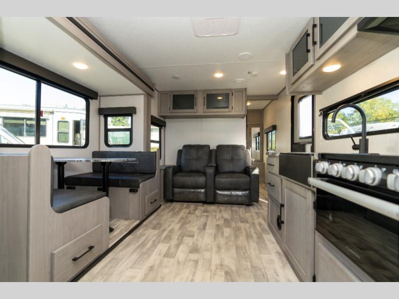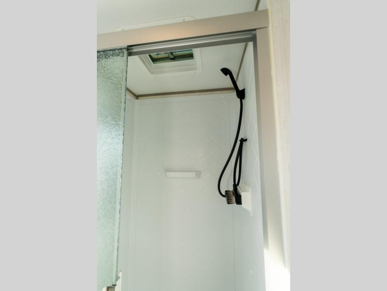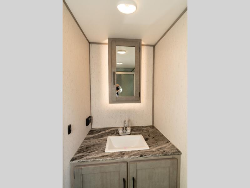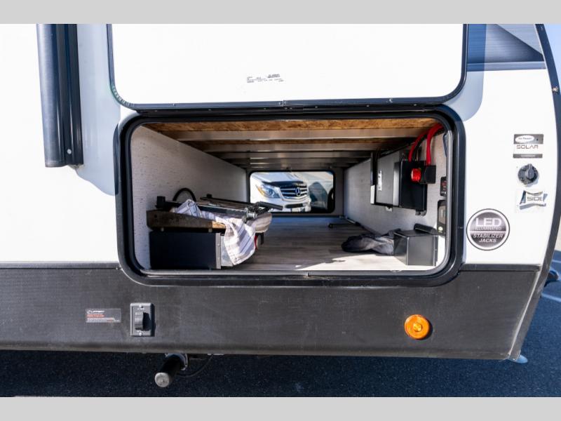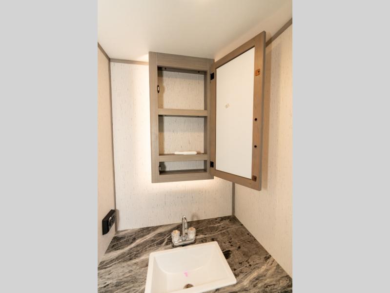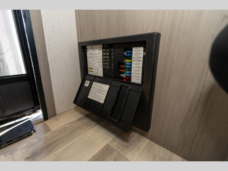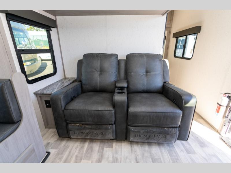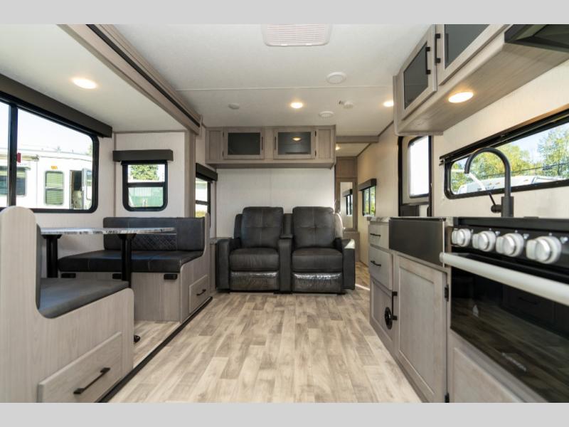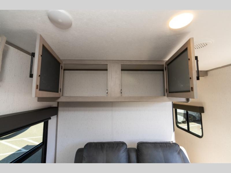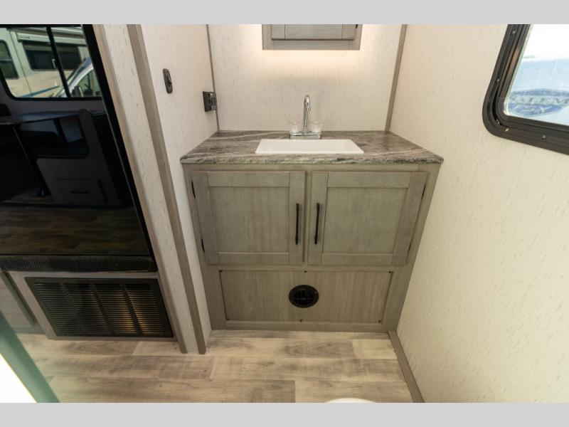 A full rear bath on board this cozy travel trailer will add privacy and convenience you won't want to camp without. The slide out in the main living area will provide plenty of space to let the chef whip up breakfast on the three burner range, and your crew can get comfy on the theater seats. The 10 cu. ft. refrigerator will allow you to pack your favorite cold ingredients, plus there is a hidden pantry behind the hinged entertainment center for smart storage spaces. This model also includes a front private bedroom with a queen bed, just like at home!