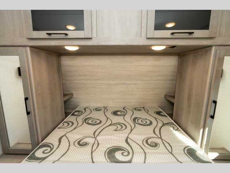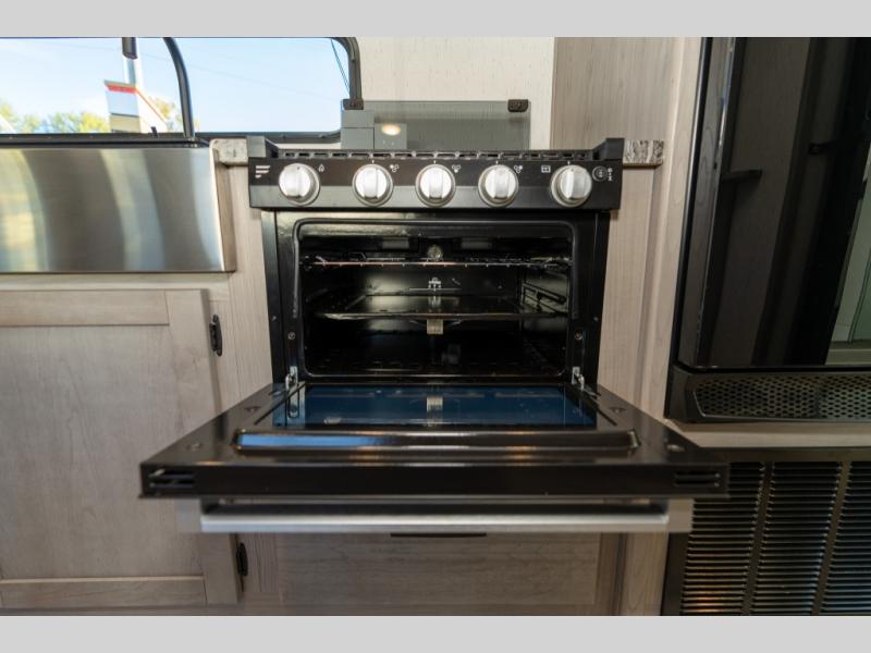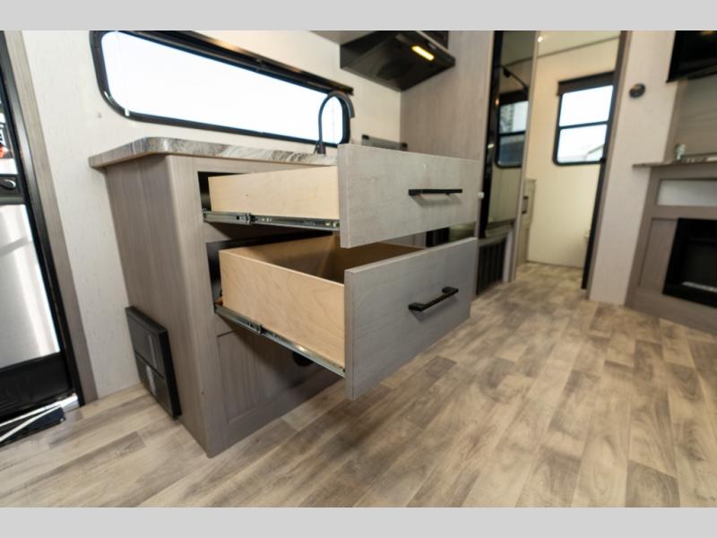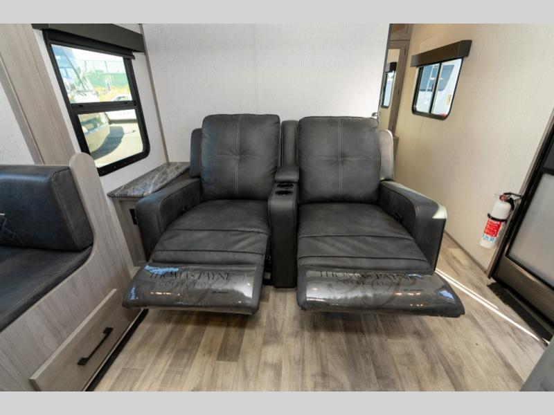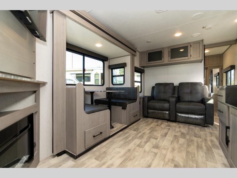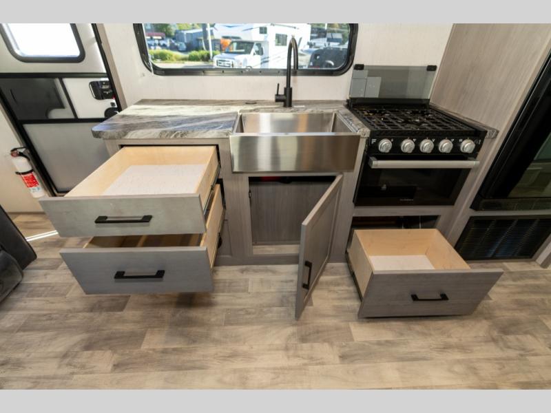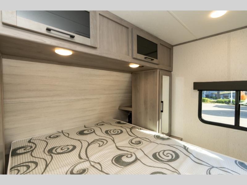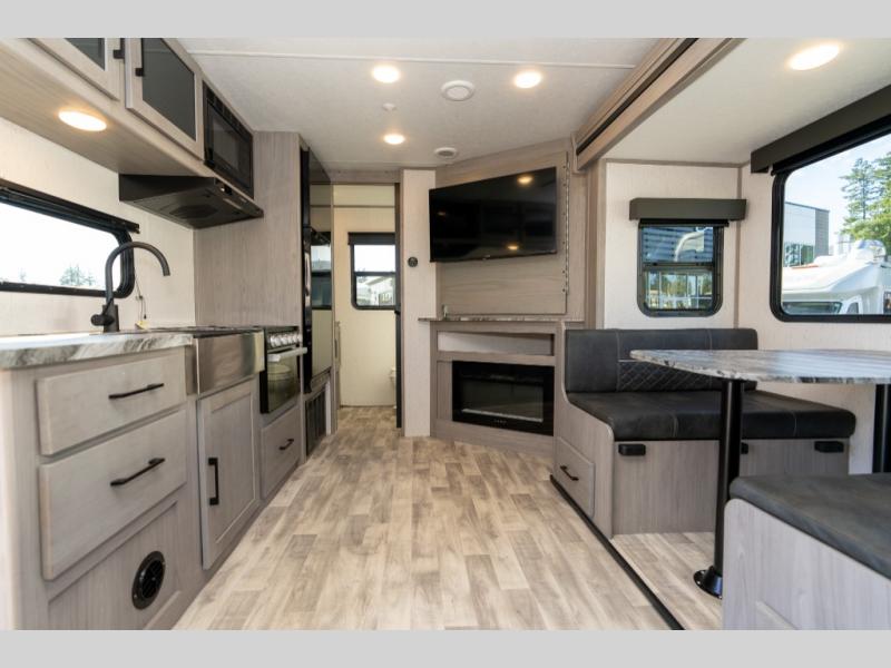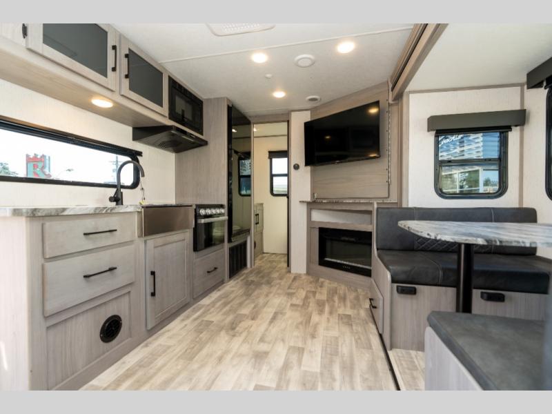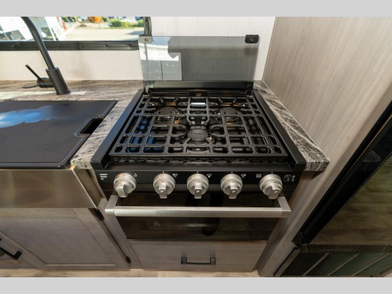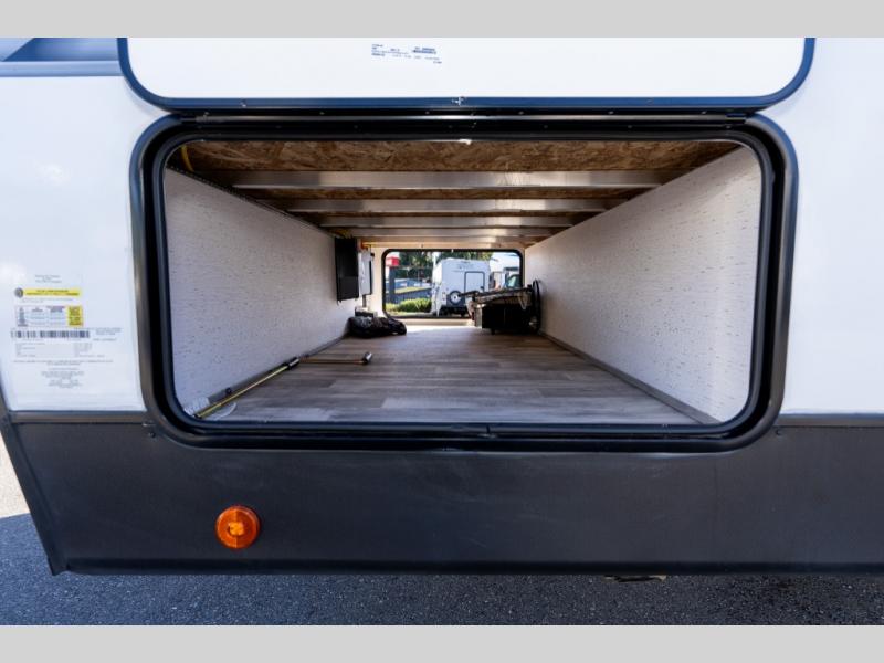A full rear bath on board this cozy travel trailer will add privacy and convenience you won't want to camp without. The slide out in the main living area will provide plenty of space to let the chef whip up breakfast on the three burner range, and your crew can get comfy on the theater seats. The 10 cu. ft. refrigerator will allow you to pack your favorite cold ingredients, plus there is a hidden pantry behind the hinged entertainment center for smart storage spaces. This model also includes a front private bedroom with a queen bed, just like at home!