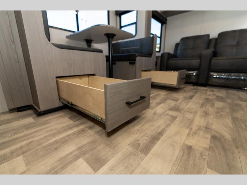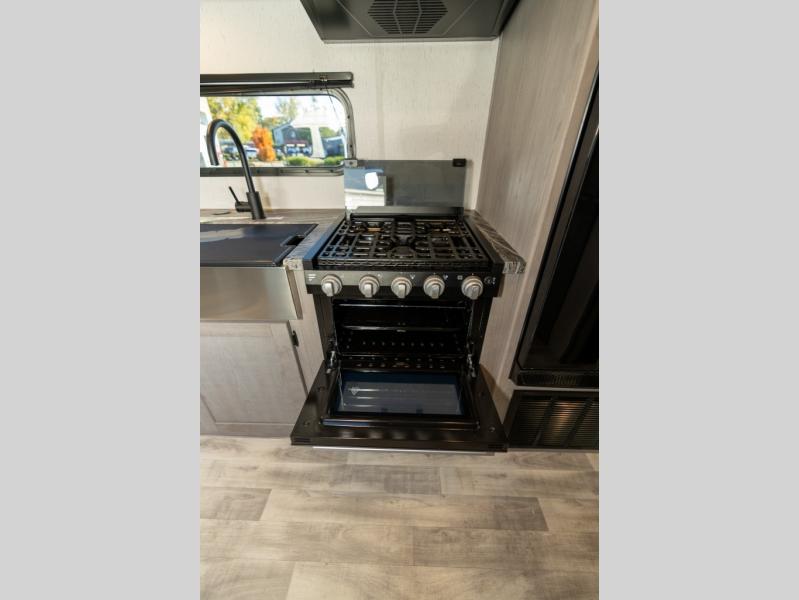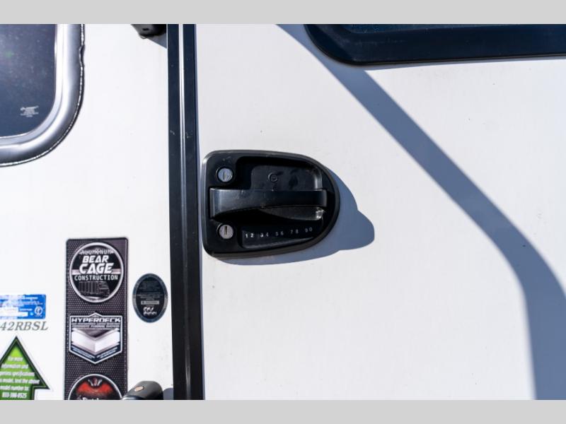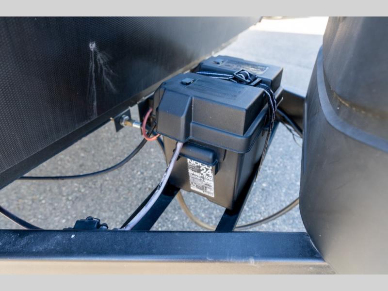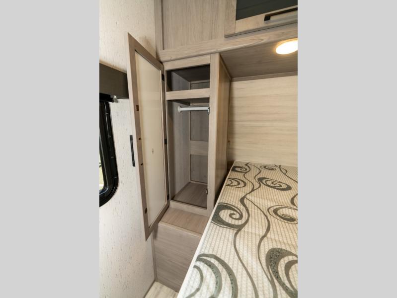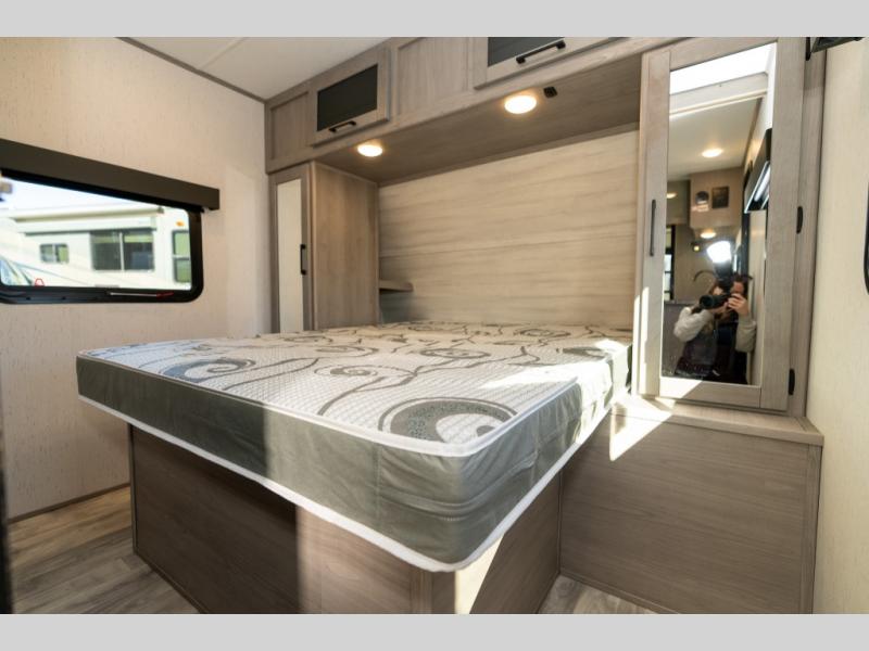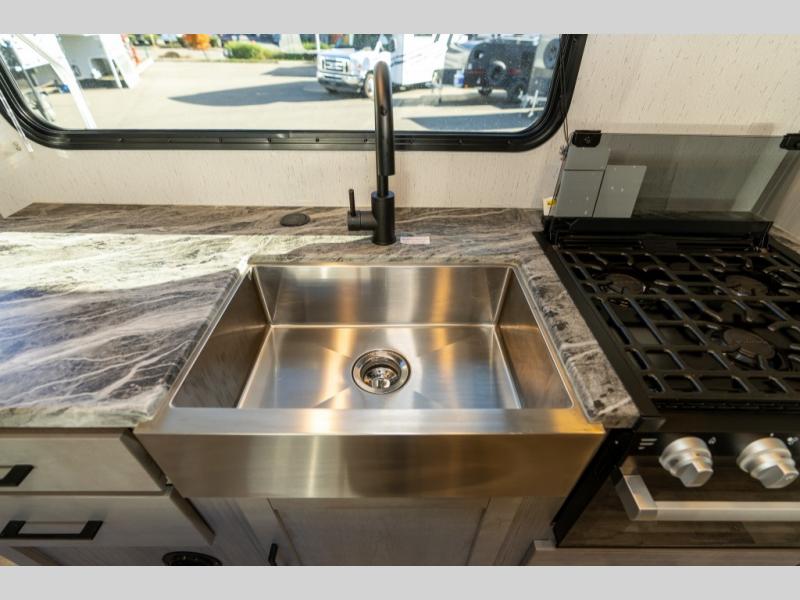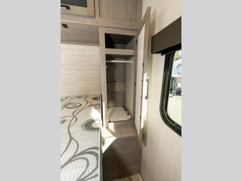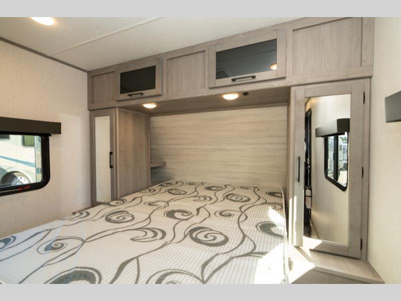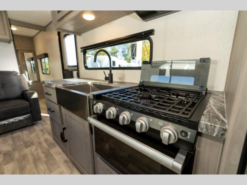 A full rear bath on board this cozy travel trailer will add privacy and convenience you won't want to camp without. The slide out in the main living area will provide plenty of space to let the chef whip up breakfast on the three burner range, and your crew can get comfy on the theater seats. The 10 cu. ft. refrigerator will allow you to pack your favorite cold ingredients, plus there is a hidden pantry behind the hinged entertainment center for smart storage spaces. This model also includes a front private bedroom with a queen bed, just like at home!