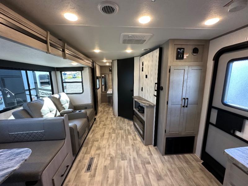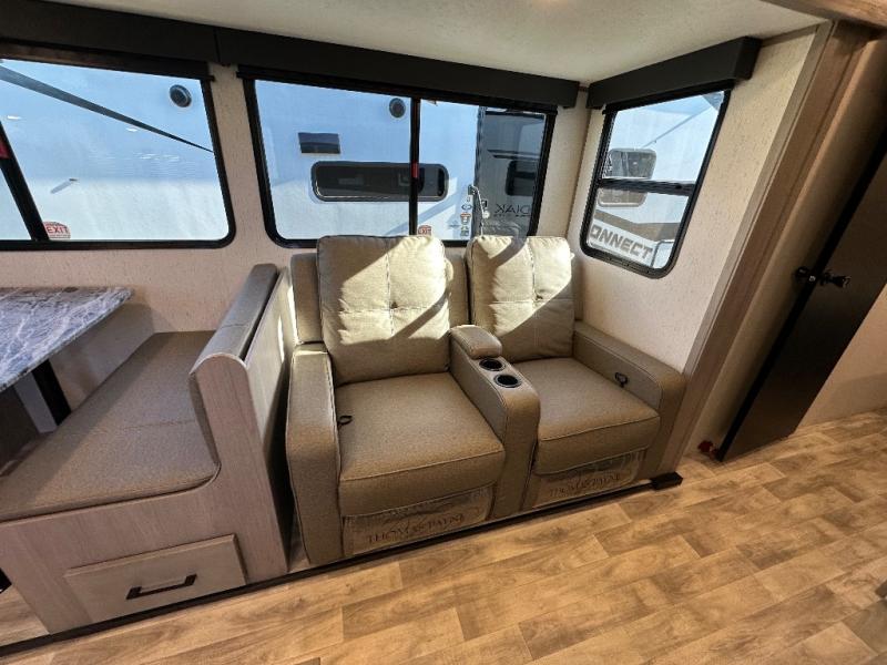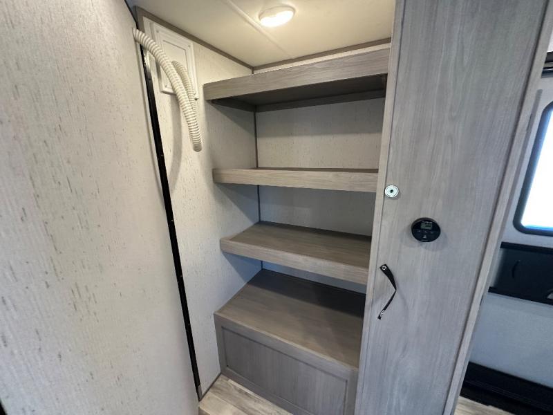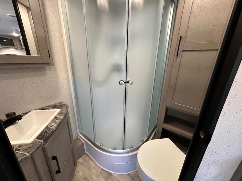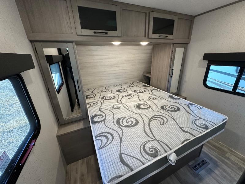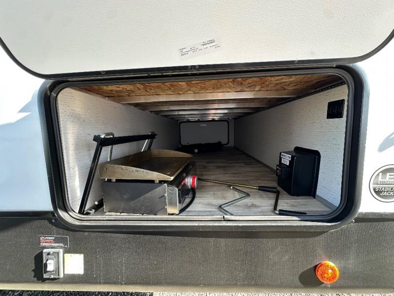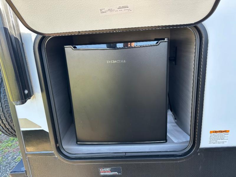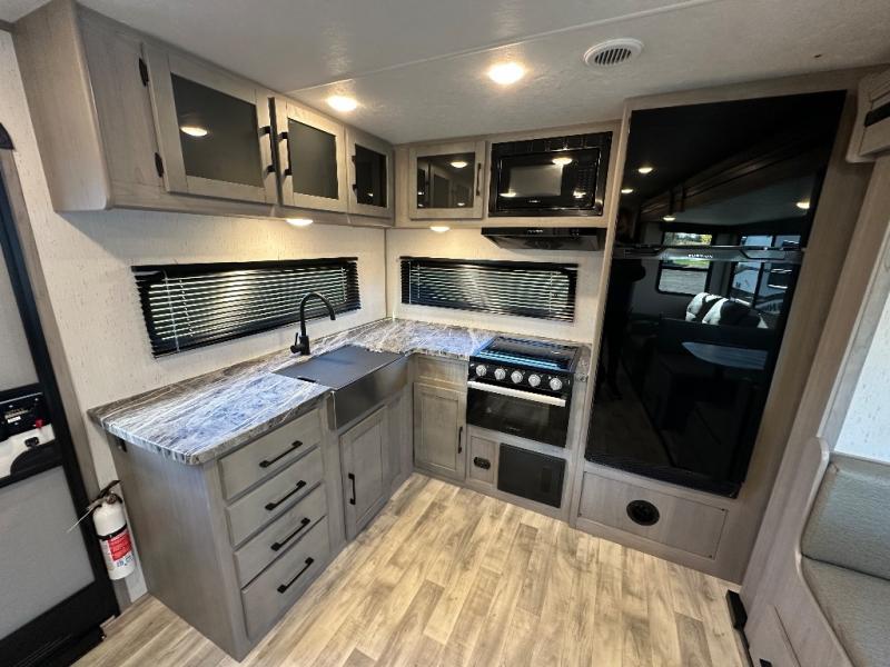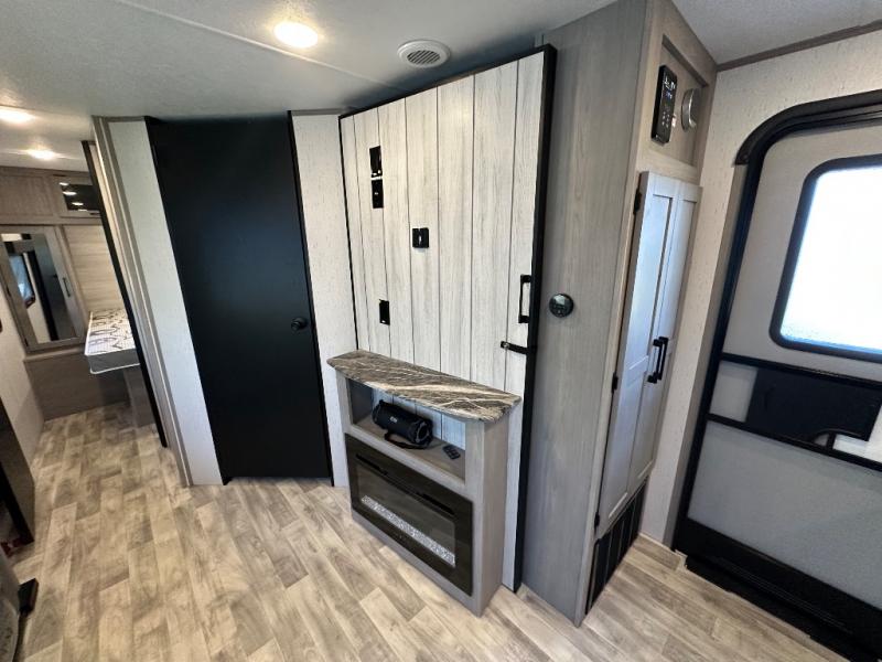 Trips to the lake are made complete in this travel trailer for three. You will love the amount of space you have thanks to the large slide out, and here you can dine at the booth dinette or relax on the theater seating. There is a fireplace right across from the furniture and a hinged entertainment center with a hidden pantry behind it for snacks. Head to the rear kitchen to prepare dinner on the three burner range with an oven, or you may just decide to cook on the outside kitchen! You'll also find a pass-through storage outside and an 18' power awning with LED lights that will allow you to stay out past dark. And when you're ready for some shut-eye, the queen bed in the private bedroom will be calling your name!