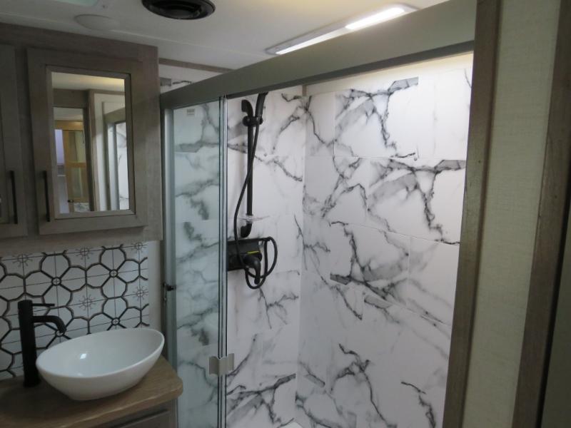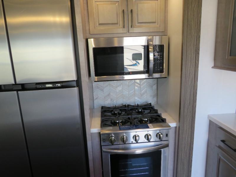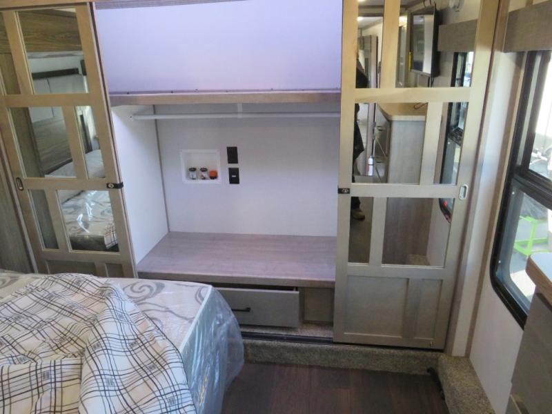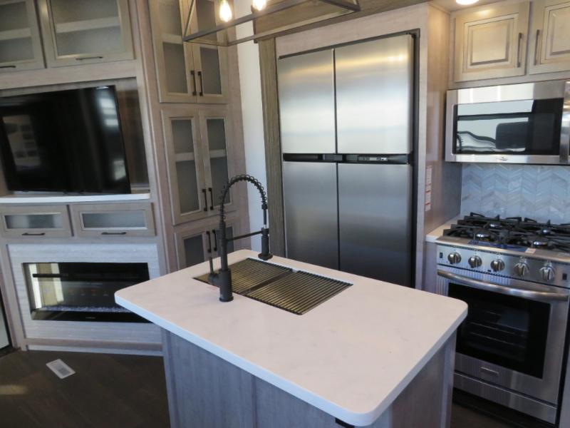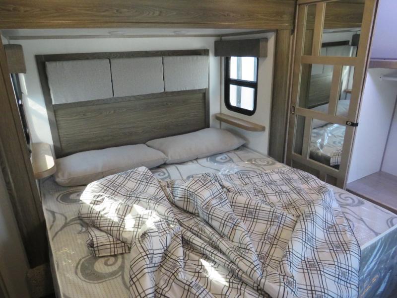 The whole family will have a fun time camping in this toy hauler! The front private bedroom will have you feeling right at home with the king bed slide and front wardrobe, plus access to the dual entry bathroom which has a shower with a luxury teak seat. Keep everyone's bellies full with the kitchen island and Furrion three burner range with 21" oven, and enjoy the meals at the opposing sofas with table in between in the 11' garage. Relax each night in true comfort on the sofa slide across from the entertainment center or head to the outside entertainment center. The garage area also has a loft for extra sleeping, a half bathroom, a lay flat Happi-Jack power bunk, and one of the dual entry doors to the unit!