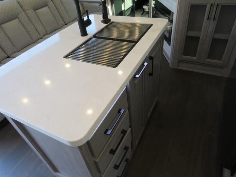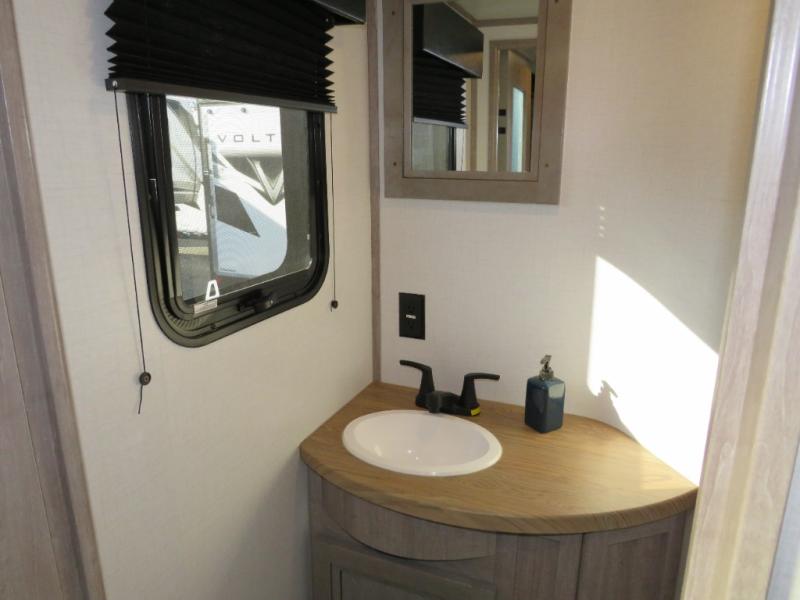 The Dutchmen Voltage toy hauler is an amazing RV that won't disappoint! These elegant units have more durability and luxury than you ever thought possible. They include an All Weather Package, 16" custom wheels, a gel-coat fiberglass exterior finish, MorRyde CRE 3000 suspension, Secure Stance entry steps, and a second fuel tank for a total of 60 gallons. There is a second power awning over the garage entry door, and you will even find a third awning above the ramp patio. The tinted frameless windows will protect you from outside prying eyes and harsh sunlight, and the interior solid-surface countertops in the kitchen will withstand many years of chopping and dicing. You'll also have a 12" diamond plate in the garage for protection, and there is an aluminum four-step entry that leads right into the garage.