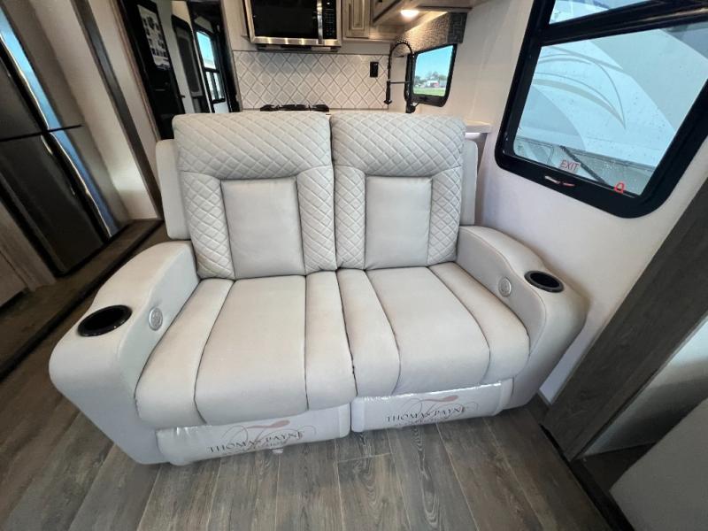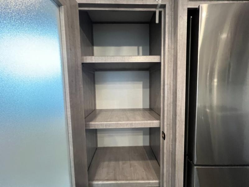 This Voltage toy hauler is going to get you pumped to start traveling! You will have your own master suite in the front which has private access to the dual-entry bathroom, and you can offer a guest suite with half bathroom, power bunk, sofas, TV, and exterior entry to your friends or family. A loft bed adds even more sleeping space, and you'll have a great relaxation area with the three sofas in the main living room. A pantry sits next to the 18-cubic foot refrigerator for food storage, and the rest of the kitchen appliances will help you prepare dinner in a flash.