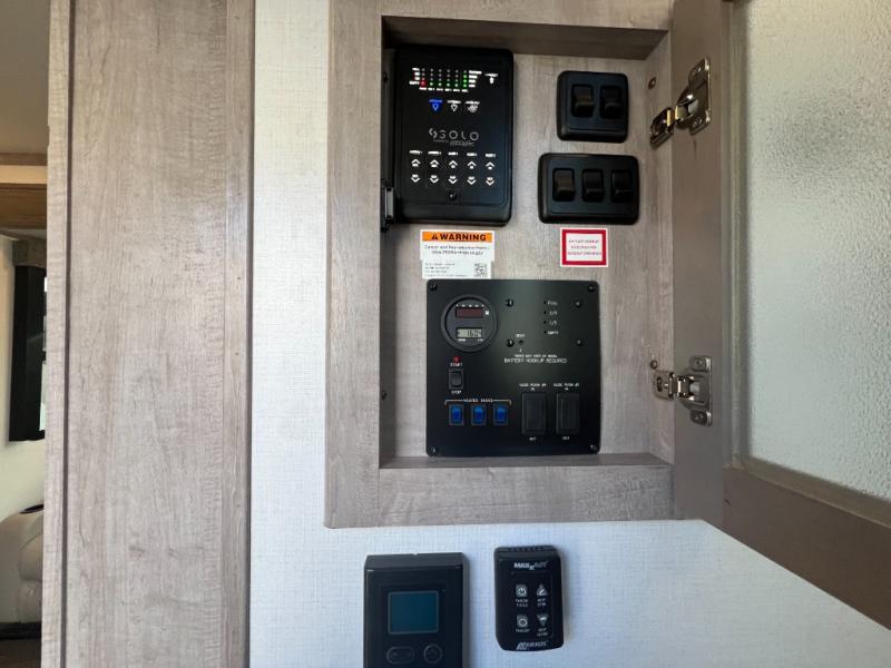 The Dutchmen Voltage toy hauler is an amazing RV that won't disappoint! These elegant units have more durability and luxury than you ever thought possible. They include an All Weather Package, 16" custom wheels, a gel-coat fiberglass exterior finish, MorRyde CRE 3000 suspension, Secure Stance entry steps, and a second fuel tank for a total of 60 gallons. There is a second power awning over the garage entry door, and you will even find a third awning above the ramp patio. The tinted frameless windows will protect you from outside prying eyes and harsh sunlight, and the interior solid-surface countertops in the kitchen will withstand many years of chopping and dicing. You'll also have a 12" diamond plate in the garage for protection, and there is an aluminum four-step entry that leads right into the garage.