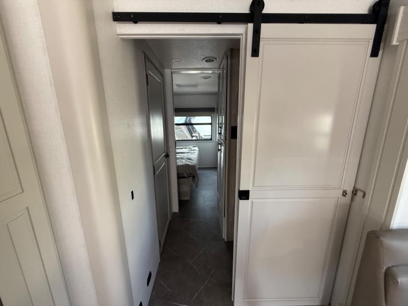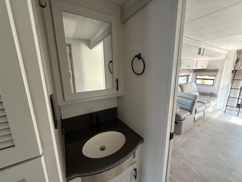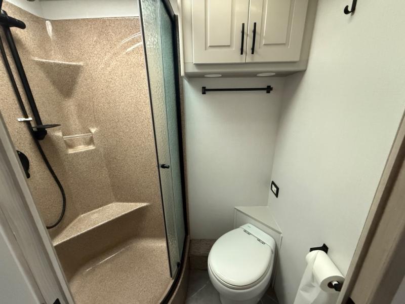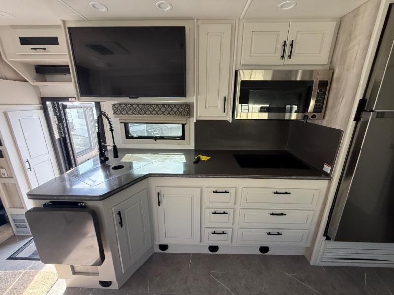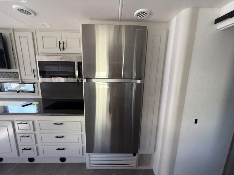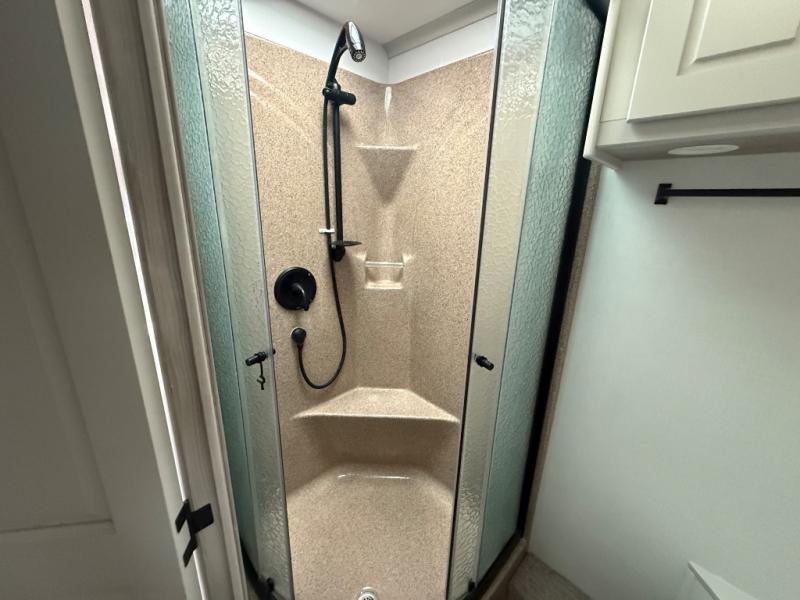 Check out the fabulous features found in this DX3 Super C diesel motorhome! As you spend your nights relaxing in the rear private bedroom, you will appreciate having a 32" LED Smart TV to watch before drifting off to sleep. The fiberglass shower with glass door and skylight will be wonderful to see in the morning, and the Oxygenics Body Spa shower head will deliver an enjoyable experience. Step foot into the kitchen and be amazed by the home-like conveniences that have been included, like the 18-cubic foot residential refrigerator with an ice maker, the convection microwave, the pantry, and the under-cabinet lighting.
