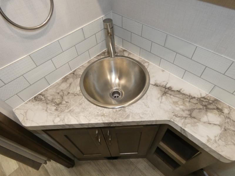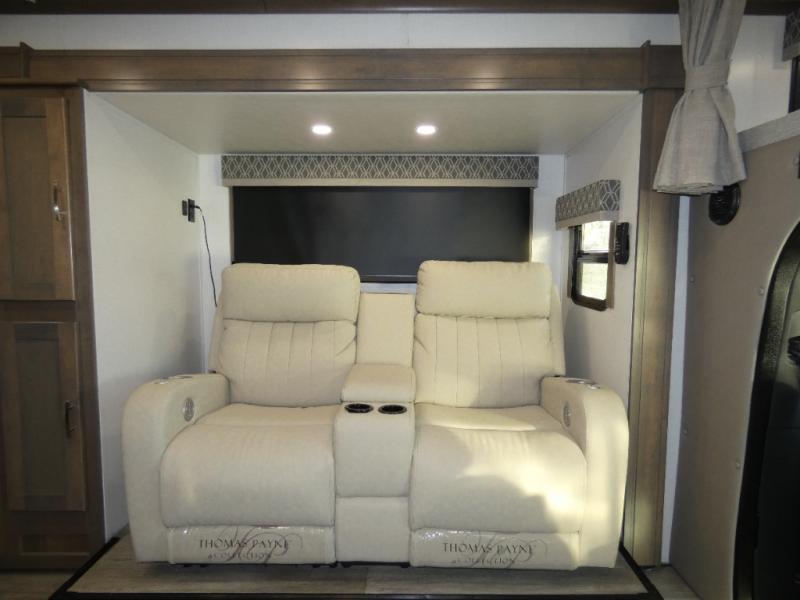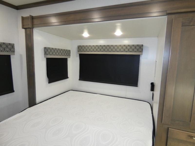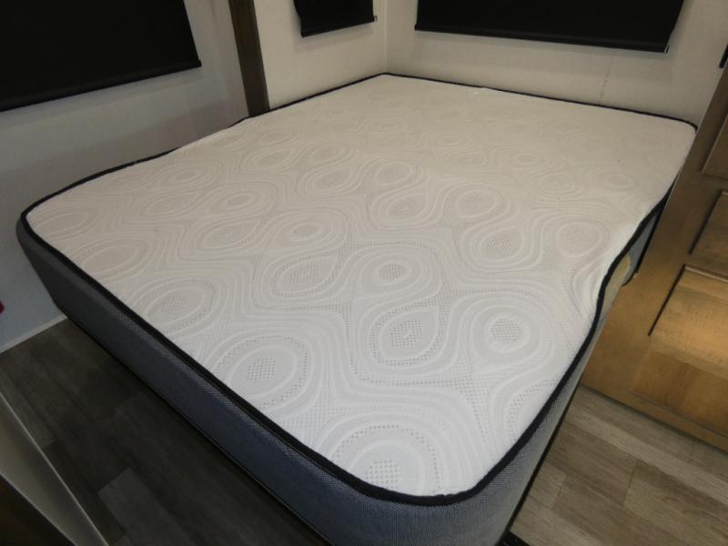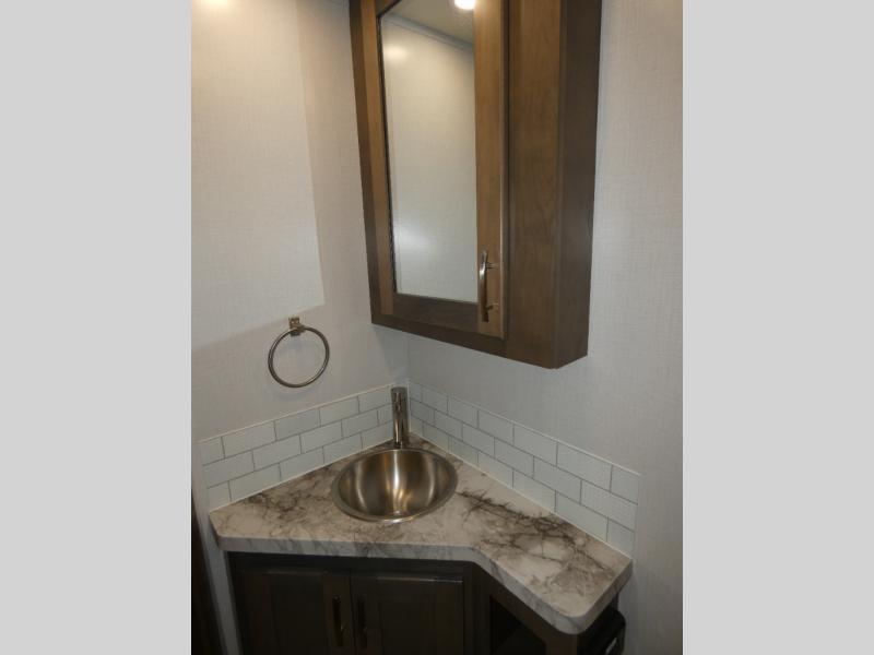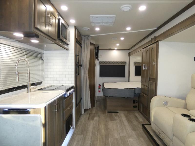 Take this motorhome on your greatest adventures yet! Start each morning feeling well rested after sleeping on the corner queen bed then head to the rear corner bathroom to freshen up in the shower with an Oxygenics body spa RV shower head and a skylight above for added headroom and natural lighting. Now that you're ready for the day, you can grab some eggs from the 6 cu. ft. double door refrigerator and fry them up on the three burner cooktop then enjoy them at the booth dinette. The kitchen also has a countertop extension for more meal prepping space and a convection microwave oven to pop a bag of popcorn before watching your favorite movies on either the living room 32" LED TV or the 32" LED smart TV across from the bed. You could even switch things up by replacing the booth dinette with an optional 3-seat power recliner, and adding a cab over bunk option!