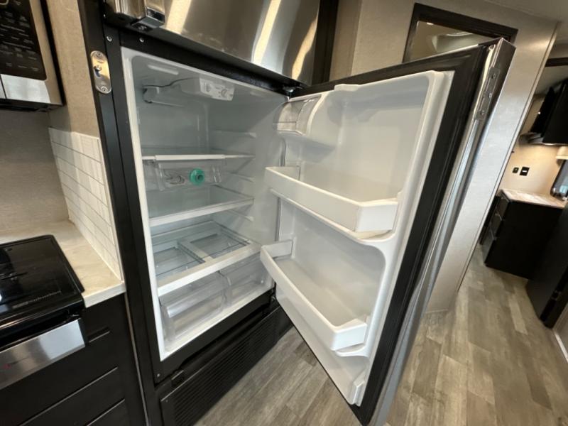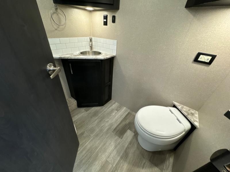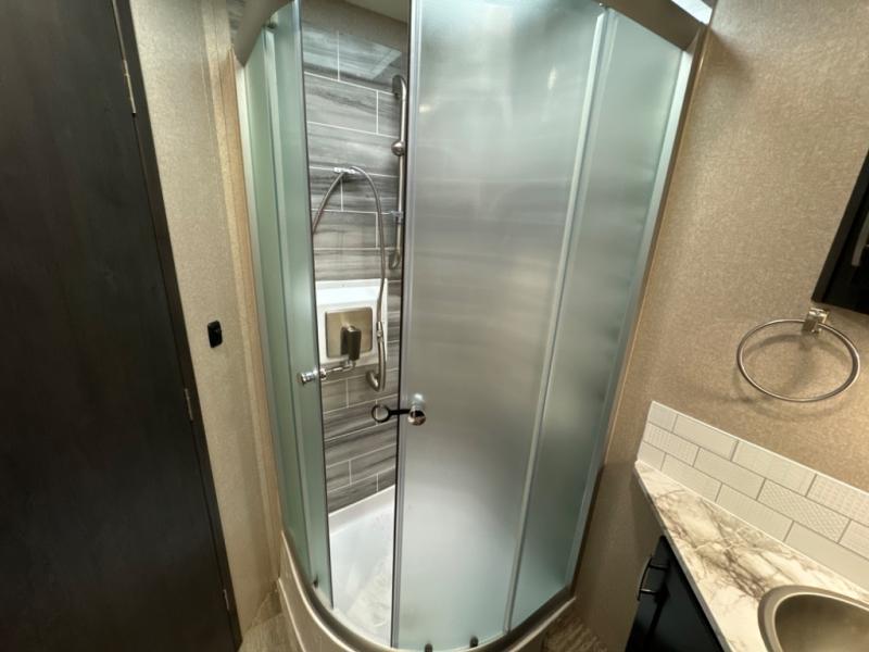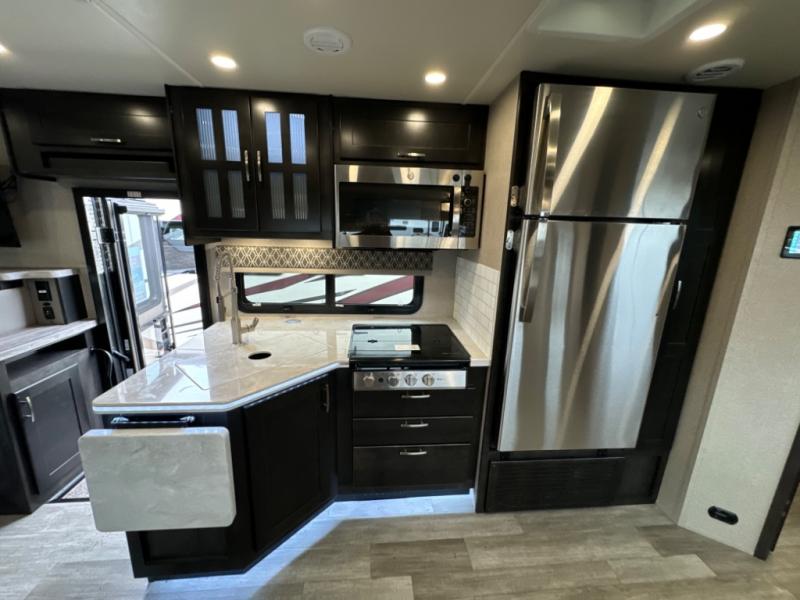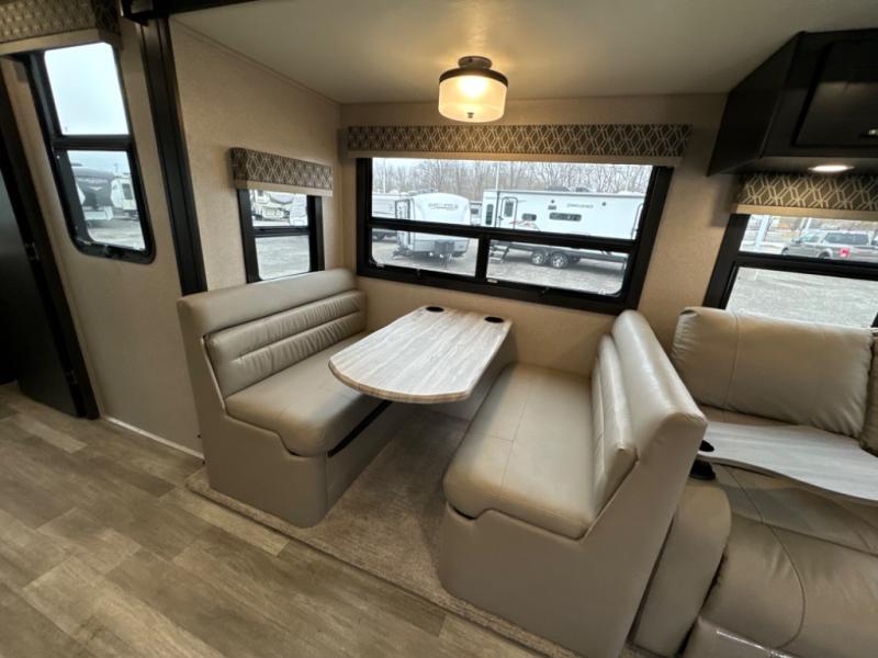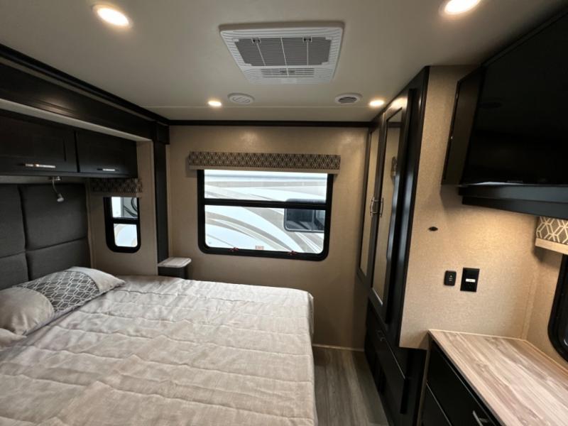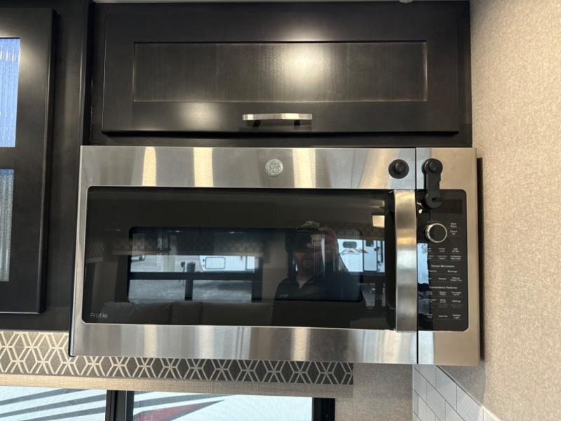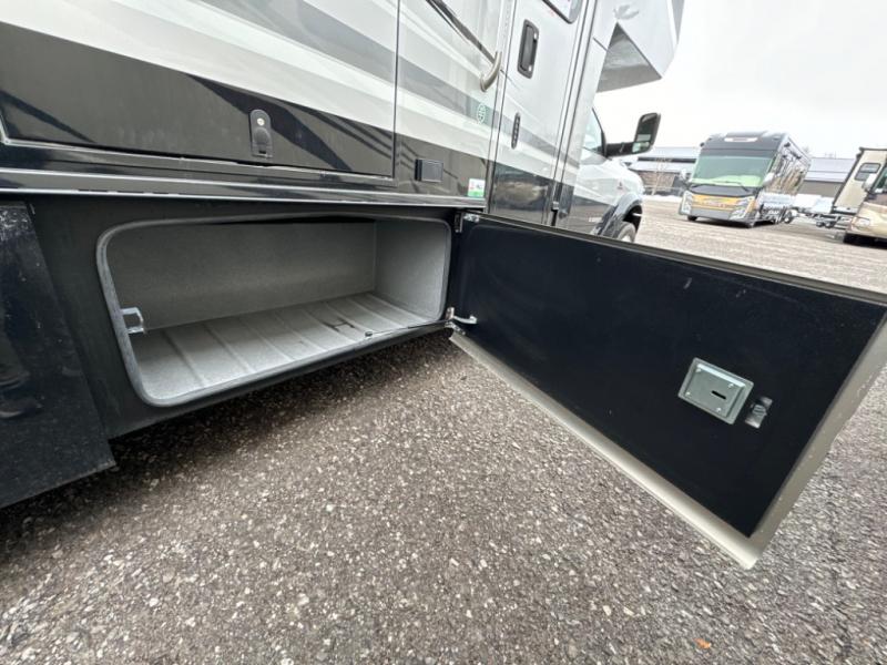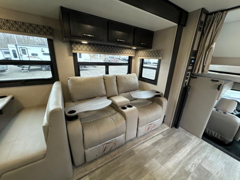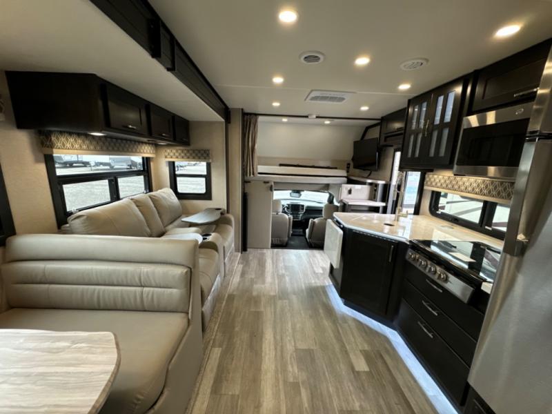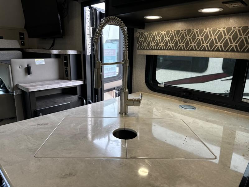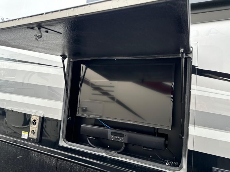 If you want a spacious and luxurious RV getaway, then you need this motorhome! The rear private bedroom has a gel-infused memory foam 71" x 78" king bed slide to relax on while you watch a movie with the 32" LED smart TV, as well as two wardrobes to keep your clothes looking their best. The chef can whip up their best home cooked meals with the three burner gas range, the 16 cu. ft. residential refrigerator with ice maker, and the countertop extension or you can simply throw some leftovers into the convection microwave and enjoy it at the booth dinette. The bunk over cab offers a comfortable sleeping space, and the sofa can also transform into an extra sleeping space or you can switch it out for the optional theater seating instead. Store all of your outdoor gear in the exterior seamless rotocast storage compartments with LED lighting, watch the big game with the exterior 32" TV, and stay protected by the 16' dual-pitch armless awning!