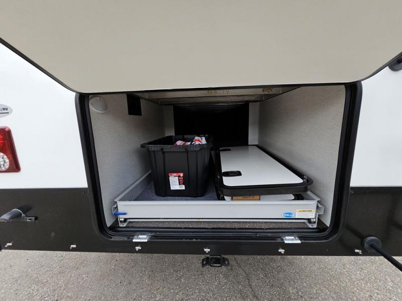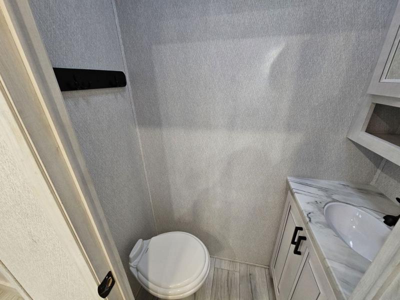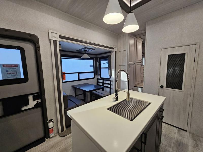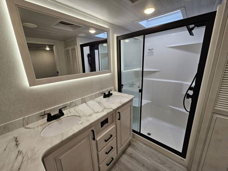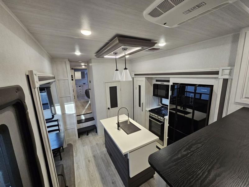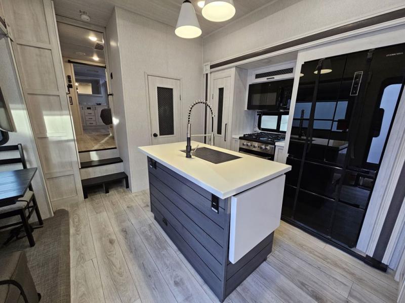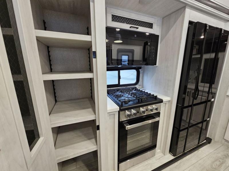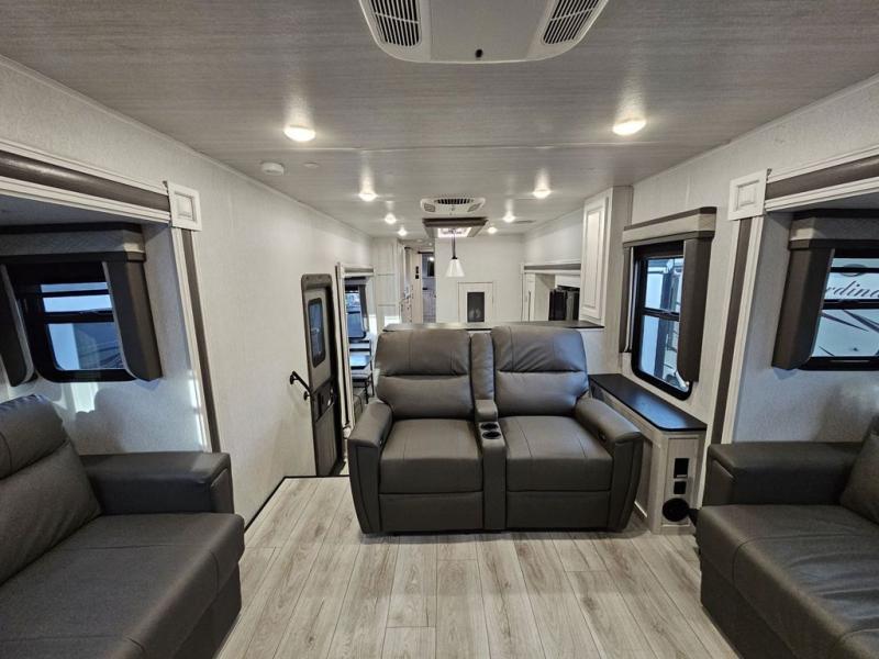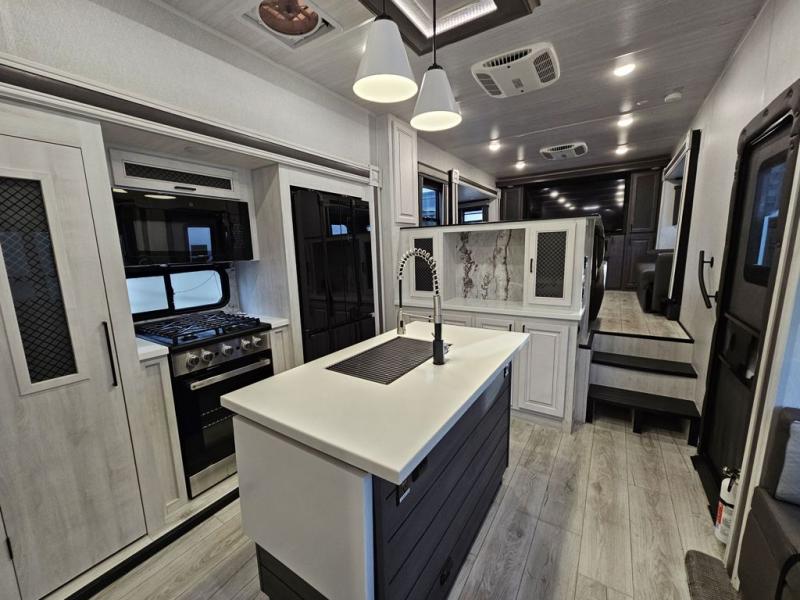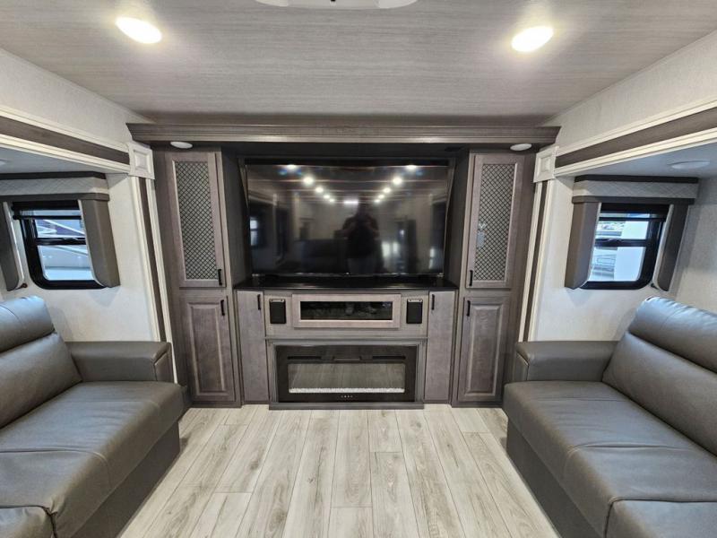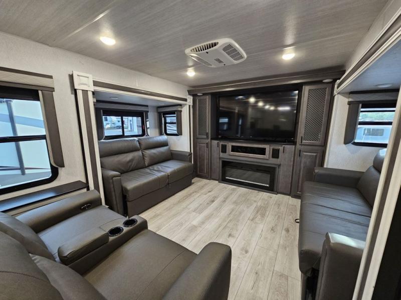 If you've been looking for a luxury fifth wheel to call your new home away from home, take a look at this Ahara! The front living area will be a favorite hangout spot with its dual hide-a-bed sofa, theater seating, and 65" TV with a fireplace. And since there are dual opposing slides here, your guests will have plenty of space to fold down the sofas at night for a great night's rest. If you're looking for your bedroom, head to the back and you'll enjoy a king bed slide out, a dresser with TV prep, two closets, plus your own full rear bath. The dual bath sinks are sure to come in handy when you're both getting ready for bed, and the spacious shower with a skylight will provide natural light as you clean up in the morning. There is even a closet with washer and dryer prep if you plan to go full-time. In the morning you can prepare breakfast on the four burner cooktop or in the 30" over-the-range residential microwave, and the 16 cu. ft. 12V French door refrigerator includes a double drawer freezer to hold more food. There is a free-standing dinette with a storage ottoman here, a hutch to store nice dishes, and the half bath is located off of this room for convenience!