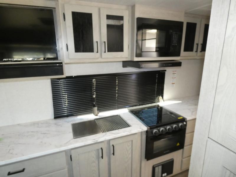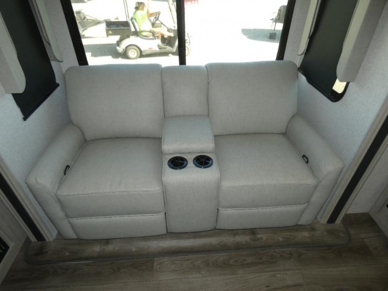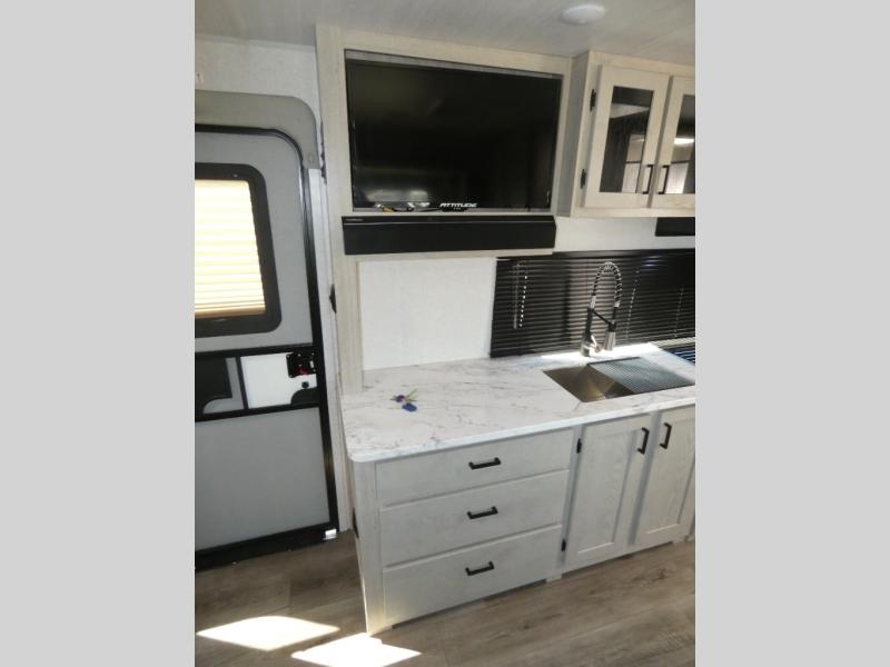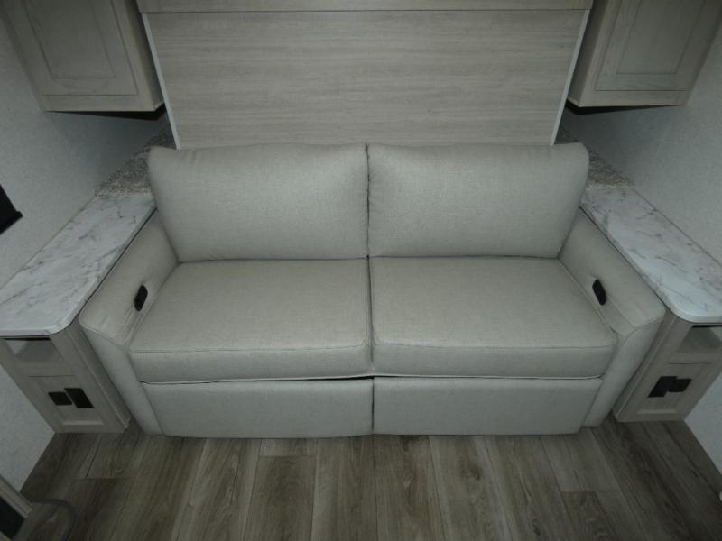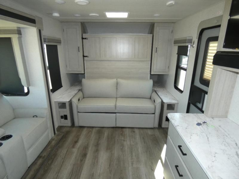 If you're looking for the perfect couple's trailer for weekend getaways you've found it in this Alta model. The queen Murphy bed up front can be folded up in the morning so you can relax on the sofa, or you may just want to enjoy your coffee on the theater seats. Your meals can be prepared on the three burner cooktop or in the microwave oven, and you can dine outdoors under the 16' power awning. This model also includes a universal docking station for an all-in one location for you hookups and utilities. How convenient!