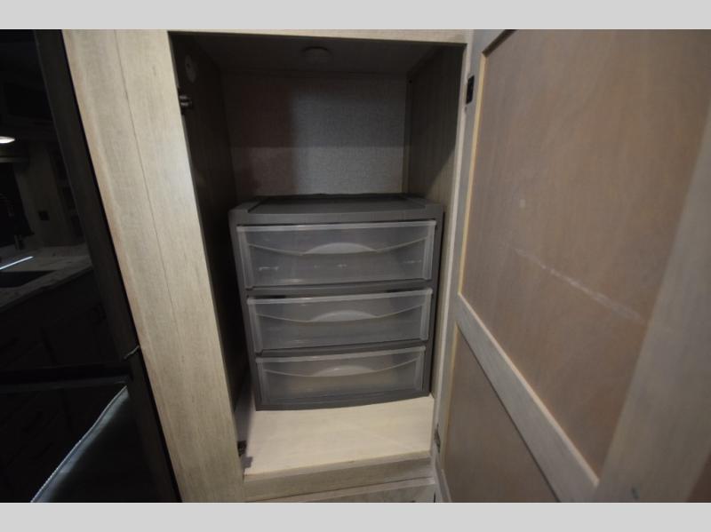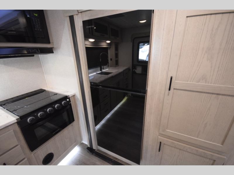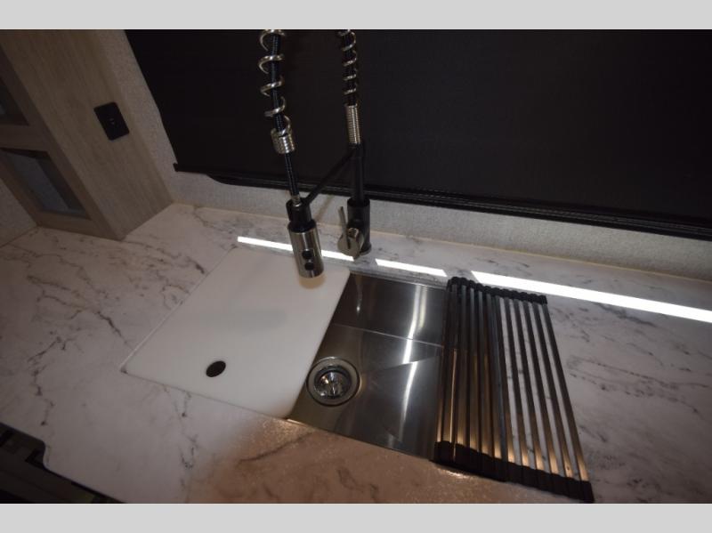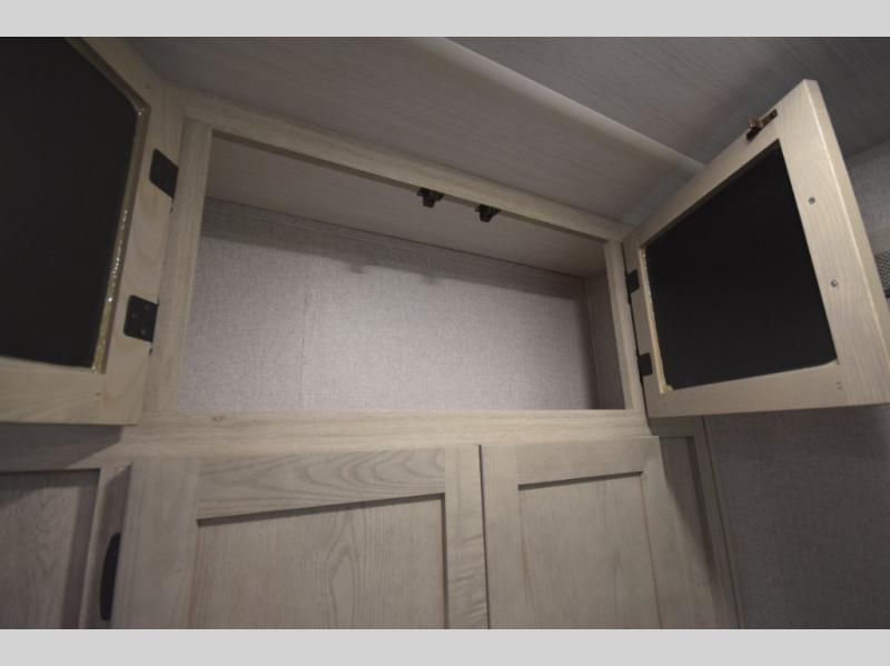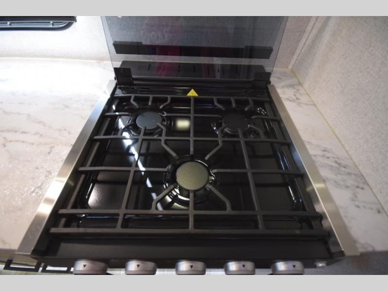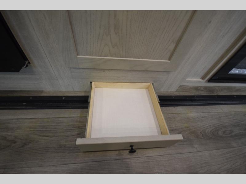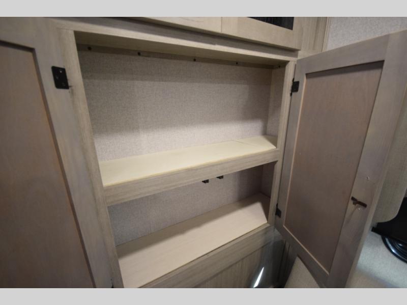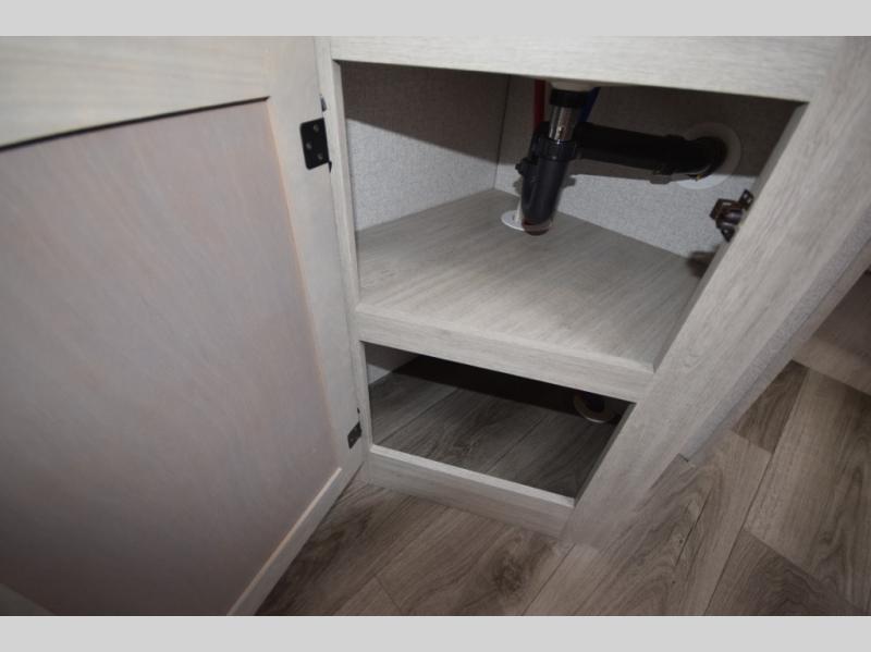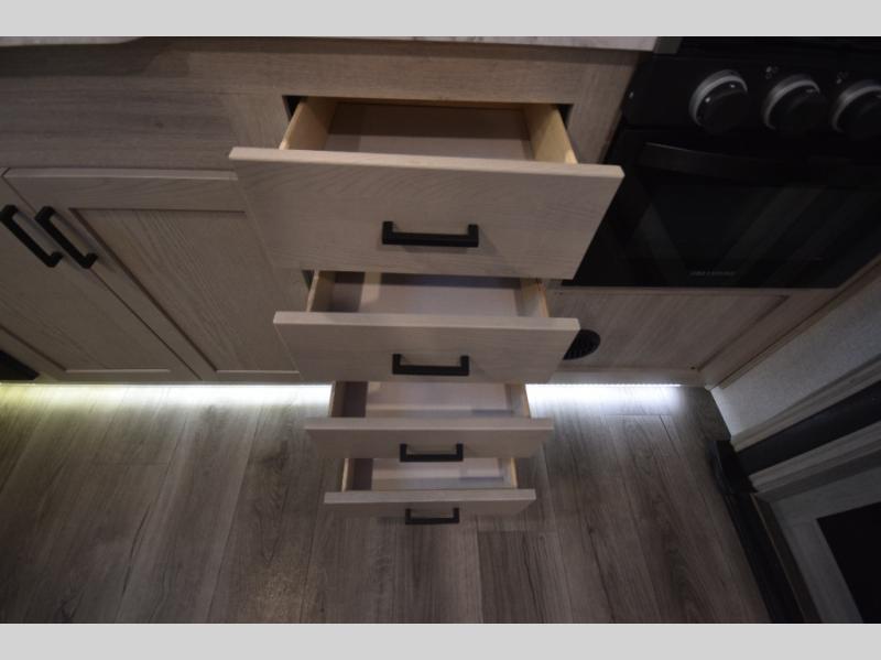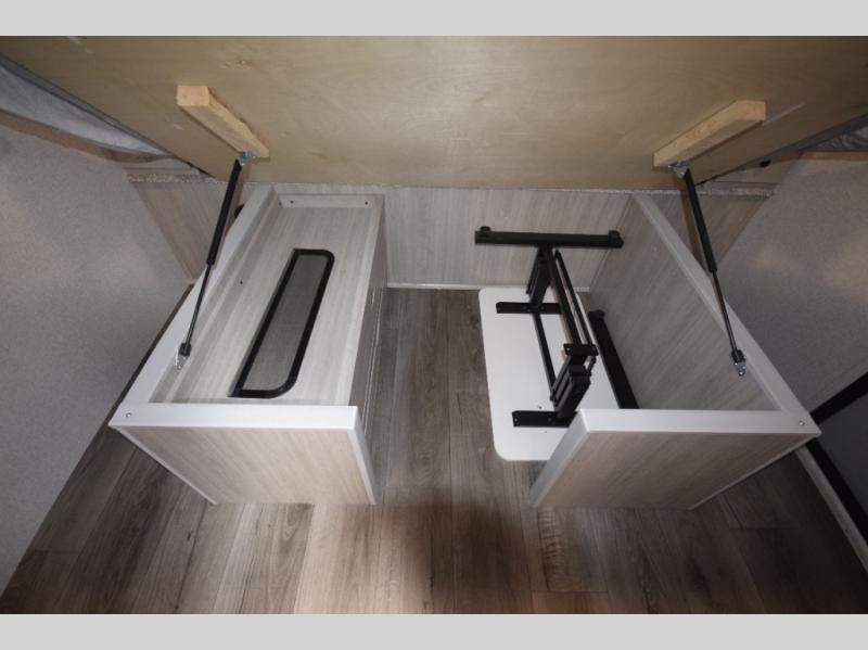 Start your mornings with fresh coffee and views out the large rear windows while prepping breakfast in the fully equipped kitchen, complete with a pantry, designer solid surface countertops, and ample counter space. At dinnertime, enjoy meals at the booth dinette—where you’ll also find hidden under-seat storage for extra gear or supplies.