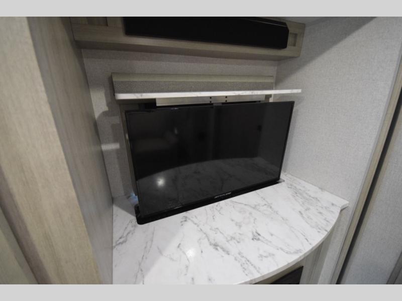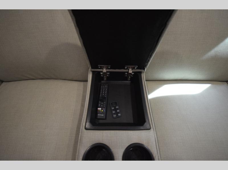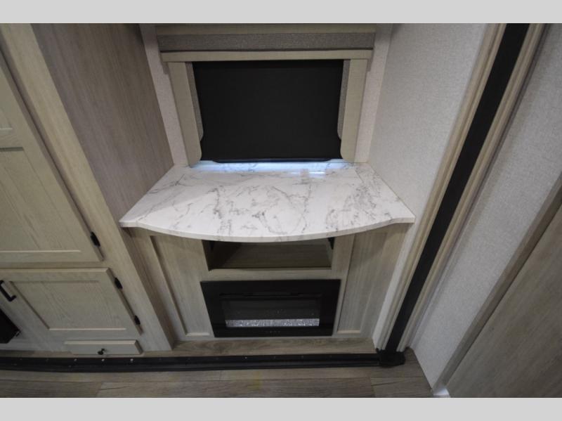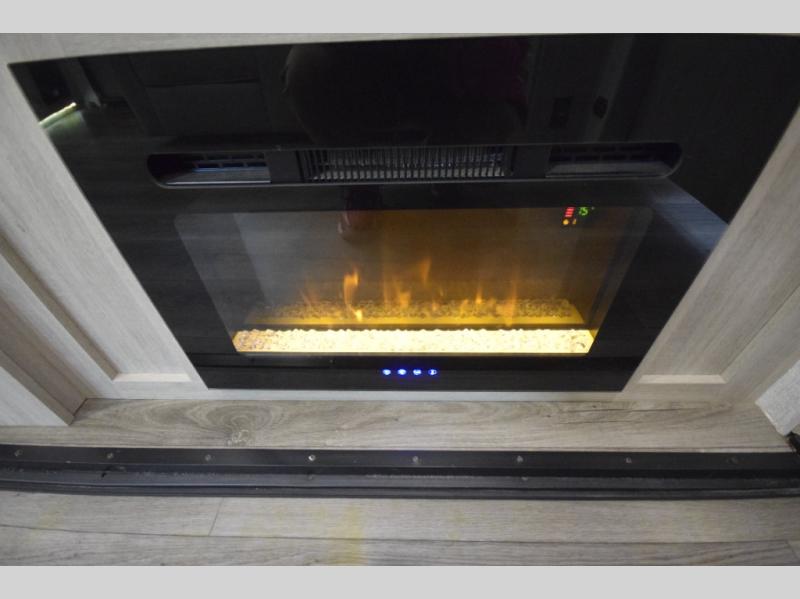 Unwind in the living area with a tri-fold sofa (or optional theater seating upgrade), all centered around a telescoping 40" TV and cozy fireplace—ideal for movie nights or relaxing after a day of exploring.