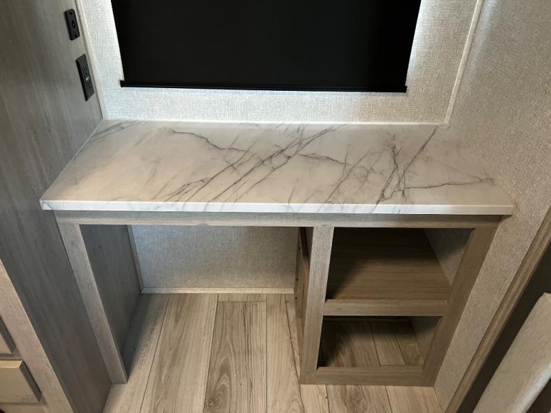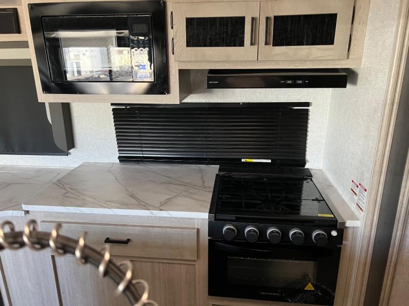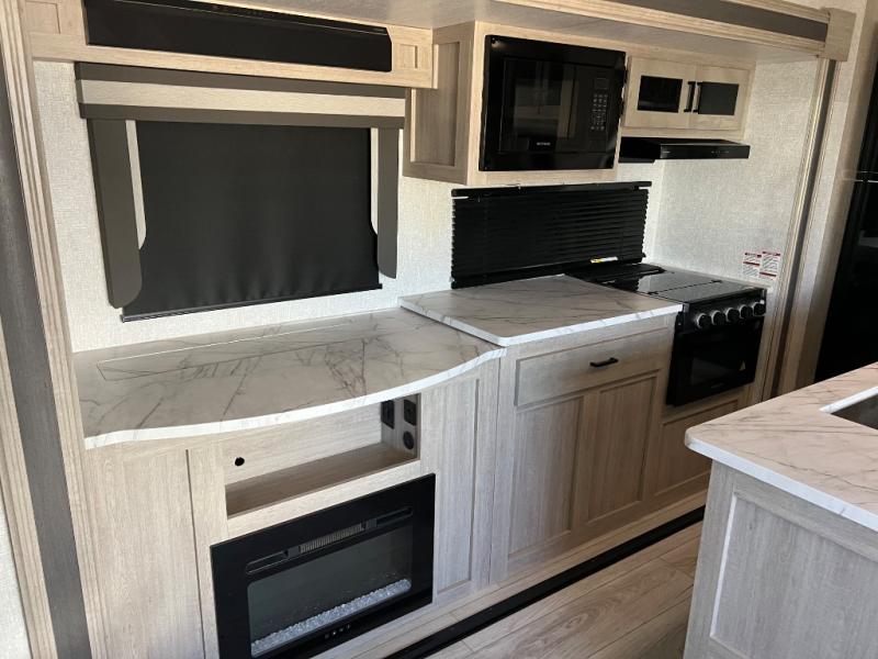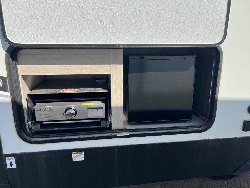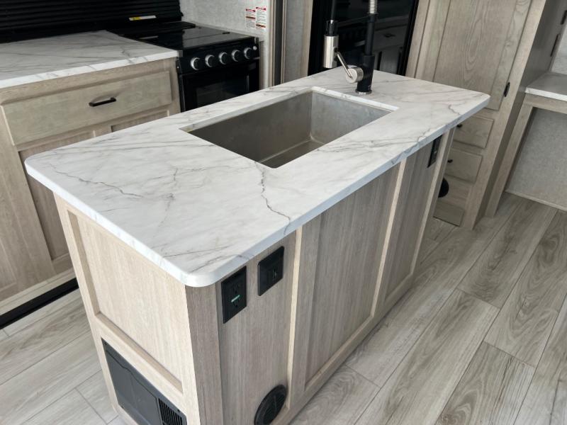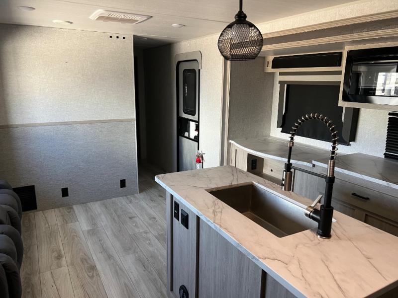 How does a king bed, a kitchen island, and an outdoor kitchen sound? You'll get all that and more in this spacious travel trailer. The dual opposing slides opens up the whole trailer, and the desk in the back will allow you to work while you're away from home. A three burner cooktop and microwave oven comes standard indoors, along with plenty of counter space and a pantry for snacks. Head outdoors to find the outside kitchen under the 21' power awning with LED lights, and when you're ready for bed the king bed will be waiting for you!