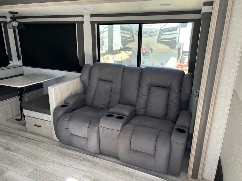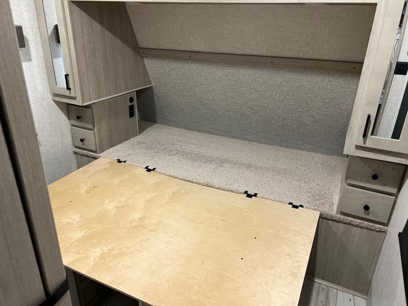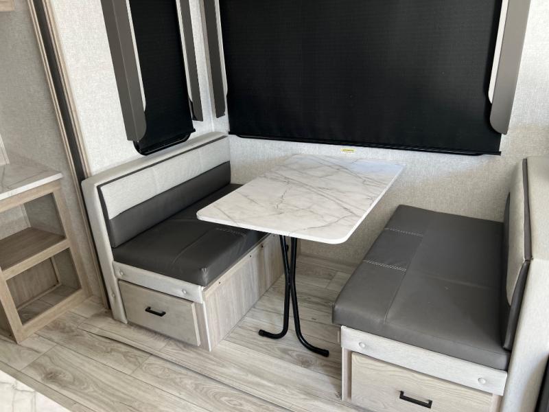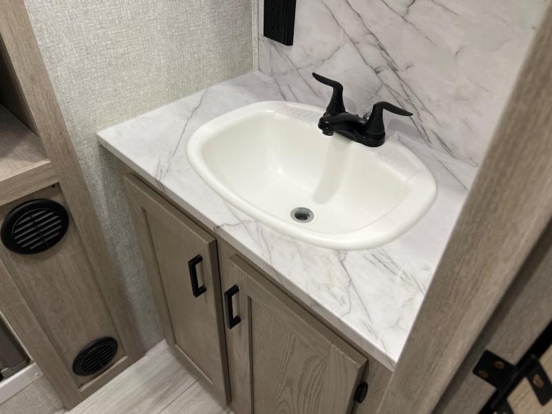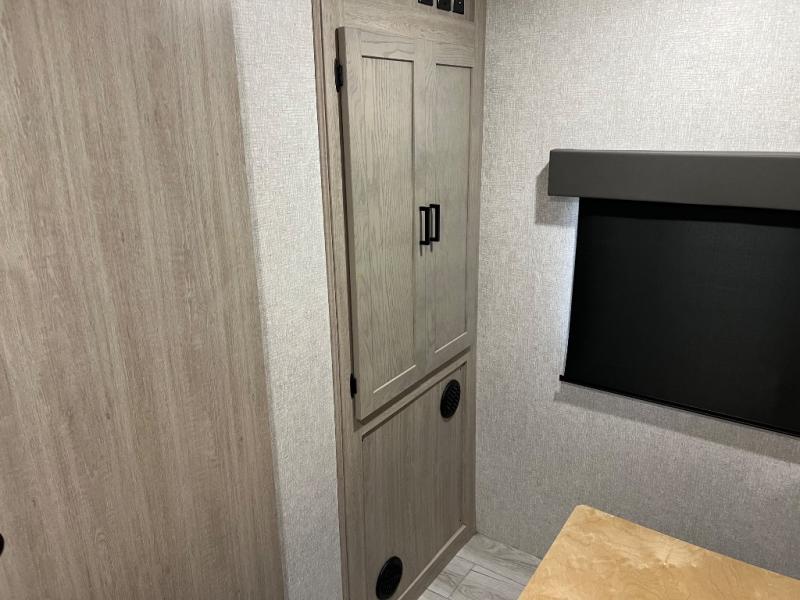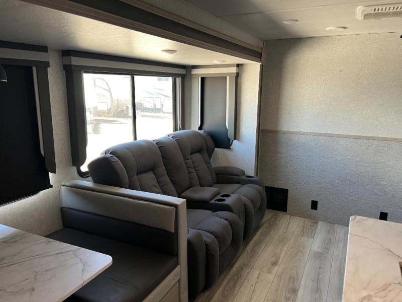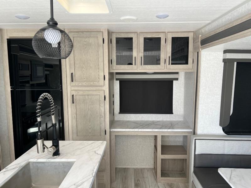 How does a king bed, a kitchen island, and an outdoor kitchen sound? You'll get all that and more in this spacious travel trailer. The dual opposing slides opens up the whole trailer, and the desk in the back will allow you to work while you're away from home. A three burner cooktop and microwave oven comes standard indoors, along with plenty of counter space and a pantry for snacks. Head outdoors to find the outside kitchen under the 21' power awning with LED lights, and when you're ready for bed the king bed will be waiting for you!