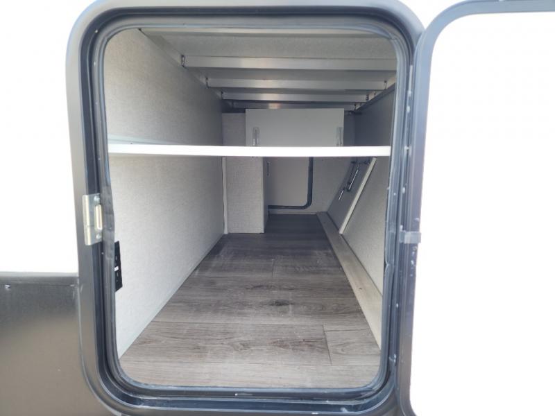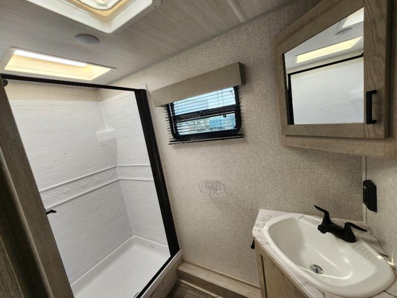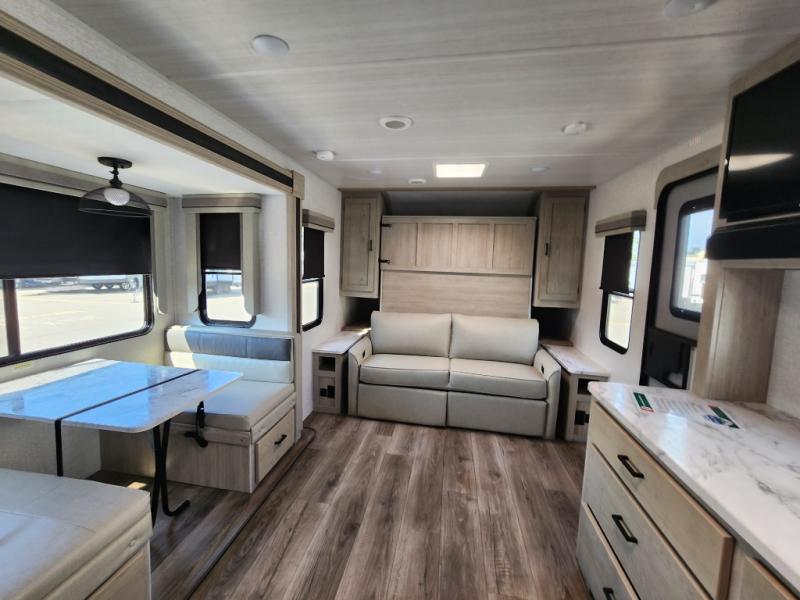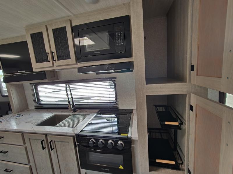 Double over double bunks are sure to be fun for everyone! With a queen Murphy bed that can be hidden away during the day, this travel trailer is versatile. A center kitchen with three-burner cooktop, refrigerator, and pantry will make cooking easy, and the booth dinette is a great choice, or you can exchange it for the optional free-standing dinette. A rear bath has a linen closet for towel storage, and the shower skylight lets the light in. Outside you'll find a whole other set of features, like a outside kitchen, TV hookup, and a storage door that is large enough for bikes or kayaks. Perfect for the outdoor adventure you've been craving!