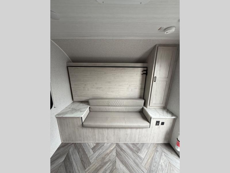 This versatile Della Terra LE model features a 74" x 60" queen Murphy bed that stores away during the daytime hours providing you with a sofa in its place for seating. There is a booth dinette with storage beneath the seats to accommodate everyone for a meal, or to gather for a game of cards. You will appreciate the rear bath featuring a 24" x 40" walk-in shower, toilet, vanity/sink with medicine cabinet, and large wardrobe for your hanging clothes. The kitchen allows you to cook while you travel inside with a refrigerator, two burner range with glass top, and overhead microwave oven. A single sink and overhead cabinetry will allow you to wash dishes and put them away neatly until their next use. A 13' awning outside offers an added living space protected from the sun and rain. and your camp chairs and outside equipment and games can be neatly tucked away in the large pass-through storage up front. An outside shower in back allows you to easily rinse off camp gear before storing as well.
