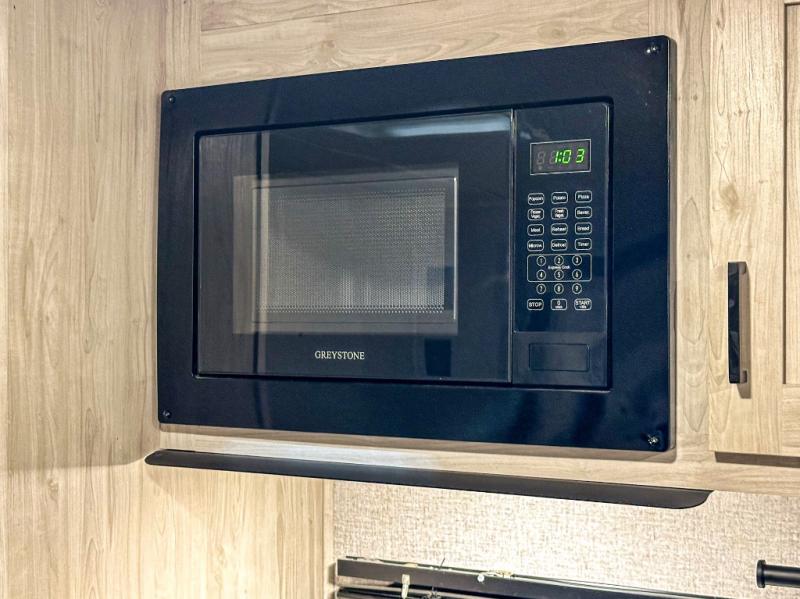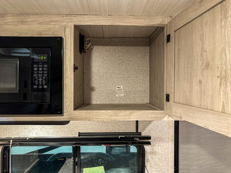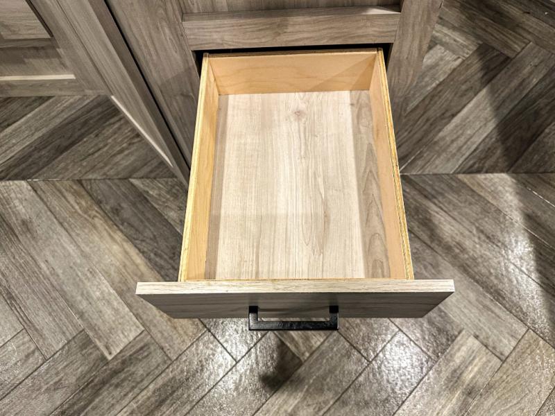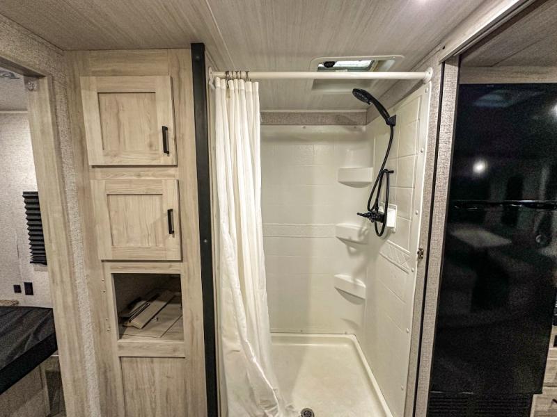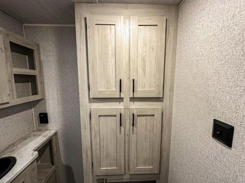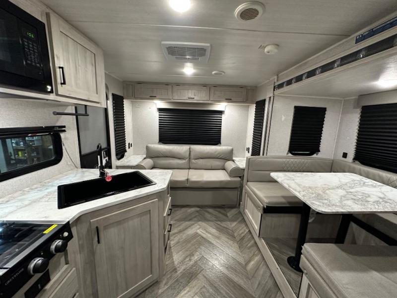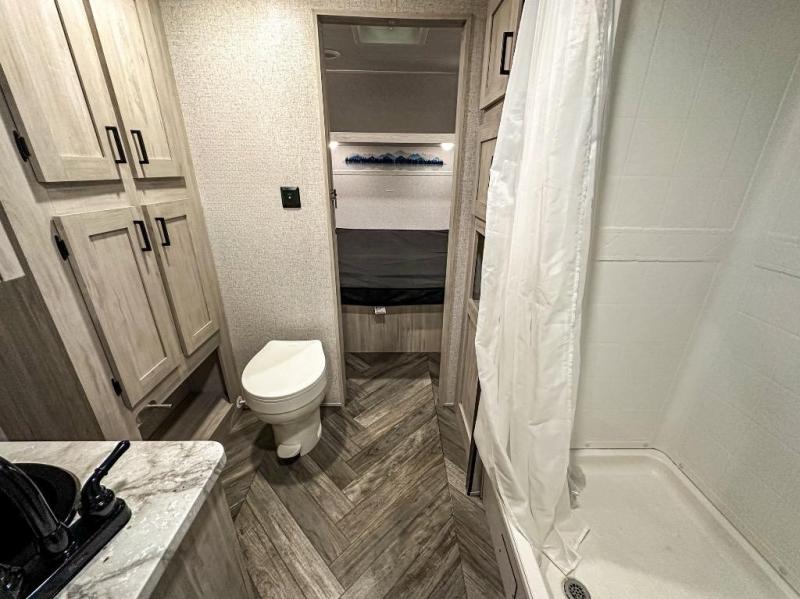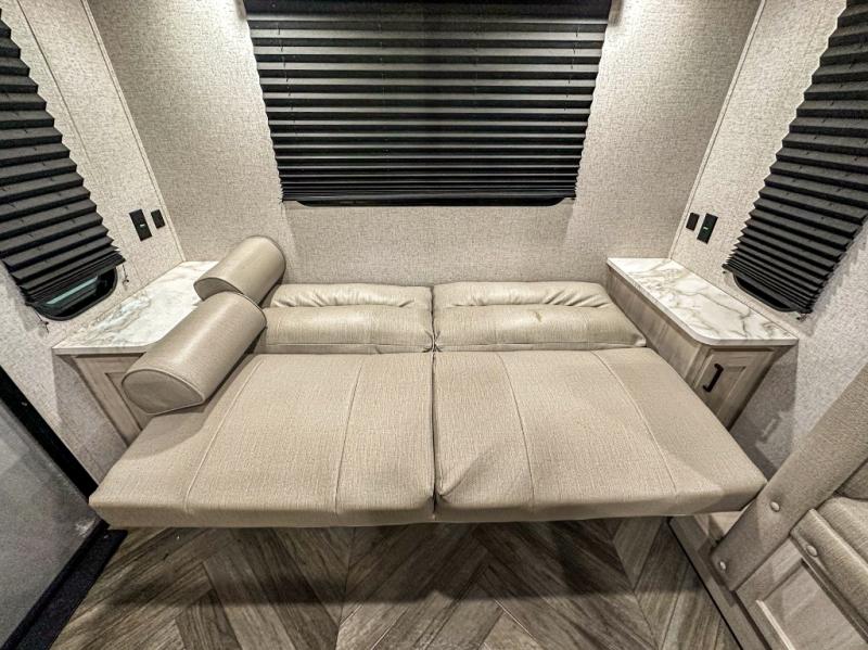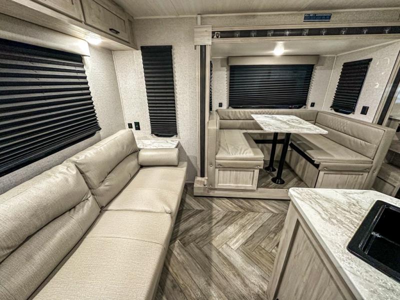 A perfect Della Terra LE model for six! There is plenty of seating inside with a large u-shaped dinette slide and a jackknife sofa. The slide allows more walking around space, and there is ample storage beneath both, as well as in overhead cabinets throughout. A spacious kitchen features an angled counter with large sink, plus a two burner stove with glass top to create more counterspace when you are not cooking. A walk-through bath offers a spacious area to get cleaned up featuring a walk-in shower on one side and a toilet with vanity and sink on the other side. Space saving sliding doors make it easily accessible. In front, a private king bed with dual nightstands and wardrobes, plus storage beneath the bed and in overhead cabinets as well. There is a hookup for the TV here as well as another in the living room at the entertainment center so you can enjoy movies and television when inside if you choose to add in either location. A front pass-through storage space provides plenty of room to stow away fishing poles, outdoor games, rugs and outdoor equipment, and so much more!