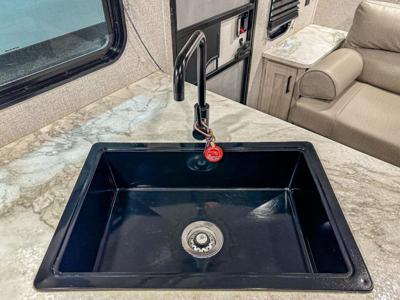 With any Della Terra travel trailers by EAST TO WEST, there is aluminum siding, bowed truss roof rafters, a one-piece seamless DiFlex ll roof, fiberglass insulation throughout, and a fully enclosed and heated underbelly with anti-puncture underbelly allowing you to stay and travel during any climate. The LE Edition value package will provide your family with USA manufactured furniture, seamless countertops (no T-mold), a solid entrance step at the main door, an outside hot and cold shower, plus an 11 cu. ft. dual hinge black glass frost free 12 volt refrigerator for your perishables. A Solera power awning with adjustable legs and LED light strip will also provide you with a great outdoor living area protected from both the sun and rain.