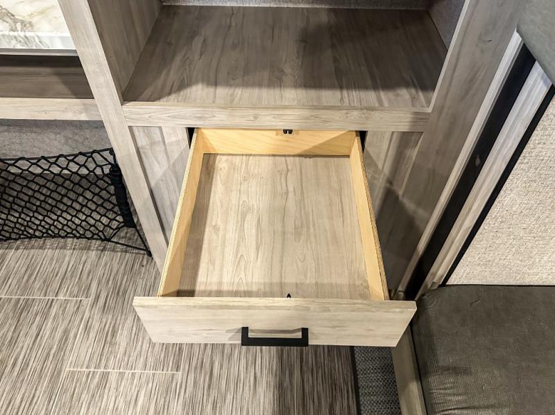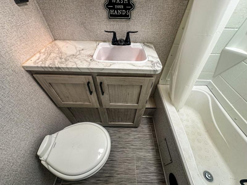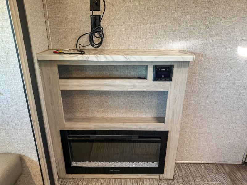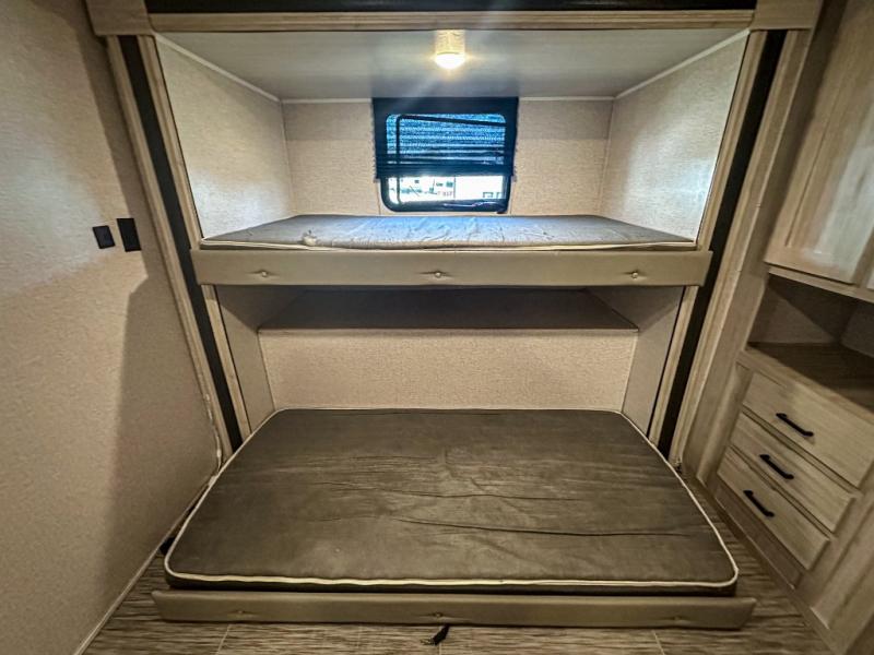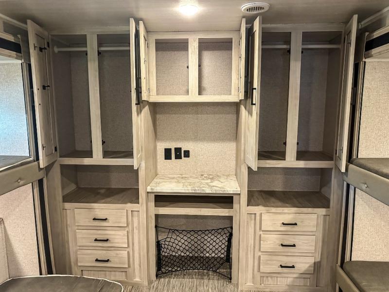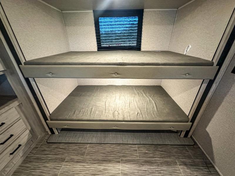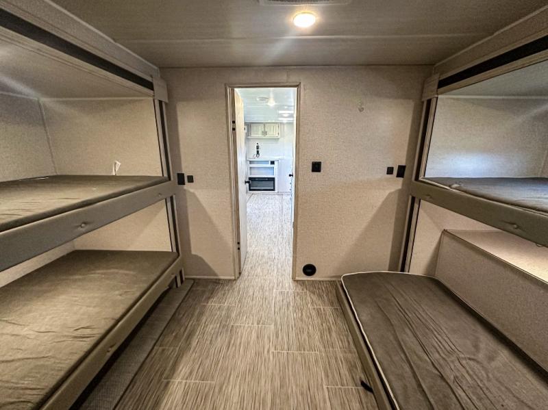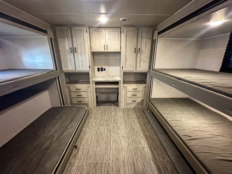 Yep, you have found it! This bunkhouse trailer will wow you every time you take it out of storage. With dual slides in the private bunkhouse that offers four bunks, and along the rear wall there is a desk, an entertainment center and dual wardrobes, your kids or guests may never come out. No worries, you will sleep on your own king-size bed on the opposite side of the trailer. The main living and kitchen combined room has the third slide giving this area more floor space as well, and the furniture provides extra sleeping space. There is a full bathroom to stay refreshed including a shower/tub, and full kitchen amenities including a stainless steel refrigerator, and there is an optional outdoor kitchen if you would like that feature added. There is more, step inside!
